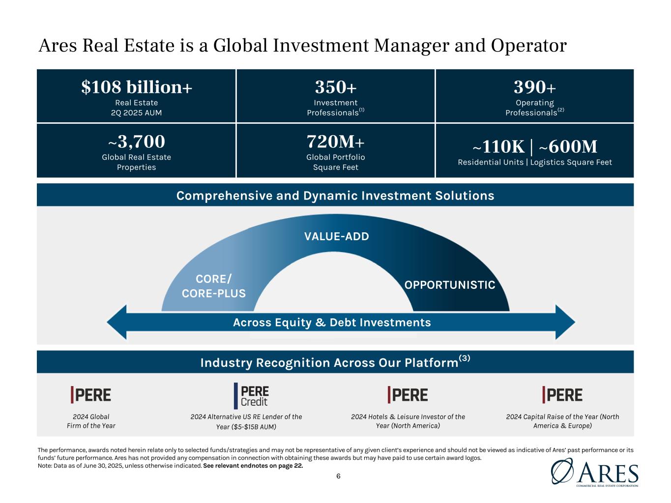 アレス・コマーシャル・リアルエステート・コーポレーション(以下「当社」)は、主に商業用不動産ローンおよび関連投資の直接組成・投資に携わるスペシャリティ・ファイナンス会社である。全国的な直接オリジネーション・プラットフォームを通じて、当社は商業用不動産の所有者や運営者に柔軟で信頼性の高い資金調達ソリューションを幅広く提供している。当社は、シニア・モーゲージ・ローンのほか、劣後ローン、メザニン債、優先株式も組成し、全米の流動性の高い市場に立地する様々な不動産に付加価値の高い資金を提供することに重点を置いている。アレス・コマーシャル・リアル・エステート・コーポレーションは不動産投資信託として課税されることを選択し、資格を取得しました。詳細はwww.arescre.com。当該ウェブサイトの内容は、参照することによりここに組み込まれるものではなく、またそのようにみなされるべきものでもありません。