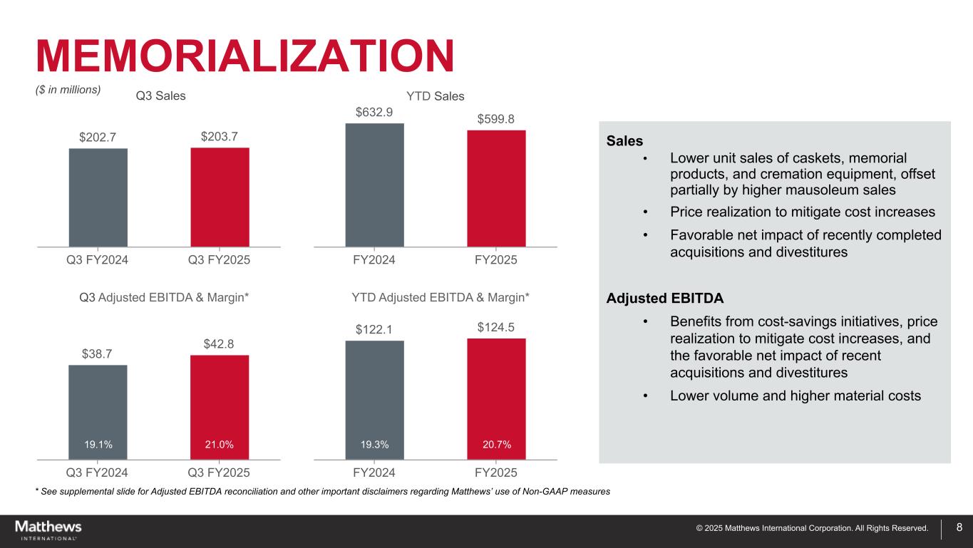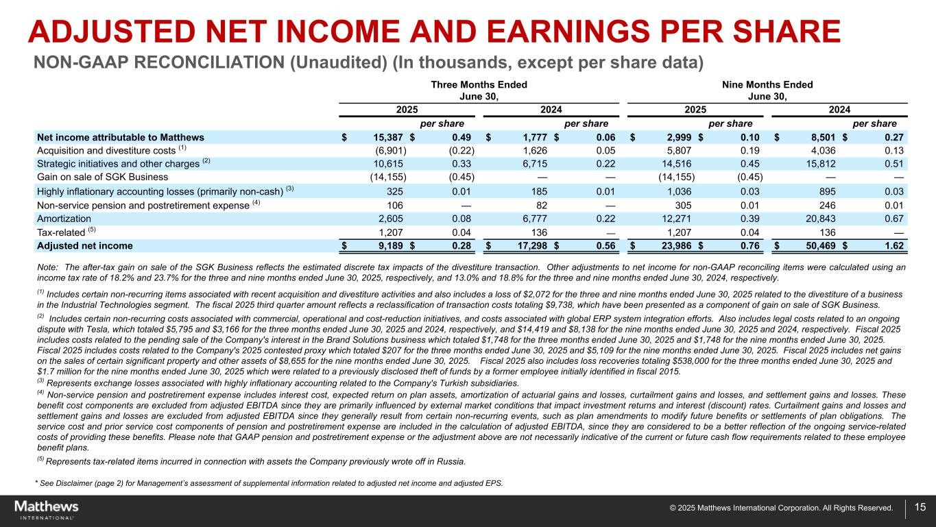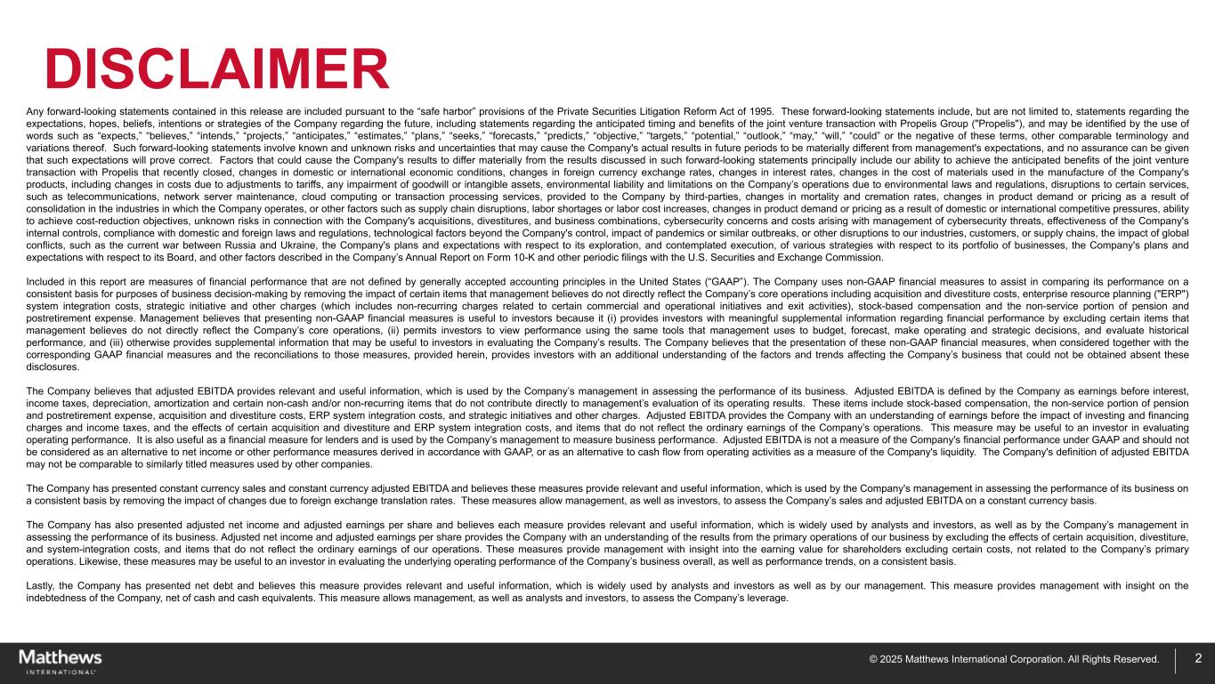 ペンシルベニア州ピッツバーグ、2025年8月5日-マシューズ・インターナショナル・コーポレーション(NASDAQ GSM:MATW)は本日、2025年度第3四半期の決算を発表した。