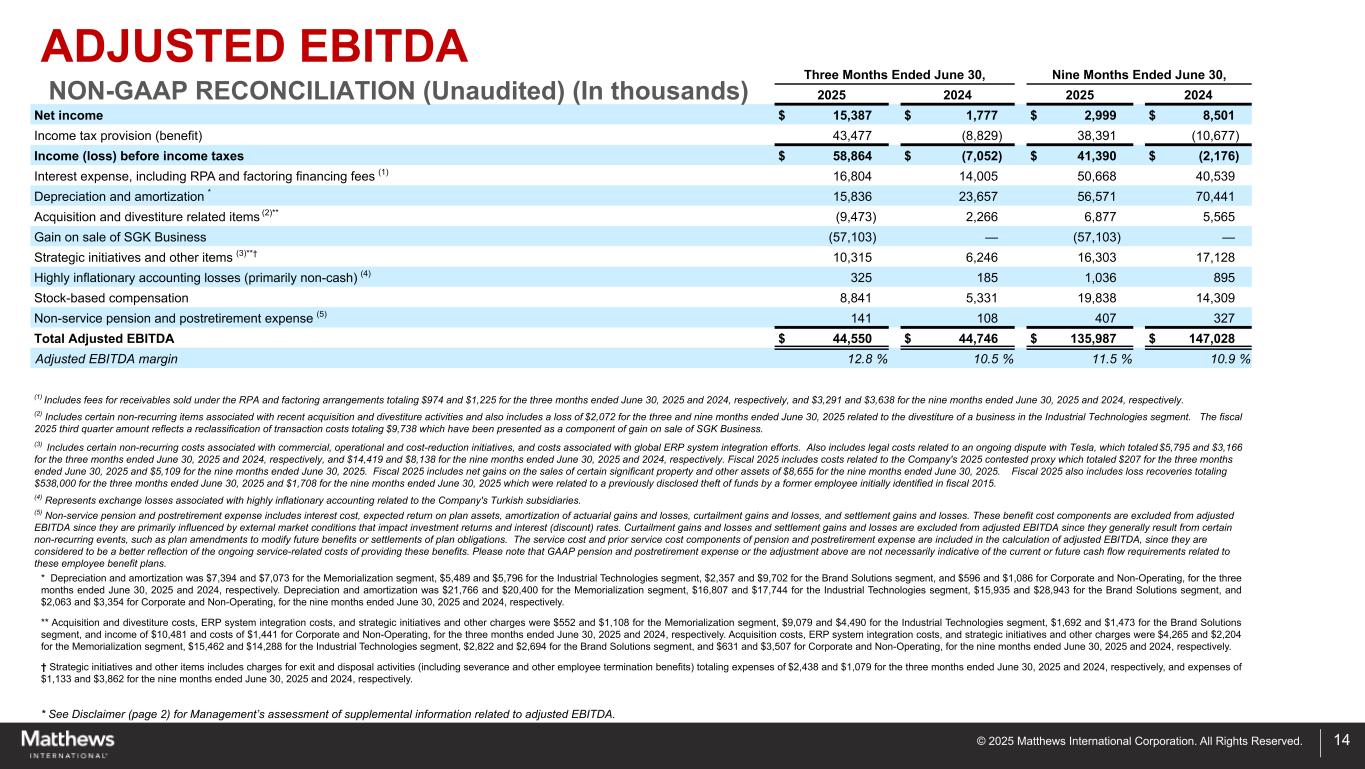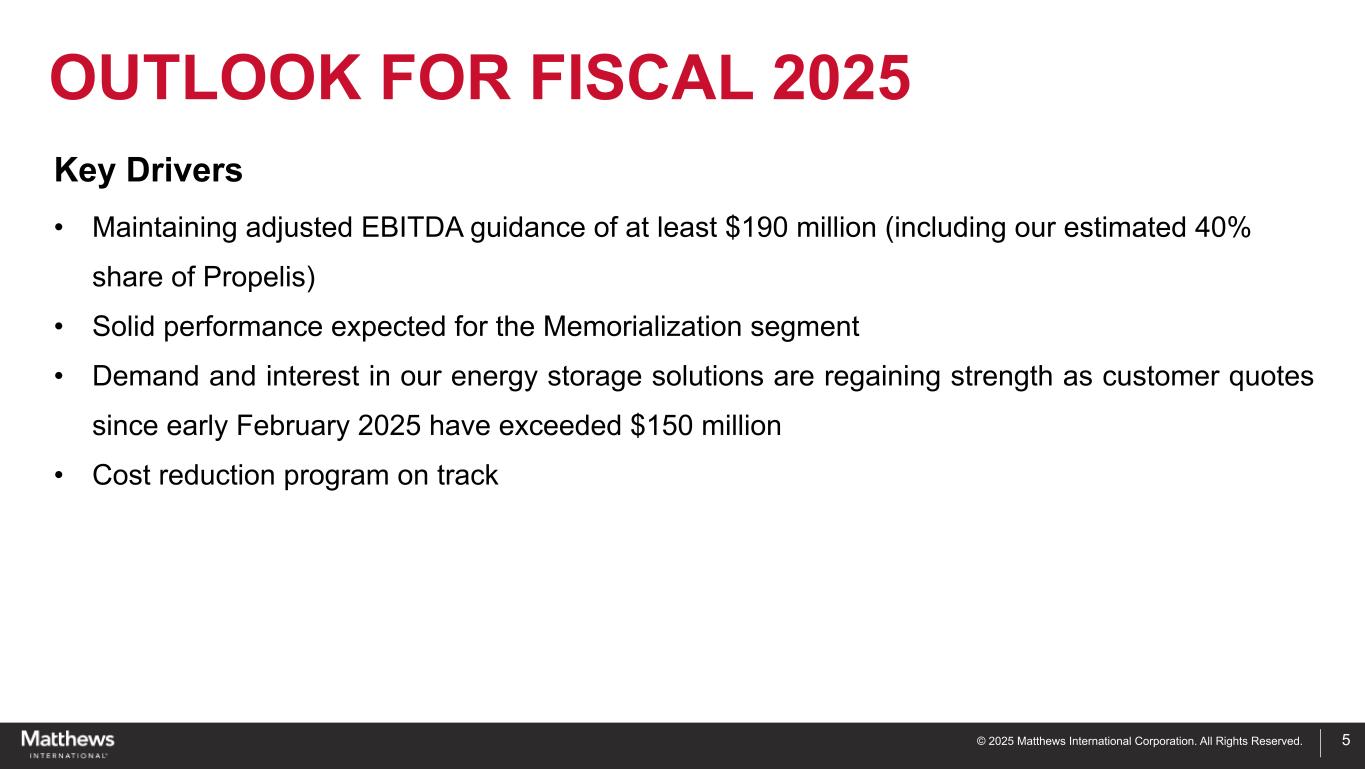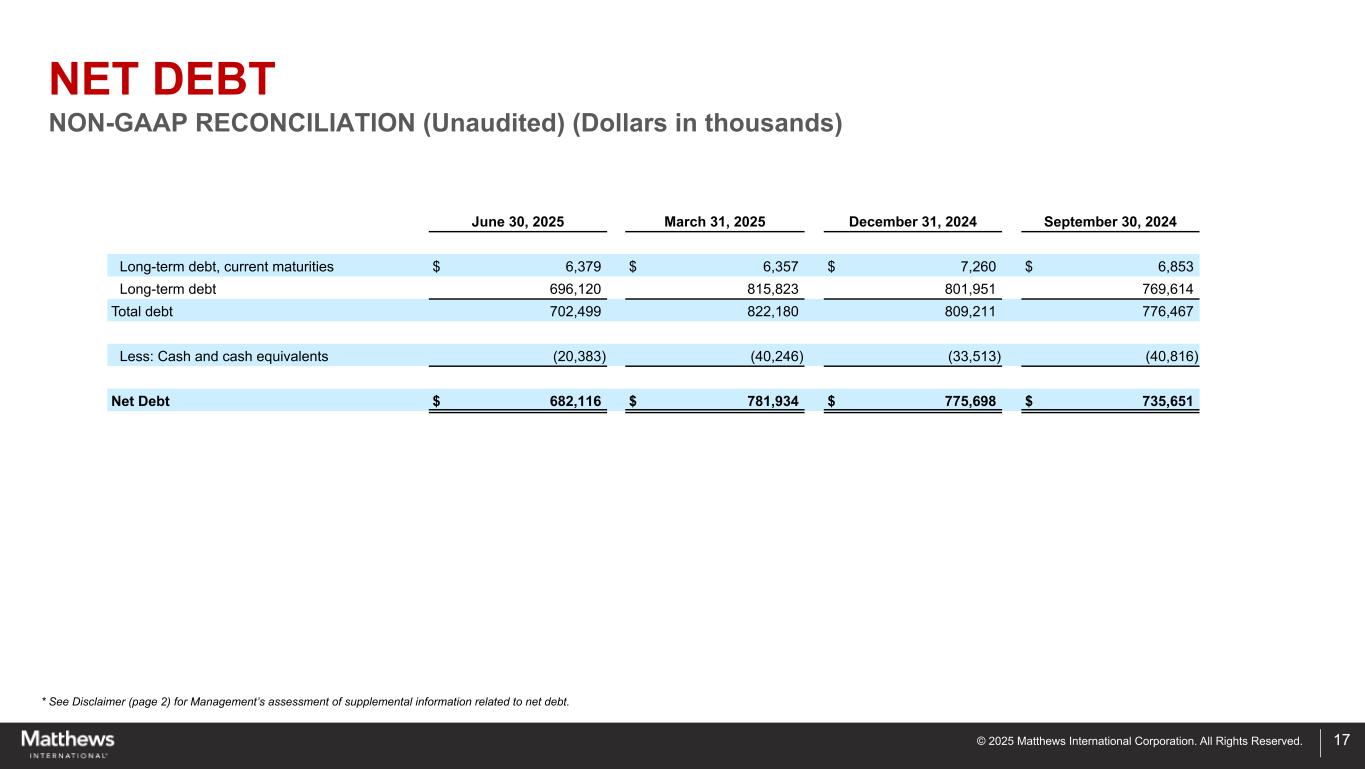 ペンシルベニア州ピッツバーグ、2025年8月5日-マシューズ・インターナショナル・コーポレーション(NASDAQ GSM:MATW)は本日、2025年度第3四半期の決算を発表した。