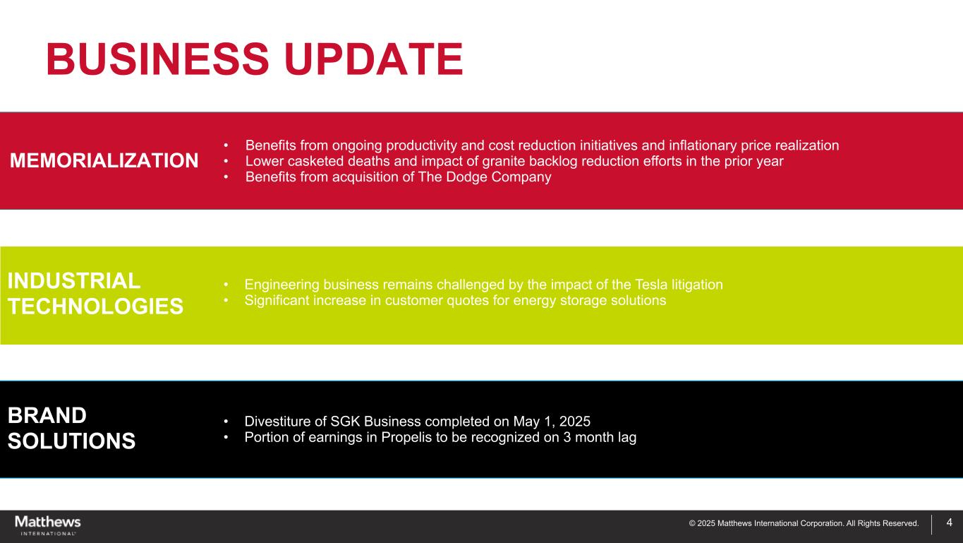 「2025 年度第 3 四半期の営業成績には満足している。GAAP基準の1株当たり利益は、前年同期の0.06ドルに対し、当四半期は0.49ドルを計上しました。SGK事業の売却益を計上しました。また、メモリアル事業と産業機器事業では、それぞれ調整後EBITDAが前年同期比で増加した一方、全社費用およびその他の営業外費用の削減を継続しました。当四半期の非GAAPベースの調整後1株当たり利益は0.28ドルでした。