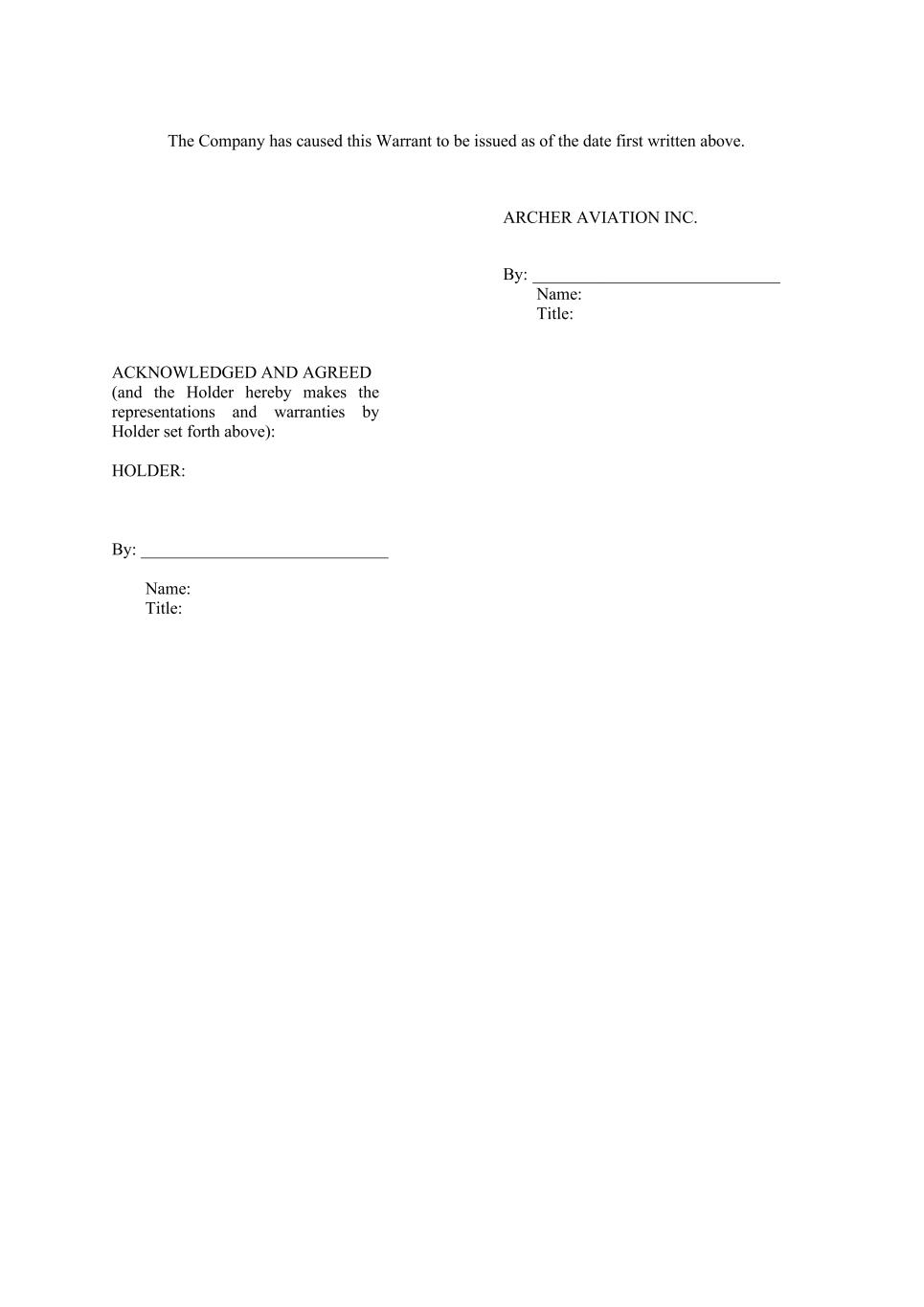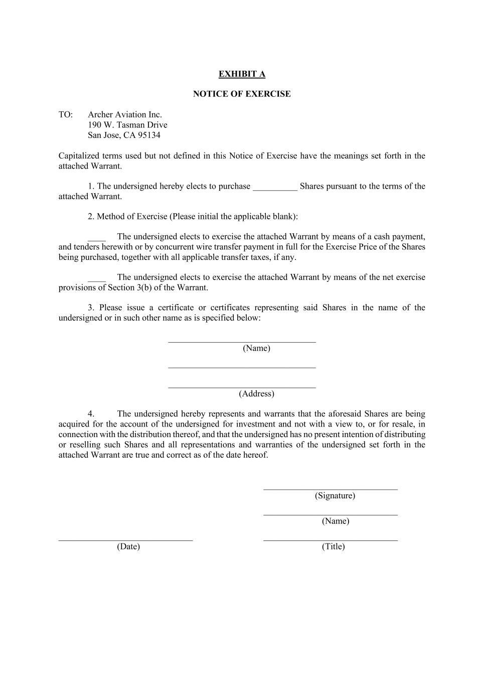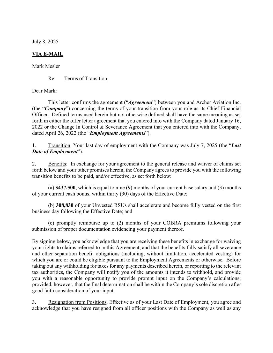 July 8, 2025 VIA E-MAIL Mark Mesler Re: Terms of Transition Dear Mark: This letter confirms the agreement (“Agreement”) between you and Archer Aviation Inc. (the “Company”) concerning the terms of your transition from your role as its Chief Financial Officer. Defined terms used herein but not otherwise defined shall have the same meaning as set forth in either the offer letter agreement that you entered into with the Company dated January 16, 2022 or the Change In Control & Severance Agreement that you entered into with the Company, dated April 26, 2022 (the “Employment Agreements”). 1. Transition. Your last day of employment with the Company was July 7, 2025 (the “Last Date of Employment”). 2. Benefits: In exchange for your agreement to the general release and waiver of claims set forth below and your other promises herein, the Company agrees to provide you with the following transition benefits to be paid, and/or effective, as set forth below: (a) $437,500, which is equal to nine (9) months of your current base salary and (3) months of your current cash bonus, within thirty (30) days of the Effective Date; (b) 308,830 of your Unvested RSUs shall accelerate and become fully vested on the first business day following the Effective Date; and (c) promptly reimburse up to (2) months of your COBRA premiums following your submission of proper documentation evidencing your payment thereof. By signing below, you acknowledge that you are receiving these benefits in exchange for waiving your rights to claims referred to in this Agreement, and that the benefits fully satisfy all severance and other separation benefit obligations (including, without limitation, accelerated vesting) for which you are or could be eligible pursuant to the Employment Agreements or otherwise. Before taking out any withholding for taxes for any payments described herein, or reporting to the relevant tax authorities, the Company will notify you of the amounts it intends to withhold, and provide you with a reasonable opportunity to provide prompt input on the Company’s calculations; provided, however, that the final determination shall be within the Company’s sole discretion after good faith consideration of your input. 3. Resignation from Positions. Effective as of your Last Date of Employment, you agree and acknowledge that you have resigned from all officer positions with the Company as well as any