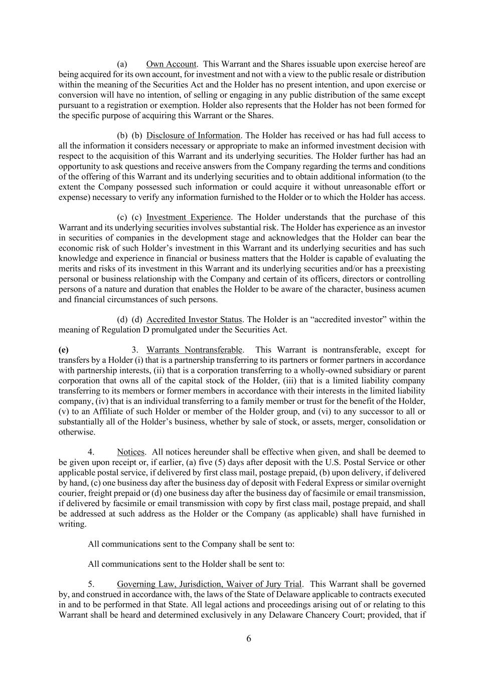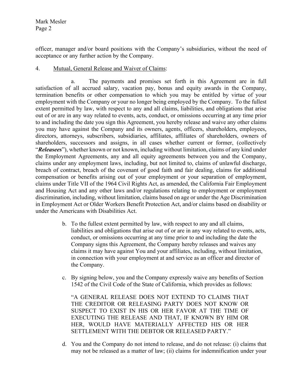 Mark Mesler Page 2 officer, manager and/or board positions with the Company’s subsidiaries, without the need of acceptance or any further action by the Company. 4. Mutual, General Release and Waiver of Claims: a. The payments and promises set forth in this Agreement are in full satisfaction of all accrued salary, vacation pay, bonus and equity awards in the Company, termination benefits or other compensation to which you may be entitled by virtue of your employment with the Company or your no longer being employed by the Company. To the fullest extent permitted by law, with respect to any and all claims, liabilities, and obligations that arise out of or are in any way related to events, acts, conduct, or omissions occurring at any time prior to and including the date you sign this Agreement, you hereby release and waive any other claims you may have against the Company and its owners, agents, officers, shareholders, employees, directors, attorneys, subscribers, subsidiaries, affiliates, affiliates of shareholders, owners of shareholders, successors and assigns, in all cases whether current or former, (collectively “Releasees”), whether known or not known, including without limitation, claims of any kind under the Employment Agreements, any and all equity agreements between you and the Company, claims under any employment laws, including, but not limited to, claims of unlawful discharge, breach of contract, breach of the covenant of good faith and fair dealing, claims for additional compensation or benefits arising out of your employment or your separation of employment, claims under Title VII of the 1964 Civil Rights Act, as amended, the California Fair Employment and Housing Act and any other laws and/or regulations relating to employment or employment discrimination, including, without limitation, claims based on age or under the Age Discrimination in Employment Act or Older Workers Benefit Protection Act, and/or claims based on disability or under the Americans with Disabilities Act. b. To the fullest extent permitted by law, with respect to any and all claims, liabilities and obligations that arise out of or are in any way related to events, acts, conduct, or omissions occurring at any time prior to and including the date the Company signs this Agreement, the Company hereby releases and waives any claims it may have against You and your affiliates, including, without limitation, in connection with your employment at and service as an officer and director of the Company. c. By signing below, you and the Company expressly waive any benefits of Section 1542 of the Civil Code of the State of California, which provides as follows: “A GENERAL RELEASE DOES NOT EXTEND TO CLAIMS THAT THE CREDITOR OR RELEASING PARTY DOES NOT KNOW OR SUSPECT TO EXIST IN HIS OR HER FAVOR AT THE TIME OF EXECUTING THE RELEASE AND THAT, IF KNOWN BY HIM OR HER, WOULD HAVE MATERIALLY AFFECTED HIS OR HER SETTLEMENT WITH THE DEBTOR OR RELEASED PARTY.” d. You and the Company do not intend to release, and do not release: (i) claims that may not be released as a matter of law; (ii) claims for indemnification under your