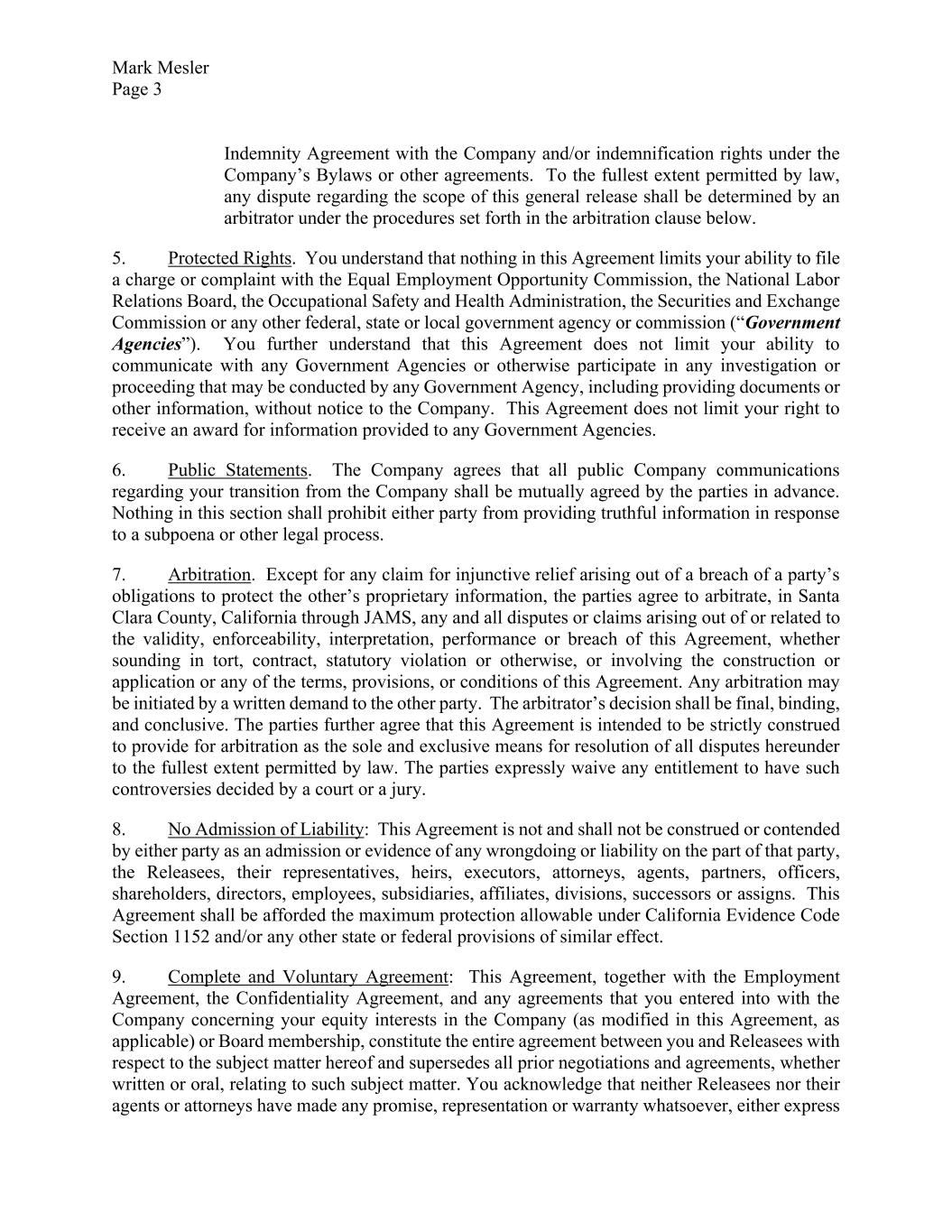 Mark Mesler Page 3 Indemnity Agreement with the Company and/or indemnification rights under the Company’s Bylaws or other agreements. To the fullest extent permitted by law, any dispute regarding the scope of this general release shall be determined by an arbitrator under the procedures set forth in the arbitration clause below. 5. Protected Rights. You understand that nothing in this Agreement limits your ability to file a charge or complaint with the Equal Employment Opportunity Commission, the National Labor Relations Board, the Occupational Safety and Health Administration, the Securities and Exchange Commission or any other federal, state or local government agency or commission (“Government Agencies”). You further understand that this Agreement does not limit your ability to communicate with any Government Agencies or otherwise participate in any investigation or proceeding that may be conducted by any Government Agency, including providing documents or other information, without notice to the Company. This Agreement does not limit your right to receive an award for information provided to any Government Agencies. 6. Public Statements. The Company agrees that all public Company communications regarding your transition from the Company shall be mutually agreed by the parties in advance. Nothing in this section shall prohibit either party from providing truthful information in response to a subpoena or other legal process. 7. Arbitration. Except for any claim for injunctive relief arising out of a breach of a party’s obligations to protect the other’s proprietary information, the parties agree to arbitrate, in Santa Clara County, California through JAMS, any and all disputes or claims arising out of or related to the validity, enforceability, interpretation, performance or breach of this Agreement, whether sounding in tort, contract, statutory violation or otherwise, or involving the construction or application or any of the terms, provisions, or conditions of this Agreement. Any arbitration may be initiated by a written demand to the other party. The arbitrator’s decision shall be final, binding, and conclusive. The parties further agree that this Agreement is intended to be strictly construed to provide for arbitration as the sole and exclusive means for resolution of all disputes hereunder to the fullest extent permitted by law. The parties expressly waive any entitlement to have such controversies decided by a court or a jury. 8. No Admission of Liability: This Agreement is not and shall not be construed or contended by either party as an admission or evidence of any wrongdoing or liability on the part of that party, the Releasees, their representatives, heirs, executors, attorneys, agents, partners, officers, shareholders, directors, employees, subsidiaries, affiliates, divisions, successors or assigns. This Agreement shall be afforded the maximum protection allowable under California Evidence Code Section 1152 and/or any other state or federal provisions of similar effect. 9. Complete and Voluntary Agreement: This Agreement, together with the Employment Agreement, the Confidentiality Agreement, and any agreements that you entered into with the Company concerning your equity interests in the Company (as modified in this Agreement, as applicable) or Board membership, constitute the entire agreement between you and Releasees with respect to the subject matter hereof and supersedes all prior negotiations and agreements, whether written or oral, relating to such subject matter. You acknowledge that neither Releasees nor their agents or attorneys have made any promise, representation or warranty whatsoever, either express