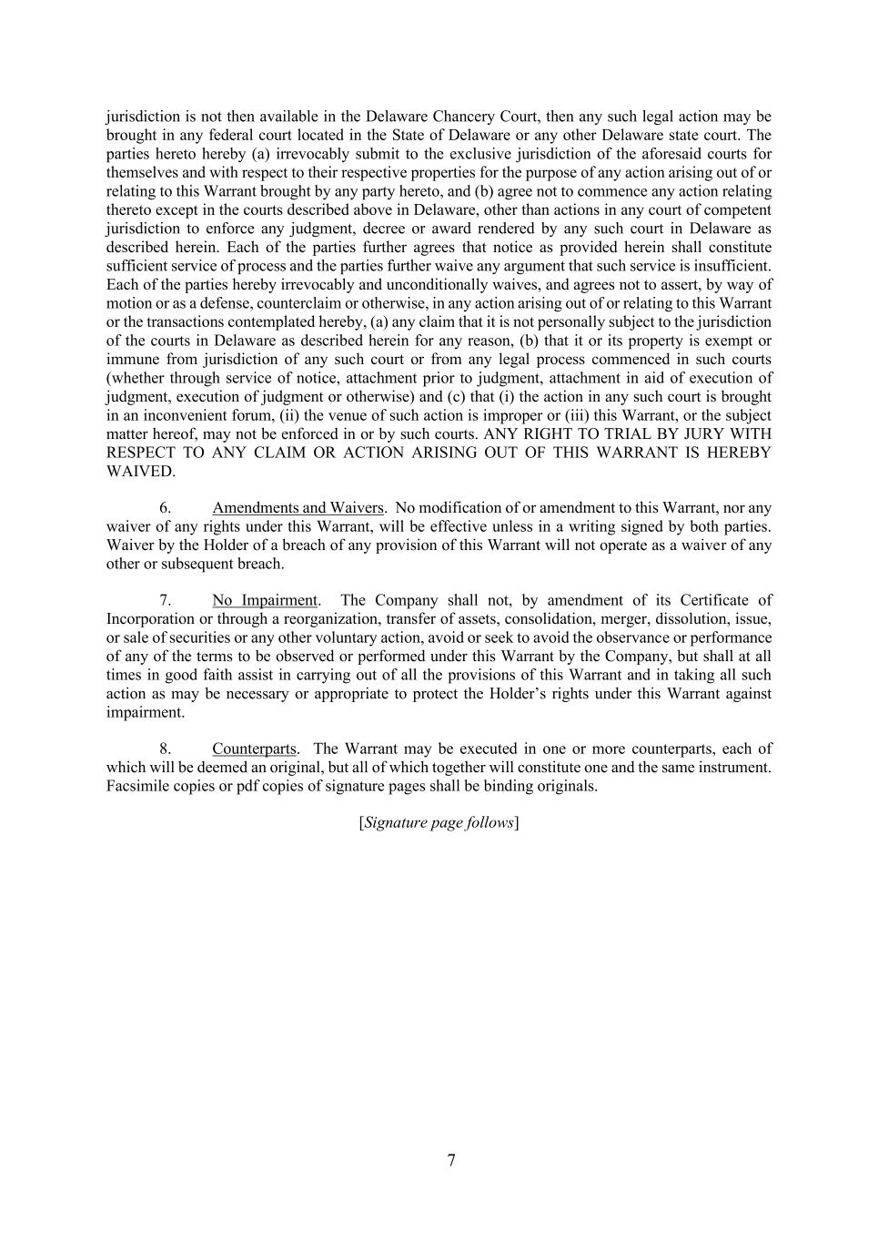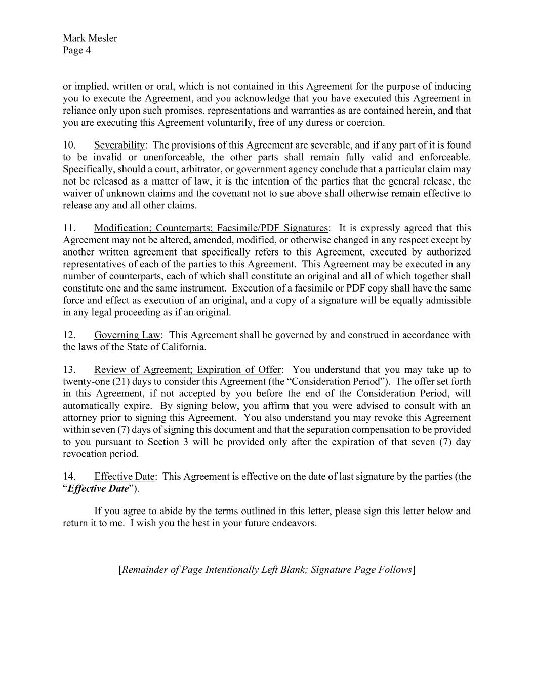 Mark Mesler Page 4 or implied, written or oral, which is not contained in this Agreement for the purpose of inducing you to execute the Agreement, and you acknowledge that you have executed this Agreement in reliance only upon such promises, representations and warranties as are contained herein, and that you are executing this Agreement voluntarily, free of any duress or coercion. 10. Severability: The provisions of this Agreement are severable, and if any part of it is found to be invalid or unenforceable, the other parts shall remain fully valid and enforceable. Specifically, should a court, arbitrator, or government agency conclude that a particular claim may not be released as a matter of law, it is the intention of the parties that the general release, the waiver of unknown claims and the covenant not to sue above shall otherwise remain effective to release any and all other claims. 11. Modification; Counterparts; Facsimile/PDF Signatures: It is expressly agreed that this Agreement may not be altered, amended, modified, or otherwise changed in any respect except by another written agreement that specifically refers to this Agreement, executed by authorized representatives of each of the parties to this Agreement. This Agreement may be executed in any number of counterparts, each of which shall constitute an original and all of which together shall constitute one and the same instrument. Execution of a facsimile or PDF copy shall have the same force and effect as execution of an original, and a copy of a signature will be equally admissible in any legal proceeding as if an original. 12. Governing Law: This Agreement shall be governed by and construed in accordance with the laws of the State of California. 13. Review of Agreement; Expiration of Offer: You understand that you may take up to twenty-one (21) days to consider this Agreement (the “Consideration Period”). The offer set forth in this Agreement, if not accepted by you before the end of the Consideration Period, will automatically expire. By signing below, you affirm that you were advised to consult with an attorney prior to signing this Agreement. You also understand you may revoke this Agreement within seven (7) days of signing this document and that the separation compensation to be provided to you pursuant to Section 3 will be provided only after the expiration of that seven (7) day revocation period. 14. Effective Date: This Agreement is effective on the date of last signature by the parties (the “Effective Date”). If you agree to abide by the terms outlined in this letter, please sign this letter below and return it to me. I wish you the best in your future endeavors. [Remainder of Page Intentionally Left Blank; Signature Page Follows]