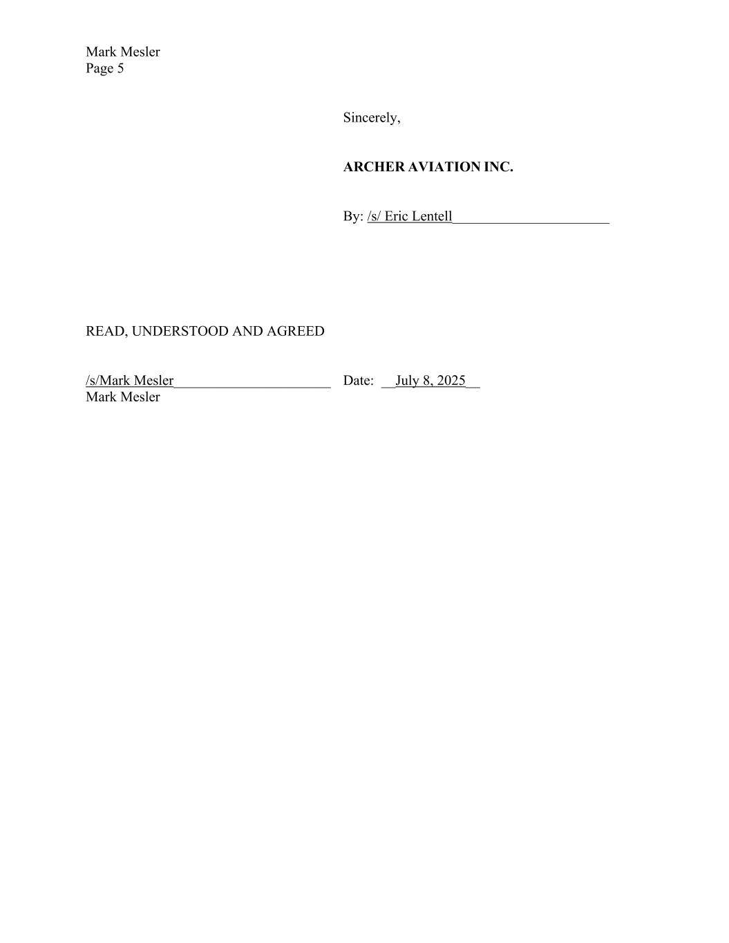 Mark Mesler Page 5 Sincerely, ARCHER AVIATION INC. By: /s/ Eric Lentell______________________ READ, UNDERSTOOD AND AGREED /s/Mark Mesler______________________ Date: __July 8, 2025__ Mark Mesler