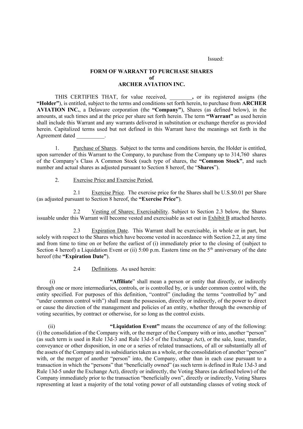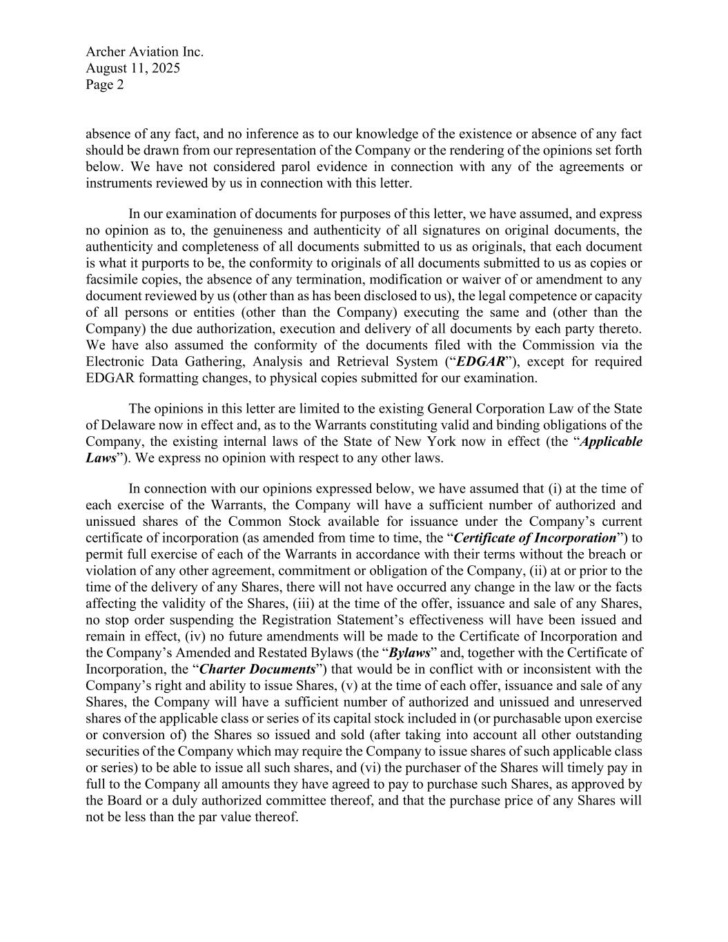 Archer Aviation Inc. August 11, 2025 Page 2 absence of any fact, and no inference as to our knowledge of the existence or absence of any fact should be drawn from our representation of the Company or the rendering of the opinions set forth below. We have not considered parol evidence in connection with any of the agreements or instruments reviewed by us in connection with this letter. In our examination of documents for purposes of this letter, we have assumed, and express no opinion as to, the genuineness and authenticity of all signatures on original documents, the authenticity and completeness of all documents submitted to us as originals, that each document is what it purports to be, the conformity to originals of all documents submitted to us as copies or facsimile copies, the absence of any termination, modification or waiver of or amendment to any document reviewed by us (other than as has been disclosed to us), the legal competence or capacity of all persons or entities (other than the Company) executing the same and (other than the Company) the due authorization, execution and delivery of all documents by each party thereto. We have also assumed the conformity of the documents filed with the Commission via the Electronic Data Gathering, Analysis and Retrieval System (“EDGAR”), except for required EDGAR formatting changes, to physical copies submitted for our examination. The opinions in this letter are limited to the existing General Corporation Law of the State of Delaware now in effect and, as to the Warrants constituting valid and binding obligations of the Company, the existing internal laws of the State of New York now in effect (the “Applicable Laws”). We express no opinion with respect to any other laws. In connection with our opinions expressed below, we have assumed that (i) at the time of each exercise of the Warrants, the Company will have a sufficient number of authorized and unissued shares of the Common Stock available for issuance under the Company’s current certificate of incorporation (as amended from time to time, the “Certificate of Incorporation”) to permit full exercise of each of the Warrants in accordance with their terms without the breach or violation of any other agreement, commitment or obligation of the Company, (ii) at or prior to the time of the delivery of any Shares, there will not have occurred any change in the law or the facts affecting the validity of the Shares, (iii) at the time of the offer, issuance and sale of any Shares, no stop order suspending the Registration Statement’s effectiveness will have been issued and remain in effect, (iv) no future amendments will be made to the Certificate of Incorporation and the Company’s Amended and Restated Bylaws (the “Bylaws” and, together with the Certificate of Incorporation, the “Charter Documents”) that would be in conflict with or inconsistent with the Company’s right and ability to issue Shares, (v) at the time of each offer, issuance and sale of any Shares, the Company will have a sufficient number of authorized and unissued and unreserved shares of the applicable class or series of its capital stock included in (or purchasable upon exercise or conversion of) the Shares so issued and sold (after taking into account all other outstanding securities of the Company which may require the Company to issue shares of such applicable class or series) to be able to issue all such shares, and (vi) the purchaser of the Shares will timely pay in full to the Company all amounts they have agreed to pay to purchase such Shares, as approved by the Board or a duly authorized committee thereof, and that the purchase price of any Shares will not be less than the par value thereof.