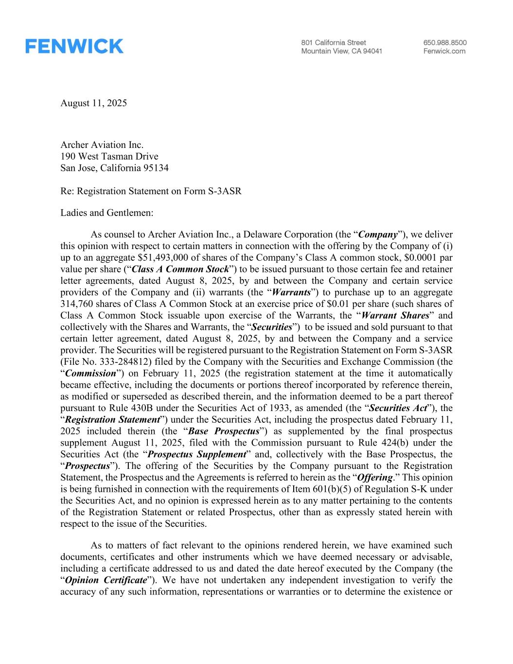 August 11, 2025 Archer Aviation Inc. 190 West Tasman Drive San Jose, California 95134 Re: Registration Statement on Form S-3ASR Ladies and Gentlemen: As counsel to Archer Aviation Inc., a Delaware Corporation (the “Company”), we deliver this opinion with respect to certain matters in connection with the offering by the Company of (i) up to an aggregate $51,493,000 of shares of the Company’s Class A common stock, $0.0001 par value per share (“Class A Common Stock”) to be issued pursuant to those certain fee and retainer letter agreements, dated August 8, 2025, by and between the Company and certain service providers of the Company and (ii) warrants (the “Warrants”) to purchase up to an aggregate 314,760 shares of Class A Common Stock at an exercise price of $0.01 per share (such shares of Class A Common Stock issuable upon exercise of the Warrants, the “Warrant Shares” and collectively with the Shares and Warrants, the “Securities”) to be issued and sold pursuant to that certain letter agreement, dated August 8, 2025, by and between the Company and a service provider. The Securities will be registered pursuant to the Registration Statement on Form S-3ASR (File No. 333-284812) filed by the Company with the Securities and Exchange Commission (the “Commission”) on February 11, 2025 (the registration statement at the time it automatically became effective, including the documents or portions thereof incorporated by reference therein, as modified or superseded as described therein, and the information deemed to be a part thereof pursuant to Rule 430B under the Securities Act of 1933, as amended (the “Securities Act”), the “Registration Statement”) under the Securities Act, including the prospectus dated February 11, 2025 included therein (the “Base Prospectus”) as supplemented by the final prospectus supplement August 11, 2025, filed with the Commission pursuant to Rule 424(b) under the Securities Act (the “Prospectus Supplement” and, collectively with the Base Prospectus, the “Prospectus”). The offering of the Securities by the Company pursuant to the Registration Statement, the Prospectus and the Agreements is referred to herein as the “Offering.” This opinion is being furnished in connection with the requirements of Item 601(b)(5) of Regulation S-K under the Securities Act, and no opinion is expressed herein as to any matter pertaining to the contents of the Registration Statement or related Prospectus, other than as expressly stated herein with respect to the issue of the Securities. As to matters of fact relevant to the opinions rendered herein, we have examined such documents, certificates and other instruments which we have deemed necessary or advisable, including a certificate addressed to us and dated the date hereof executed by the Company (the “Opinion Certificate”). We have not undertaken any independent investigation to verify the accuracy of any such information, representations or warranties or to determine the existence or
