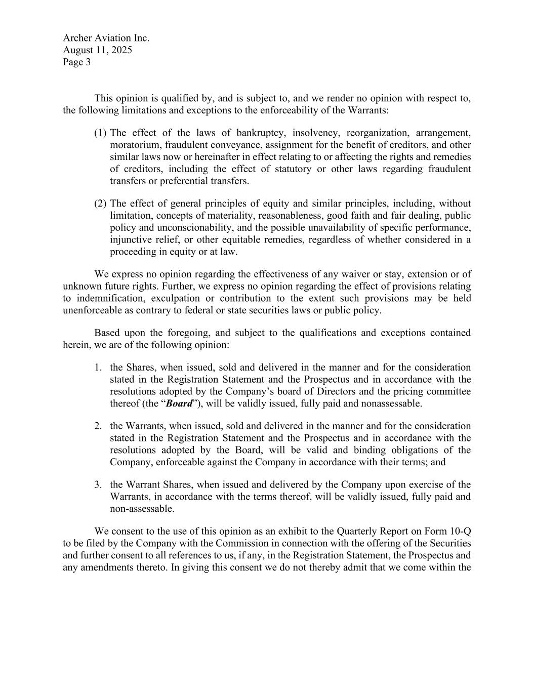 Archer Aviation Inc. August 11, 2025 Page 3 This opinion is qualified by, and is subject to, and we render no opinion with respect to, the following limitations and exceptions to the enforceability of the Warrants: (1) The effect of the laws of bankruptcy, insolvency, reorganization, arrangement, moratorium, fraudulent conveyance, assignment for the benefit of creditors, and other similar laws now or hereinafter in effect relating to or affecting the rights and remedies of creditors, including the effect of statutory or other laws regarding fraudulent transfers or preferential transfers. (2) The effect of general principles of equity and similar principles, including, without limitation, concepts of materiality, reasonableness, good faith and fair dealing, public policy and unconscionability, and the possible unavailability of specific performance, injunctive relief, or other equitable remedies, regardless of whether considered in a proceeding in equity or at law. We express no opinion regarding the effectiveness of any waiver or stay, extension or of unknown future rights. Further, we express no opinion regarding the effect of provisions relating to indemnification, exculpation or contribution to the extent such provisions may be held unenforceable as contrary to federal or state securities laws or public policy. Based upon the foregoing, and subject to the qualifications and exceptions contained herein, we are of the following opinion: 1. the Shares, when issued, sold and delivered in the manner and for the consideration stated in the Registration Statement and the Prospectus and in accordance with the resolutions adopted by the Company’s board of Directors and the pricing committee thereof (the “Board”), will be validly issued, fully paid and nonassessable. 2. the Warrants, when issued, sold and delivered in the manner and for the consideration stated in the Registration Statement and the Prospectus and in accordance with the resolutions adopted by the Board, will be valid and binding obligations of the Company, enforceable against the Company in accordance with their terms; and 3. the Warrant Shares, when issued and delivered by the Company upon exercise of the Warrants, in accordance with the terms thereof, will be validly issued, fully paid and non-assessable. We consent to the use of this opinion as an exhibit to the Quarterly Report on Form 10-Q to be filed by the Company with the Commission in connection with the offering of the Securities and further consent to all references to us, if any, in the Registration Statement, the Prospectus and any amendments thereto. In giving this consent we do not thereby admit that we come within the