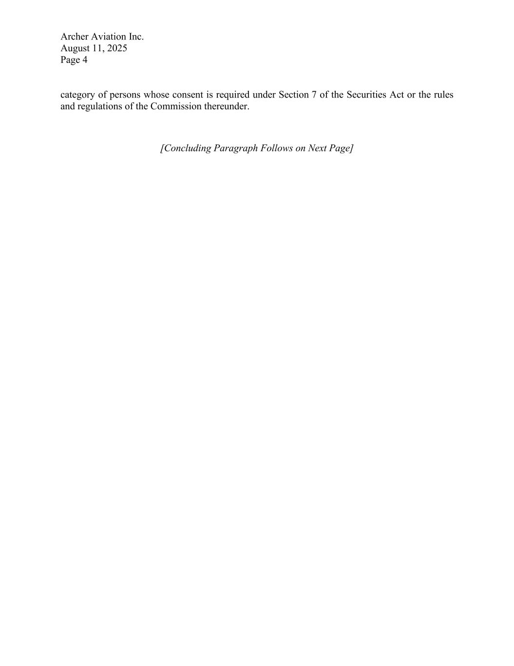Archer Aviation Inc. August 11, 2025 Page 4 category of persons whose consent is required under Section 7 of the Securities Act or the rules and regulations of the Commission thereunder. [Concluding Paragraph Follows on Next Page]