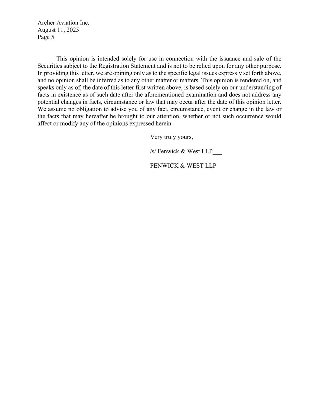 Archer Aviation Inc. August 11, 2025 Page 5 This opinion is intended solely for use in connection with the issuance and sale of the Securities subject to the Registration Statement and is not to be relied upon for any other purpose. In providing this letter, we are opining only as to the specific legal issues expressly set forth above, and no opinion shall be inferred as to any other matter or matters. This opinion is rendered on, and speaks only as of, the date of this letter first written above, is based solely on our understanding of facts in existence as of such date after the aforementioned examination and does not address any potential changes in facts, circumstance or law that may occur after the date of this opinion letter. We assume no obligation to advise you of any fact, circumstance, event or change in the law or the facts that may hereafter be brought to our attention, whether or not such occurrence would affect or modify any of the opinions expressed herein. Very truly yours, /s/ Fenwick & West LLP___ FENWICK & WEST LLP