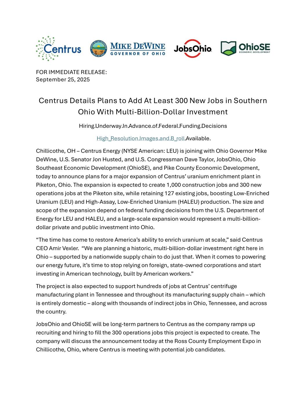 FOR IMMEDIATE RELEASE: September 25, 2025 Centrus Details Plans to Add At Least 300 New Jobs in Southern Ohio With Multi-Billion-Dollar Investment Hiring.Underway.In.Advance.of.Federal.Funding.Decisions High‗Resolution.Images.and.B‗roll.Available. Chillicothe, OH – Centrus Energy (NYSE American: LEU) is joining with Ohio Governor Mike DeWine, U.S. Senator Jon Husted, and U.S. Congressman Dave Taylor, JobsOhio, Ohio Southeast Economic Development (OhioSE), and Pike County Economic Development, today to announce plans for a major expansion of Centrus’ uranium enrichment plant in Piketon, Ohio. The expansion is expected to create 1,000 construction jobs and 300 new operations jobs at the Piketon site, while retaining 127 existing jobs, boosting Low-Enriched Uranium (LEU) and High-Assay, Low-Enriched Uranium (HALEU) production. The size and scope of the expansion depend on federal funding decisions from the U.S. Department of Energy for LEU and HALEU, and a large-scale expansion would represent a multi-billion- dollar private and public investment into Ohio. “The time has come to restore America’s ability to enrich uranium at scale,” said Centrus CEO Amir Vexler. “We are planning a historic, multi-billion-dollar investment right here in Ohio – supported by a nationwide supply chain to do just that. When it comes to powering our energy future, it’s time to stop relying on foreign, state-owned corporations and start investing in American technology, built by American workers.” The project is also expected to support hundreds of jobs at Centrus’ centrifuge manufacturing plant in Tennessee and throughout its manufacturing supply chain – which is entirely domestic – along with thousands of indirect jobs in Ohio, Tennessee, and across the country. JobsOhio and OhioSE will be long-term partners to Centrus as the company ramps up recruiting and hiring to fill the 300 operations jobs this project is expected to create. The company will discuss the announcement today at the Ross County Employment Expo in Chillicothe, Ohio, where Centrus is meeting with potential job candidates.