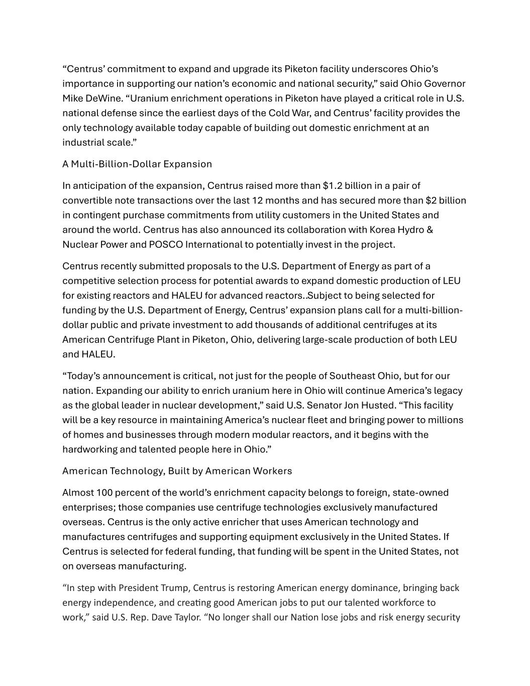 “Centrus’ commitment to expand and upgrade its Piketon facility underscores Ohio’s importance in supporting our nation’s economic and national security,” said Ohio Governor Mike DeWine. “Uranium enrichment operations in Piketon have played a critical role in U.S. national defense since the earliest days of the Cold War, and Centrus’ facility provides the only technology available today capable of building out domestic enrichment at an industrial scale.” A Multi-Billion-Dollar Expansion In anticipation of the expansion, Centrus raised more than $1.2 billion in a pair of convertible note transactions over the last 12 months and has secured more than $2 billion in contingent purchase commitments from utility customers in the United States and around the world. Centrus has also announced its collaboration with Korea Hydro & Nuclear Power and POSCO International to potentially invest in the project. Centrus recently submitted proposals to the U.S. Department of Energy as part of a competitive selection process for potential awards to expand domestic production of LEU for existing reactors and HALEU for advanced reactors..Subject to being selected for funding by the U.S. Department of Energy, Centrus’ expansion plans call for a multi-billion- dollar public and private investment to add thousands of additional centrifuges at its American Centrifuge Plant in Piketon, Ohio, delivering large-scale production of both LEU and HALEU. “Today’s announcement is critical, not just for the people of Southeast Ohio, but for our nation. Expanding our ability to enrich uranium here in Ohio will continue America’s legacy as the global leader in nuclear development,” said U.S. Senator Jon Husted. “This facility will be a key resource in maintaining America’s nuclear fleet and bringing power to millions of homes and businesses through modern modular reactors, and it begins with the hardworking and talented people here in Ohio.” American Technology, Built by American Workers Almost 100 percent of the world’s enrichment capacity belongs to foreign, state-owned enterprises; those companies use centrifuge technologies exclusively manufactured overseas. Centrus is the only active enricher that uses American technology and manufactures centrifuges and supporting equipment exclusively in the United States. If Centrus is selected for federal funding, that funding will be spent in the United States, not on overseas manufacturing. “In step with President Trump, Centrus is restoring American energy dominance, bringing back energy independence, and crea�ng good American jobs to put our talented workforce to work,” said U.S. Rep. Dave Taylor. “No longer shall our Na�on lose jobs and risk energy security