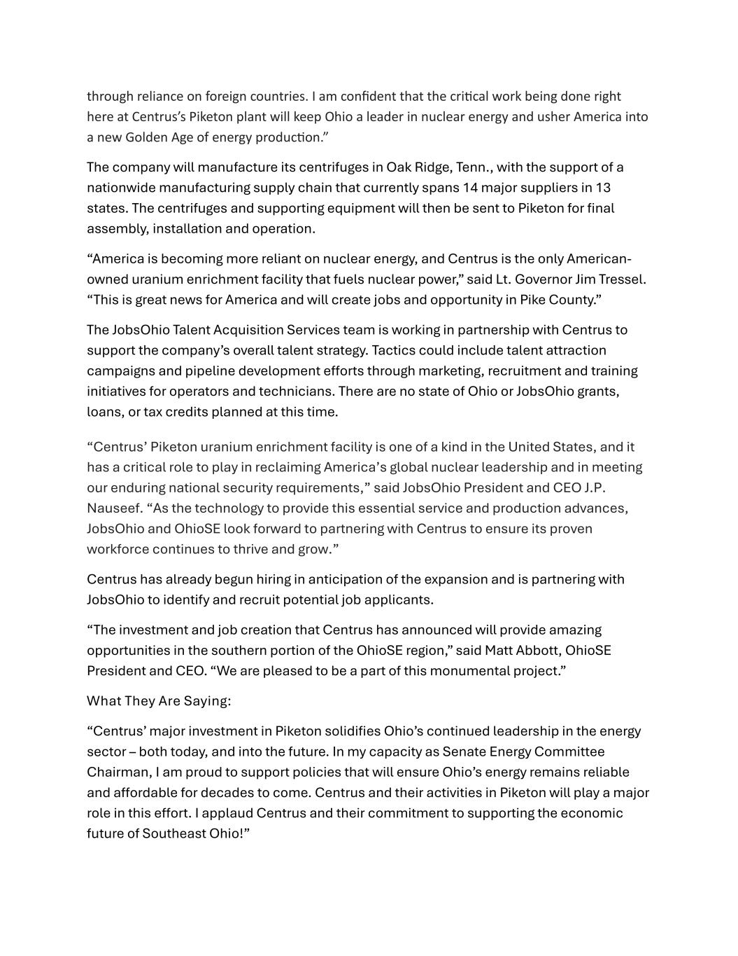 through reliance on foreign countries. I am confident that the cri�cal work being done right here at Centrus’s Piketon plant will keep Ohio a leader in nuclear energy and usher America into a new Golden Age of energy produc�on.” The company will manufacture its centrifuges in Oak Ridge, Tenn., with the support of a nationwide manufacturing supply chain that currently spans 14 major suppliers in 13 states. The centrifuges and supporting equipment will then be sent to Piketon for final assembly, installation and operation. “America is becoming more reliant on nuclear energy, and Centrus is the only American- owned uranium enrichment facility that fuels nuclear power,” said Lt. Governor Jim Tressel. “This is great news for America and will create jobs and opportunity in Pike County.” The JobsOhio Talent Acquisition Services team is working in partnership with Centrus to support the company’s overall talent strategy. Tactics could include talent attraction campaigns and pipeline development efforts through marketing, recruitment and training initiatives for operators and technicians. There are no state of Ohio or JobsOhio grants, loans, or tax credits planned at this time. “Centrus’ Piketon uranium enrichment facility is one of a kind in the United States, and it has a critical role to play in reclaiming America’s global nuclear leadership and in meeting our enduring national security requirements,” said JobsOhio President and CEO J.P. Nauseef. “As the technology to provide this essential service and production advances, JobsOhio and OhioSE look forward to partnering with Centrus to ensure its proven workforce continues to thrive and grow.” Centrus has already begun hiring in anticipation of the expansion and is partnering with JobsOhio to identify and recruit potential job applicants. “The investment and job creation that Centrus has announced will provide amazing opportunities in the southern portion of the OhioSE region,” said Matt Abbott, OhioSE President and CEO. “We are pleased to be a part of this monumental project.” What They Are Saying: “Centrus’ major investment in Piketon solidifies Ohio’s continued leadership in the energy sector – both today, and into the future. In my capacity as Senate Energy Committee Chairman, I am proud to support policies that will ensure Ohio’s energy remains reliable and affordable for decades to come. Centrus and their activities in Piketon will play a major role in this effort. I applaud Centrus and their commitment to supporting the economic future of Southeast Ohio!”