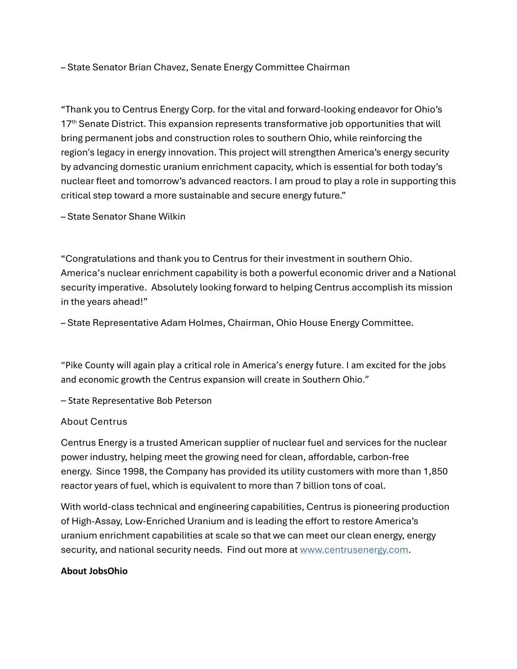 – State Senator Brian Chavez, Senate Energy Committee Chairman “Thank you to Centrus Energy Corp. for the vital and forward-looking endeavor for Ohio’s 17th Senate District. This expansion represents transformative job opportunities that will bring permanent jobs and construction roles to southern Ohio, while reinforcing the region's legacy in energy innovation. This project will strengthen America’s energy security by advancing domestic uranium enrichment capacity, which is essential for both today’s nuclear fleet and tomorrow’s advanced reactors. I am proud to play a role in supporting this critical step toward a more sustainable and secure energy future.” – State Senator Shane Wilkin “Congratulations and thank you to Centrus for their investment in southern Ohio. America’s nuclear enrichment capability is both a powerful economic driver and a National security imperative. Absolutely looking forward to helping Centrus accomplish its mission in the years ahead!” – State Representative Adam Holmes, Chairman, Ohio House Energy Committee. “Pike County will again play a critical role in America’s energy future. I am excited for the jobs and economic growth the Centrus expansion will create in Southern Ohio.” – State Representative Bob Peterson About Centrus Centrus Energy is a trusted American supplier of nuclear fuel and services for the nuclear power industry, helping meet the growing need for clean, affordable, carbon-free energy. Since 1998, the Company has provided its utility customers with more than 1,850 reactor years of fuel, which is equivalent to more than 7 billion tons of coal. With world-class technical and engineering capabilities, Centrus is pioneering production of High-Assay, Low-Enriched Uranium and is leading the effort to restore America’s uranium enrichment capabilities at scale so that we can meet our clean energy, energy security, and national security needs. Find out more at www.centrusenergy.com. About JobsOhio