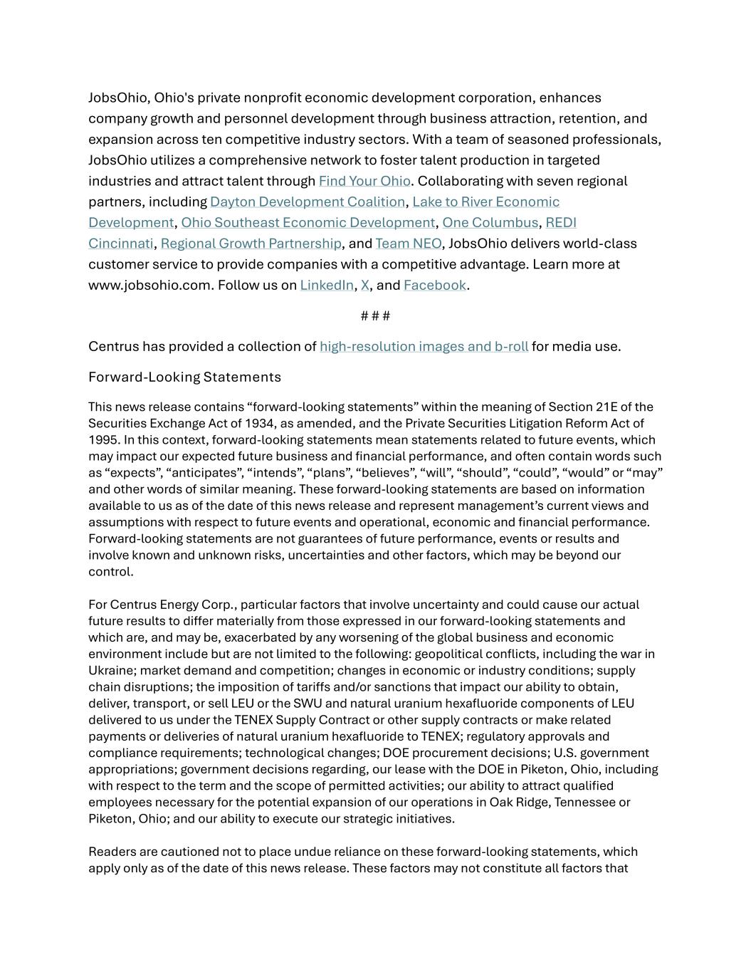 JobsOhio, Ohio's private nonprofit economic development corporation, enhances company growth and personnel development through business attraction, retention, and expansion across ten competitive industry sectors. With a team of seasoned professionals, JobsOhio utilizes a comprehensive network to foster talent production in targeted industries and attract talent through Find Your Ohio. Collaborating with seven regional partners, including Dayton Development Coalition, Lake to River Economic Development, Ohio Southeast Economic Development, One Columbus, REDI Cincinnati, Regional Growth Partnership, and Team NEO, JobsOhio delivers world-class customer service to provide companies with a competitive advantage. Learn more at www.jobsohio.com. Follow us on LinkedIn, X, and Facebook. # # # Centrus has provided a collection of high-resolution images and b-roll for media use. Forward-Looking Statements This news release contains “forward-looking statements” within the meaning of Section 21E of the Securities Exchange Act of 1934, as amended, and the Private Securities Litigation Reform Act of 1995. In this context, forward-looking statements mean statements related to future events, which may impact our expected future business and financial performance, and often contain words such as “expects”, “anticipates”, “intends”, “plans”, “believes”, “will”, “should”, “could”, “would” or “may” and other words of similar meaning. These forward-looking statements are based on information available to us as of the date of this news release and represent management’s current views and assumptions with respect to future events and operational, economic and financial performance. Forward-looking statements are not guarantees of future performance, events or results and involve known and unknown risks, uncertainties and other factors, which may be beyond our control. For Centrus Energy Corp., particular factors that involve uncertainty and could cause our actual future results to differ materially from those expressed in our forward-looking statements and which are, and may be, exacerbated by any worsening of the global business and economic environment include but are not limited to the following: geopolitical conflicts, including the war in Ukraine; market demand and competition; changes in economic or industry conditions; supply chain disruptions; the imposition of tariffs and/or sanctions that impact our ability to obtain, deliver, transport, or sell LEU or the SWU and natural uranium hexafluoride components of LEU delivered to us under the TENEX Supply Contract or other supply contracts or make related payments or deliveries of natural uranium hexafluoride to TENEX; regulatory approvals and compliance requirements; technological changes; DOE procurement decisions; U.S. government appropriations; government decisions regarding, our lease with the DOE in Piketon, Ohio, including with respect to the term and the scope of permitted activities; our ability to attract qualified employees necessary for the potential expansion of our operations in Oak Ridge, Tennessee or Piketon, Ohio; and our ability to execute our strategic initiatives. Readers are cautioned not to place undue reliance on these forward-looking statements, which apply only as of the date of this news release. These factors may not constitute all factors that