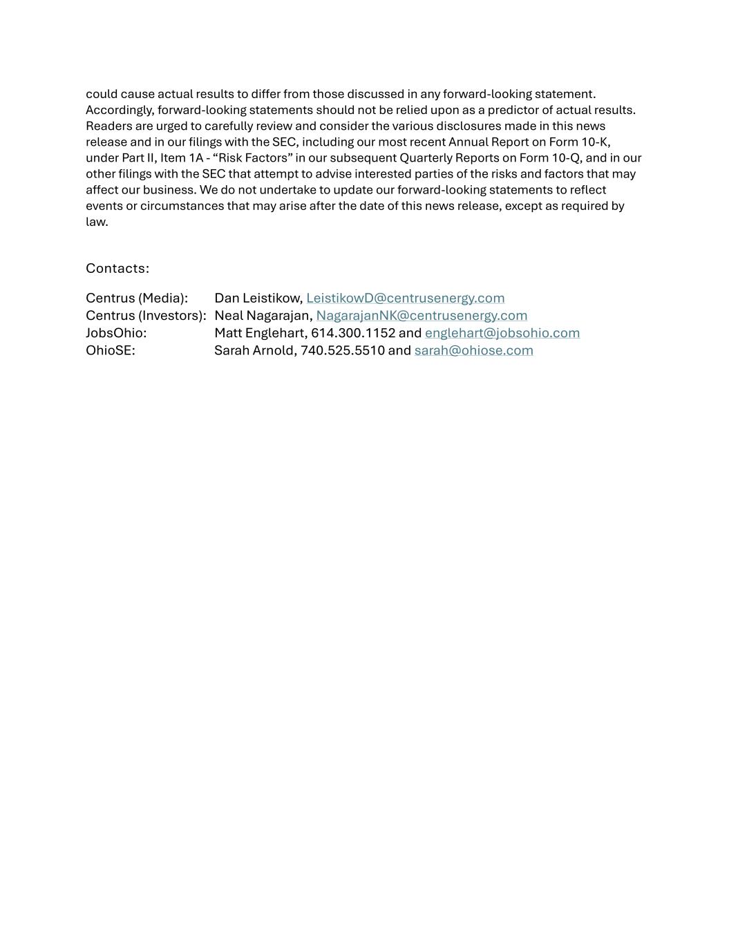 could cause actual results to differ from those discussed in any forward-looking statement. Accordingly, forward-looking statements should not be relied upon as a predictor of actual results. Readers are urged to carefully review and consider the various disclosures made in this news release and in our filings with the SEC, including our most recent Annual Report on Form 10-K, under Part II, Item 1A - “Risk Factors” in our subsequent Quarterly Reports on Form 10-Q, and in our other filings with the SEC that attempt to advise interested parties of the risks and factors that may affect our business. We do not undertake to update our forward-looking statements to reflect events or circumstances that may arise after the date of this news release, except as required by law. Contacts: Centrus (Media): Dan Leistikow, LeistikowD@centrusenergy.com Centrus (Investors): Neal Nagarajan, NagarajanNK@centrusenergy.com JobsOhio: Matt Englehart, 614.300.1152 and englehart@jobsohio.com OhioSE: Sarah Arnold, 740.525.5510 and sarah@ohiose.com