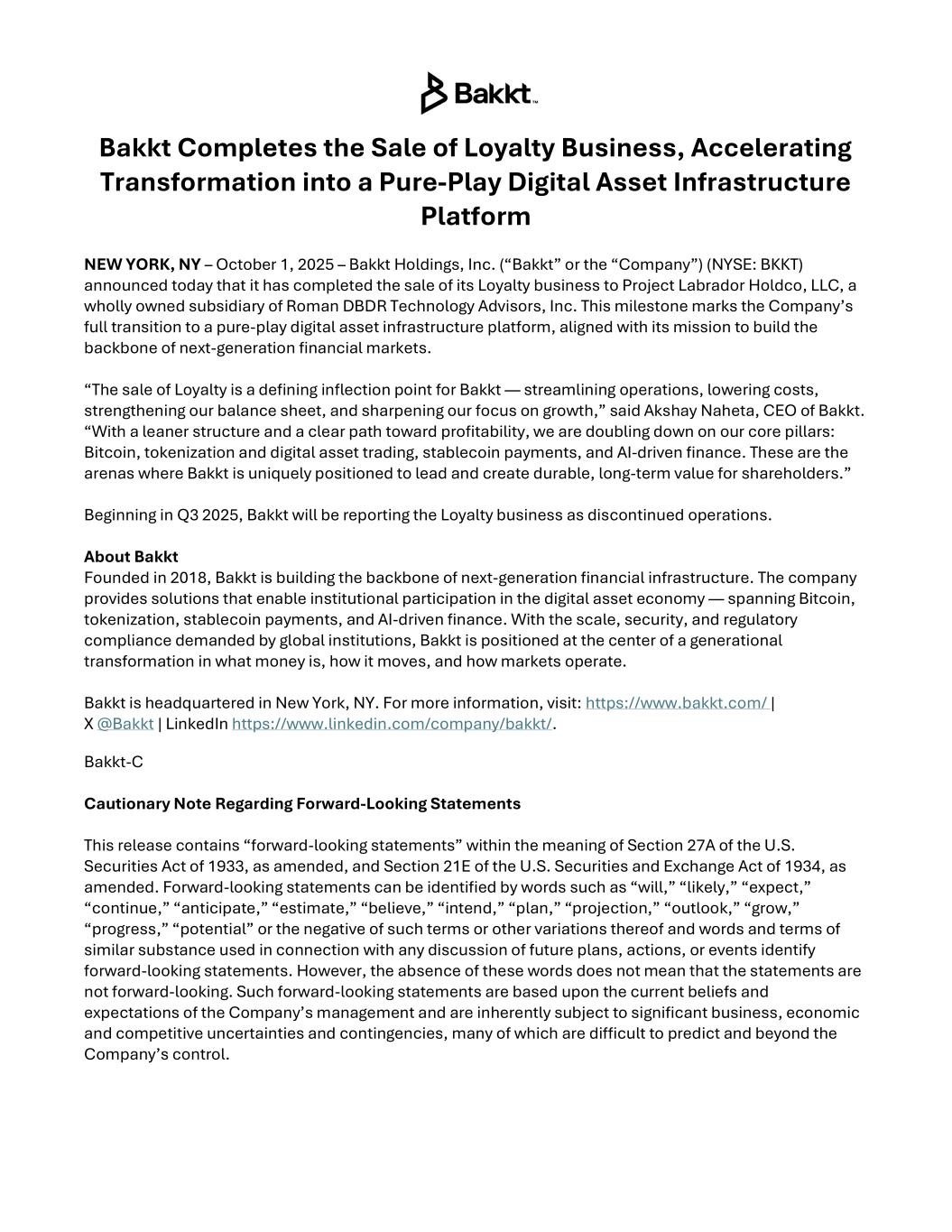 Bakkt Completes the Sale of Loyalty Business, Accelerating Transformation into a Pure-Play Digital Asset Infrastructure Platform NEW YORK, NY – October 1, 2025 – Bakkt Holdings, Inc. (“Bakkt” or the “Company”) (NYSE: BKKT) announced today that it has completed the sale of its Loyalty business to Project Labrador Holdco, LLC, a wholly owned subsidiary of Roman DBDR Technology Advisors, Inc. This milestone marks the Company’s full transition to a pure-play digital asset infrastructure platform, aligned with its mission to build the backbone of next-generation financial markets. “The sale of Loyalty is a defining inflection point for Bakkt — streamlining operations, lowering costs, strengthening our balance sheet, and sharpening our focus on growth,” said Akshay Naheta, CEO of Bakkt. “With a leaner structure and a clear path toward profitability, we are doubling down on our core pillars: Bitcoin, tokenization and digital asset trading, stablecoin payments, and AI-driven finance. These are the arenas where Bakkt is uniquely positioned to lead and create durable, long-term value for shareholders.” Beginning in Q3 2025, Bakkt will be reporting the Loyalty business as discontinued operations. About Bakkt Founded in 2018, Bakkt is building the backbone of next-generation financial infrastructure. The company provides solutions that enable institutional participation in the digital asset economy — spanning Bitcoin, tokenization, stablecoin payments, and AI-driven finance. With the scale, security, and regulatory compliance demanded by global institutions, Bakkt is positioned at the center of a generational transformation in what money is, how it moves, and how markets operate. Bakkt is headquartered in New York, NY. For more information, visit: https://www.bakkt.com/ | X @Bakkt | LinkedIn https://www.linkedin.com/company/bakkt/. Bakkt-C Cautionary Note Regarding Forward-Looking Statements This release contains “forward-looking statements” within the meaning of Section 27A of the U.S. Securities Act of 1933, as amended, and Section 21E of the U.S. Securities and Exchange Act of 1934, as amended. Forward-looking statements can be identified by words such as “will,” “likely,” “expect,” “continue,” “anticipate,” “estimate,” “believe,” “intend,” “plan,” “projection,” “outlook,” “grow,” “progress,” “potential” or the negative of such terms or other variations thereof and words and terms of similar substance used in connection with any discussion of future plans, actions, or events identify forward-looking statements. However, the absence of these words does not mean that the statements are not forward-looking. Such forward-looking statements are based upon the current beliefs and expectations of the Company’s management and are inherently subject to significant business, economic and competitive uncertainties and contingencies, many of which are difficult to predict and beyond the Company’s control.