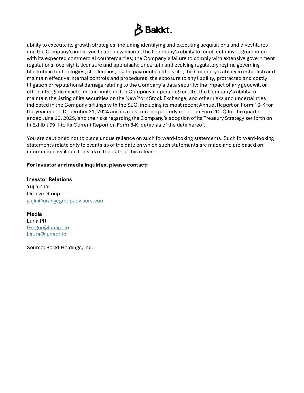 ability to execute its growth strategies, including identifying and executing acquisitions and divestitures and the Company’s initiatives to add new clients; the Company’s ability to reach definitive agreements with its expected commercial counterparties; the Company’s failure to comply with extensive government regulations, oversight, licensure and appraisals; uncertain and evolving regulatory regime governing blockchain technologies, stablecoins, digital payments and crypto; the Company’s ability to establish and maintain effective internal controls and procedures; the exposure to any liability, protracted and costly litigation or reputational damage relating to the Company’s data security; the impact of any goodwill or other intangible assets impairments on the Company’s operating results; the Company’s ability to maintain the listing of its securities on the New York Stock Exchange; and other risks and uncertainties indicated in the Company’s filings with the SEC, including its most recent Annual Report on Form 10-K for the year ended December 31, 2024 and its most recent quarterly report on Form 10-Q for the quarter ended June 30, 2025, and the risks regarding the Company’s adoption of its Treasury Strategy set forth on in Exhibit 99.1 to its Current Report on Form 8-K, dated as of the date hereof. You are cautioned not to place undue reliance on such forward-looking statements. Such forward-looking statements relate only to events as of the date on which such statements are made and are based on information available to us as of the date of this release. For investor and media inquiries, please contact: Investor Relations Yujia Zhai Orange Group yujia@orangegroupadvisors.com Media Luna PR Gregor@lunapr.io Laura@lunapr.io Source: Bakkt Holdings, Inc.