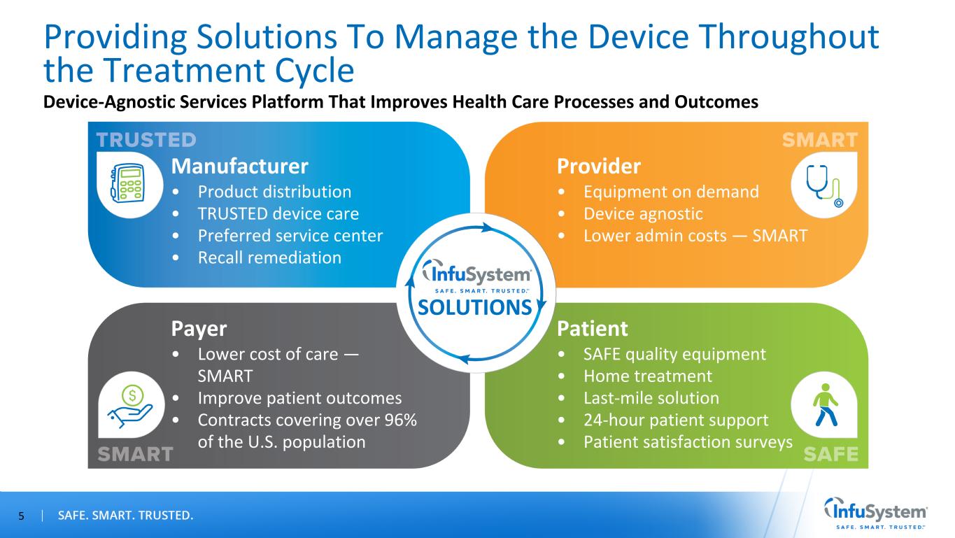 *Source: Newsweek, World's Best Hospitals 2024 4 Business Highlights A leading provider of medical equipment and patient services powered by a 100K+ device fleet in the U.S. and Canada Nearly four decades of experience, built on existing Oncology therapy model and now rapidly expanding into multiple therapies National scale, serving 19 out of 20 top-ranked hospital systems nationwide* Participating in-network provider in more than 800 health insurance networks covering over 96% of the U.S. population, serving over 2,000 sites of care Serving nearly 4,500 customer locations Seven major service areas in the U.S. and Canada with more than 500 employees