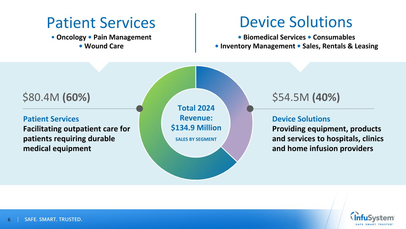 SALES BY SEGMENT Total 2024 Revenue: $134.9 Million $54.5M (40%)$80.4M (60%) Device Solutions Providing equipment, products and services to hospitals, clinics and home infusion providers Patient Services Facilitating outpatient care for patients requiring durable medical equipment Patient Services • Oncology • Pain Management • Wound Care Device Solutions • Biomedical Services • Consumables • Inventory Management • Sales, Rentals & Leasing 6