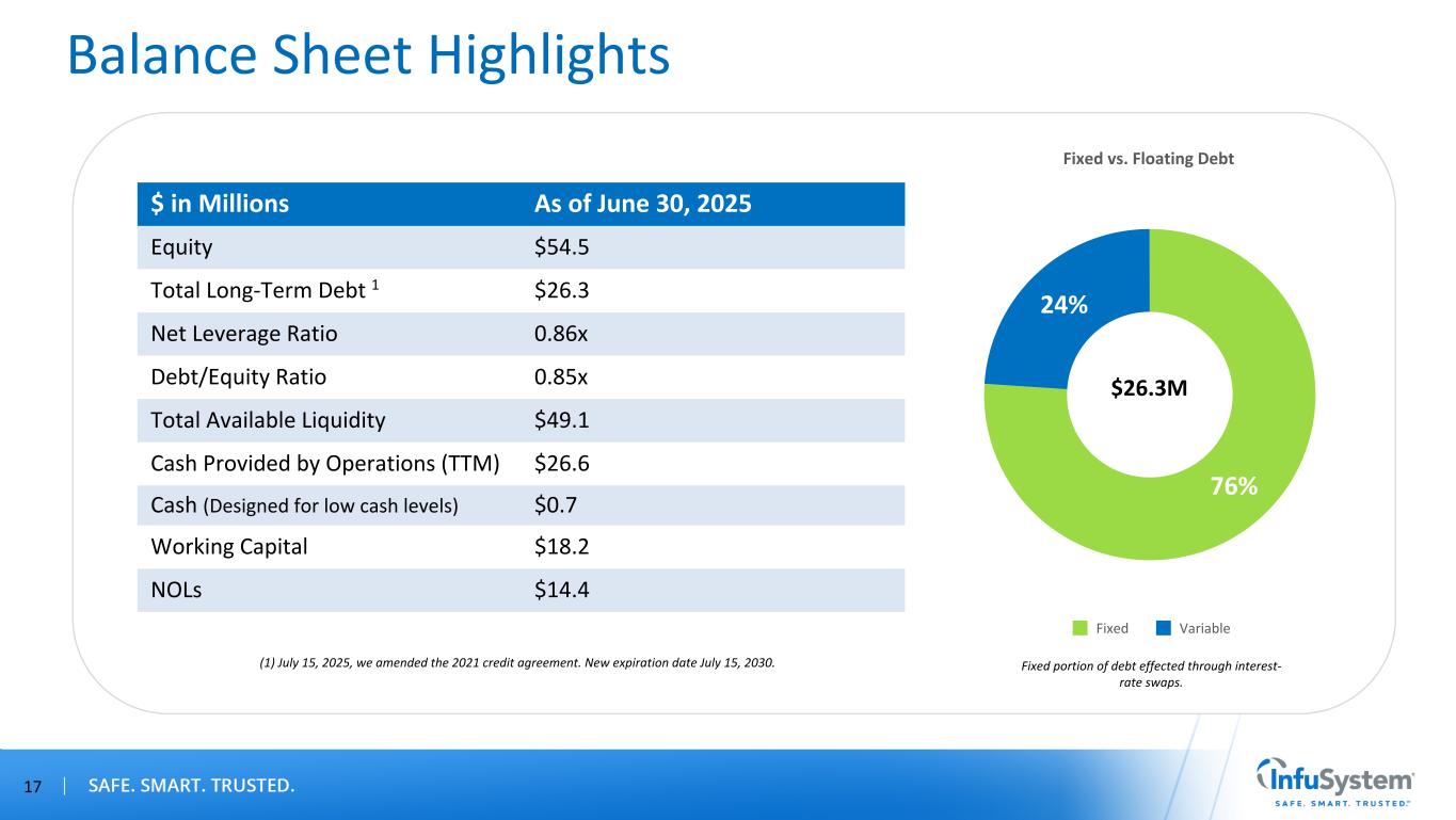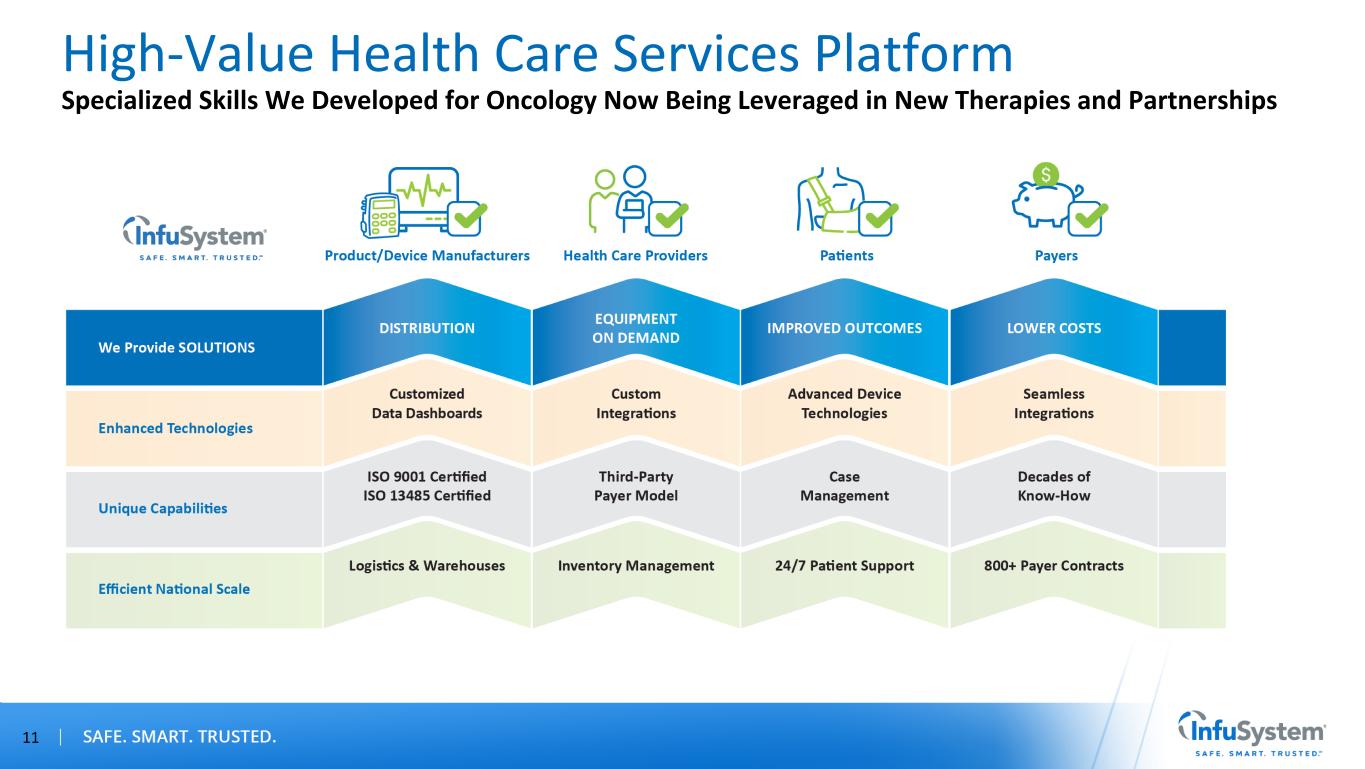 Forward-Looking Statements / Non-GAAP Measures Forward-Looking Statements Certain statements contained in this presentation are forward-looking statements within the meaning of Section 27A of the Securities Act of 1933, as amended, and Section 21E of the Securities Exchange Act of 1934, as amended, such as statements relating to future actions, our share repurchase program and capital allocation strategy, business plans, strategic partnerships, growth initiatives, objectives and prospects, future operating or financial performance, guidance and expected new business relationships and the terms thereof (including estimated potential revenue under new or existing contracts). The words “believe,” “may,” “will,” “estimate,” “continue,” “anticipate,” “intend,” “should,” “plan,” "goal," “expect,” “strategy,” “future,” “likely,” variations of such words, and other similar expressions, as they relate to the Company, are intended to identify forward-looking statements. Forward-looking statements are subject to factors, risks and uncertainties that could cause actual results to differ materially, including, but not limited to, our ability to successfully execute on our growth initiatives and strategic partnerships, our ability to enter into definitive agreements for the new business relationships on expected terms or at all, our ability to generate estimated potential revenue amounts under new or existing contracts, our dependence on estimates of collectible revenue, potential litigation, changes in third-party reimbursement processes, changes in law, global financial conditions and recessionary risks, rising inflation and interest rates, supply chain disruptions, systemic pressures in the banking sector, including disruptions to credit markets, the Company's ability to remediate its previously disclosed material weakness in internal control over financial reporting, contributions from acquired businesses or new business lines, products or services and other risk factors disclosed in the Company’s most recent annual report on Form 10-K and, to the extent applicable, quarterly reports on Form 10-Q. Our strategic partnerships are subject to similar factors, risks and uncertainties. All forward-looking statements made in this presentation speak only as of the date hereof. InfuSystem does not undertake any obligation to update any forward-looking statements to reflect future events or circumstances, except as required by law. Non-GAAP Measures This presentation contains information prepared in conformity with GAAP as well as non-GAAP financial information. The Company believes that the non-GAAP financial measures presented in this presentation provide useful information to the Company’s management, investors and other interested parties about the Company’s operating performance because they allow them to understand and compare the Company’s operating results during the current periods to the prior year periods in a more consistent manner. This non-GAAP information should be considered by the reader in addition to, but not instead of, the financial statements prepared in accordance with GAAP, and similarly titled non-GAAP measures may be calculated differently by other companies. The Company calculates those non-GAAP measures by adjusting for nonrecurring or non-core items that are not part of the normal course of business and that the Company’s management does not believe will have similar comparable year-over-year items. A reconciliation of those measures to the most directly comparable GAAP measures is provided in Appendix A of this presentation. 2