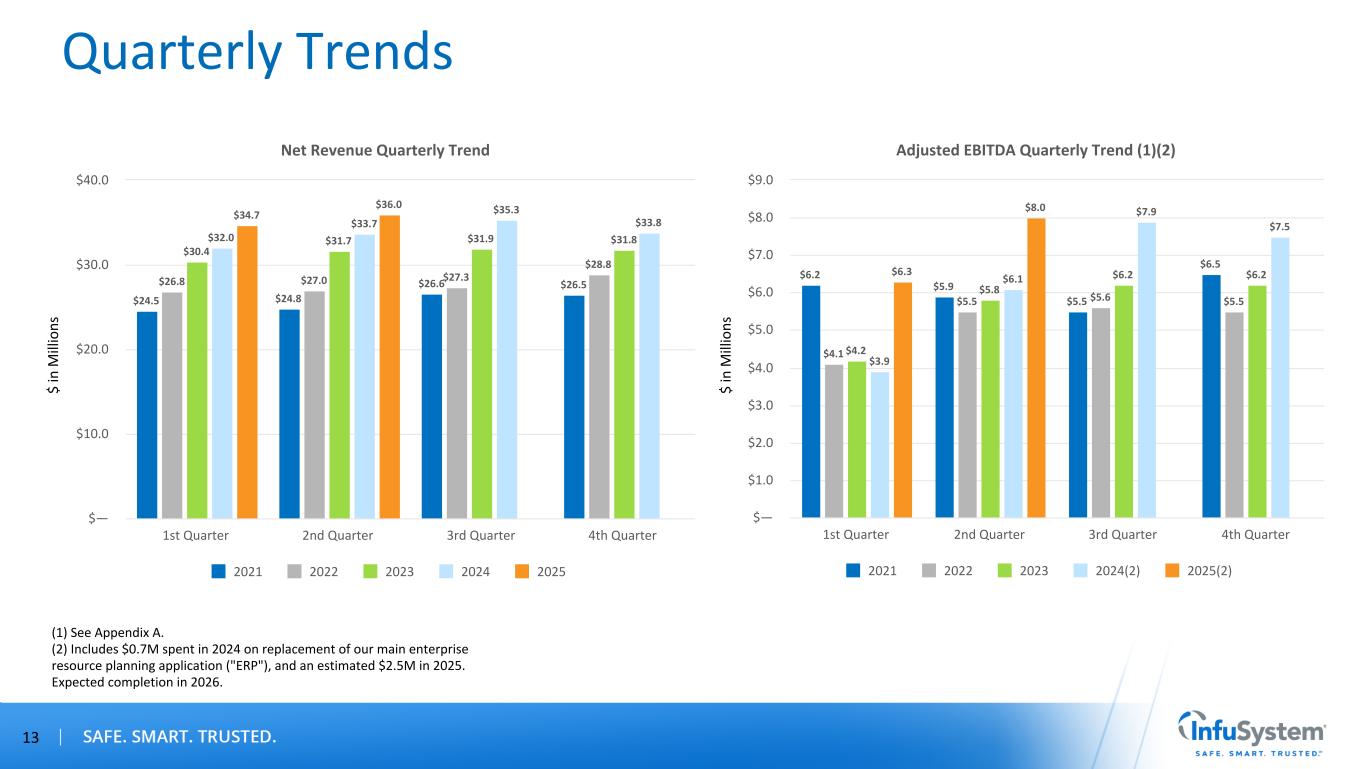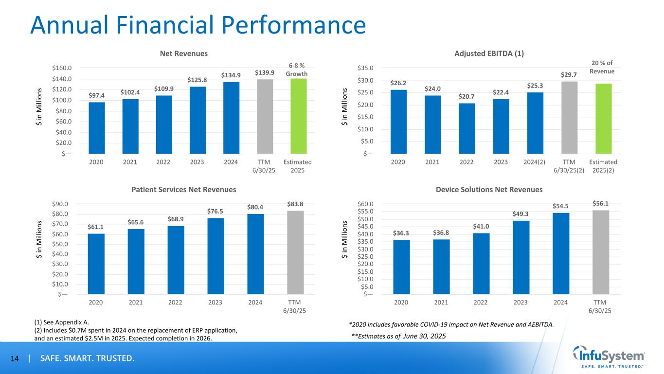 Quarterly Trends (1) See Appendix A. (2) Includes $0.7M spent in 2024 on replacement of our main enterprise resource planning application ("ERP"), and an estimated $2.5M in 2025. Expected completion in 2026. 13 Net Revenue Quarterly Trend $24.5 $24.8 $26.6 $26.5$26.8 $27.0 $27.3 $28.8 $30.4 $31.7 $31.9 $31.8$32.0 $33.7 $35.3 $33.8 $34.7 $36.0 2021 2022 2023 2024 2025 1st Quarter 2nd Quarter 3rd Quarter 4th Quarter $— $10.0 $20.0 $30.0 $40.0 Adjusted EBITDA Quarterly Trend (1)(2) $6.2 $5.9 $5.5 $6.5 $4.1 $5.5 $5.6 $5.5 $4.2 $5.8 $6.2 $6.2 $3.9 $6.1 $7.9 $7.5 $6.3 $8.0 2021 2022 2023 2024(2) 2025(2) 1st Quarter 2nd Quarter 3rd Quarter 4th Quarter $— $1.0 $2.0 $3.0 $4.0 $5.0 $6.0 $7.0 $8.0 $9.0 $ in M ill io ns $ in M ill io ns