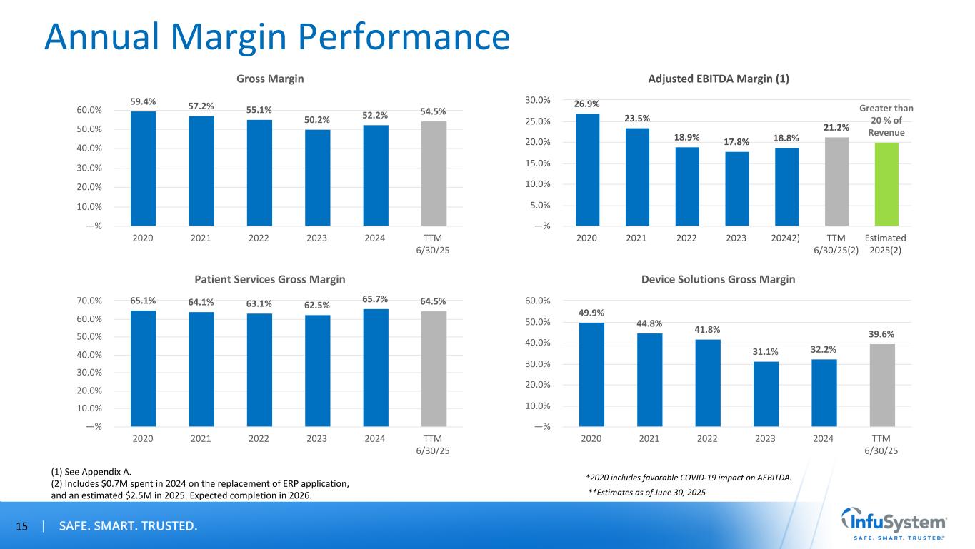 Annual Financial Performance 14 $ in M ill io ns $ in M ill io ns Net Revenues $97.4 $102.4 $109.9 $125.8 $134.9 $139.9 2020 2021 2022 2023 2024 TTM 6/30/25 Estimated 2025 $— $20.0 $40.0 $60.0 $80.0 $100.0 $120.0 $140.0 $160.0 Adjusted EBITDA (1) $26.2 $24.0 $20.7 $22.4 $25.3 $29.7 2020 2021 2022 2023 2024(2) TTM 6/30/25(2) Estimated 2025(2) $— $5.0 $10.0 $15.0 $20.0 $25.0 $30.0 $35.0 Patient Services Net Revenues $61.1 $65.6 $68.9 $76.5 $80.4 $83.8 2020 2021 2022 2023 2024 TTM 6/30/25 $— $10.0 $20.0 $30.0 $40.0 $50.0 $60.0 $70.0 $80.0 $90.0 Device Solutions Net Revenues $36.3 $36.8 $41.0 $49.3 $54.5 $56.1 2020 2021 2022 2023 2024 TTM 6/30/25 $— $5.0 $10.0 $15.0 $20.0 $25.0 $30.0 $35.0 $40.0 $45.0 $50.0 $55.0 $60.0 (1) See Appendix A. (2) Includes $0.7M spent in 2024 on the replacement of ERP application, and an estimated $2.5M in 2025. Expected completion in 2026. $ in M ill io ns $ in M ill io ns **Estimates as of June 30, 2025 *2020 includes favorable COVID-19 impact on Net Revenue and AEBITDA. 6-8 % Growth 20 % of Revenue