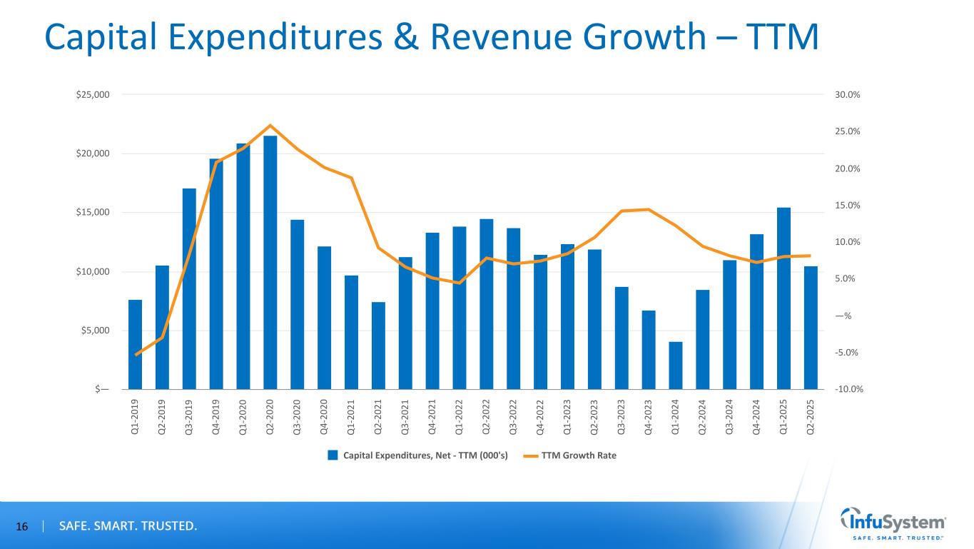 Annual Margin Performance 15 Gross Margin 59.4% 57.2% 55.1% 50.2% 52.2% 54.5% 2020 2021 2022 2023 2024 TTM 6/30/25 —% 10.0% 20.0% 30.0% 40.0% 50.0% 60.0% Adjusted EBITDA Margin (1) 26.9% 23.5% 18.9% 17.8% 18.8% 21.2% 2020 2021 2022 2023 20242) TTM 6/30/25(2) Estimated 2025(2) —% 5.0% 10.0% 15.0% 20.0% 25.0% 30.0% Patient Services Gross Margin 65.1% 64.1% 63.1% 62.5% 65.7% 64.5% 2020 2021 2022 2023 2024 TTM 6/30/25 —% 10.0% 20.0% 30.0% 40.0% 50.0% 60.0% 70.0% Device Solutions Gross Margin 49.9% 44.8% 41.8% 31.1% 32.2% 39.6% 2020 2021 2022 2023 2024 TTM 6/30/25 —% 10.0% 20.0% 30.0% 40.0% 50.0% 60.0% (1) See Appendix A. (2) Includes $0.7M spent in 2024 on the replacement of ERP application, and an estimated $2.5M in 2025. Expected completion in 2026. **Estimates as of June 30, 2025 *2020 includes favorable COVID-19 impact on AEBITDA. Greater than 20 % of Revenue