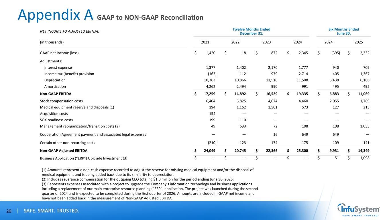 Appendix A GAAP to NON-GAAP Reconciliation 20 NET INCOME TO ADJUSTED EBITDA: Twelve Months Ended December 31, Six Months Ended June 30, (in thousands) 2021 2022 2023 2024 2024 2025 GAAP net income (loss) $ 1,420 $ 18 $ 872 $ 2,345 $ (395) $ 2,332 Adjustments: Interest expense 1,377 1,402 2,170 1,777 940 709 Income tax (benefit) provision (163) 112 979 2,714 405 1,367 Depreciation 10,363 10,866 11,518 11,508 5,438 6,166 Amortization 4,262 2,494 990 991 495 495 Non-GAAP EBITDA $ 17,259 $ 14,892 $ 16,529 $ 19,335 $ 6,883 $ 11,069 Stock compensation costs 6,404 3,825 4,074 4,460 2,055 1,769 Medical equipment reserve and disposals (1) 194 1,162 1,501 573 127 315 Acquisition costs 154 — — — — — SOX readiness costs 199 110 — — — — Management reorganization/transition costs (2) 49 633 72 108 108 1,055 Cooperation Agreement payment and associated legal expenses — — 16 649 649 — Certain other non-recurring costs (210) 123 174 175 109 141 Non-GAAP Adjusted EBITDA $ 24,049 $ 20,745 $ 22,366 $ 25,300 $ 9,931 $ 14,349 Business Application (“ERP”) Upgrade Investment (3) $ — $ — $ — $ — $ 51 $ 1,098 (1) Amounts represent a non-cash expense recorded to adjust the reserve for missing medical equipment and/or the disposal of medical equipment and is being added back due to its similarity to depreciation. (2) Includes severance compensation for the outgoing CEO totaling $1.0 million for the period ending June 30, 2025. (3) Represents expenses associated with a project to upgrade the Company’s information technology and business applications including a replacement of our main enterprise resource planning (“ERP”) application. The project was launched during the second quarter of 2024 and is expected to be completed during the first quarter of 2026. Amounts are included in GAAP net income and have not been added back in the measurement of Non-GAAP Adjusted EBITDA.