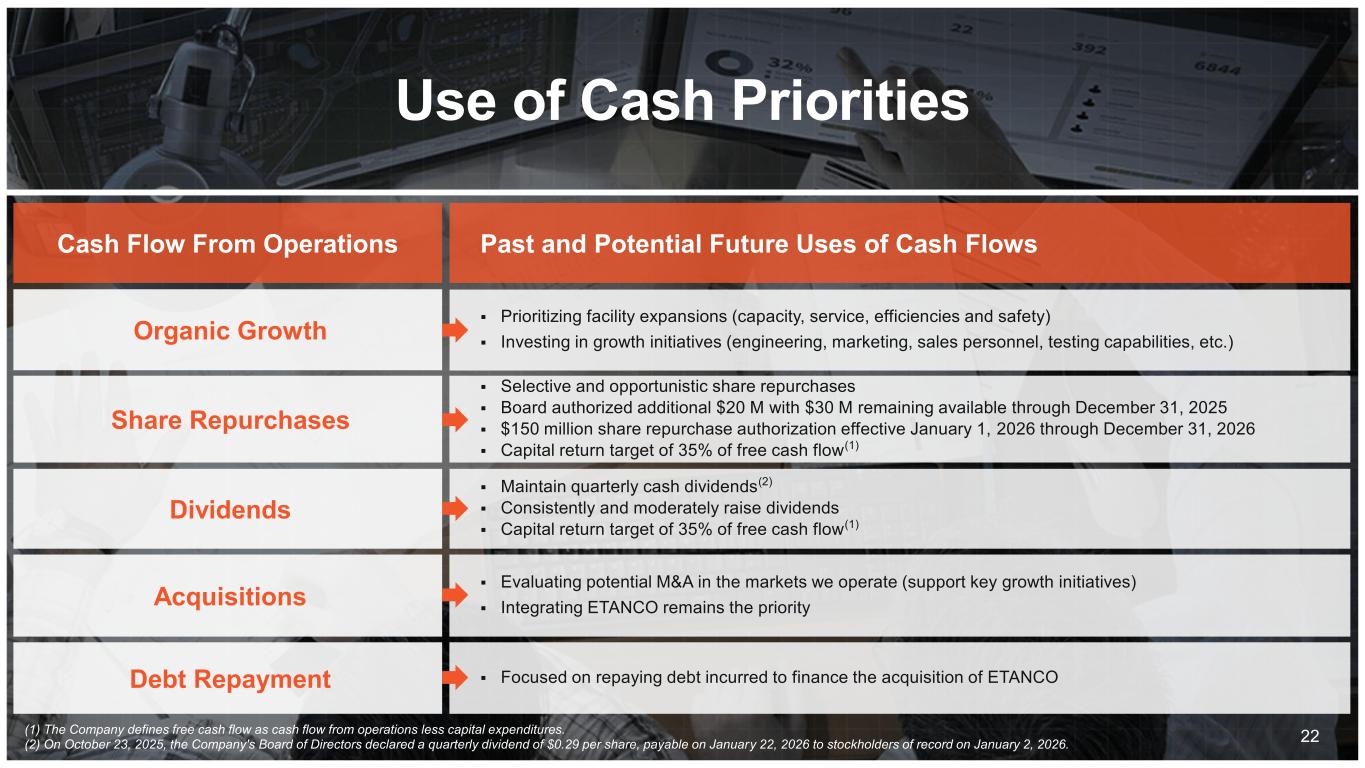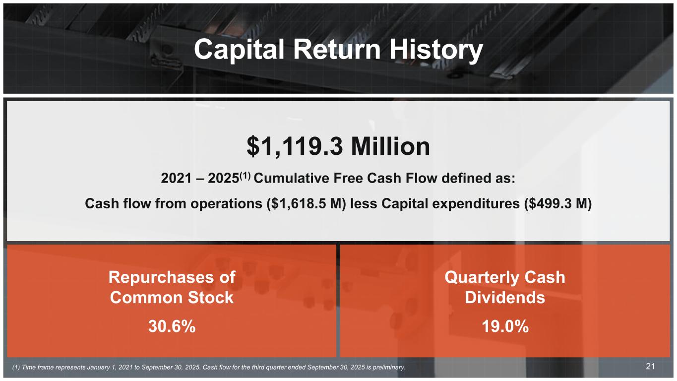 -連結営業利益率は、現在の市場環境と最近の戦略的イニシアチブを反映し、19.0%から20.0%の範囲となる見込みです。この見通しには、2025年6月2日および2025年10月15日に実施された既発表の値上げが反映されており、テネシー州ギャラティン既存施設の売却による1,290万ドルの利益、および約90万ドルから1,200万ドルの非経常的な退職費用が含まれている。