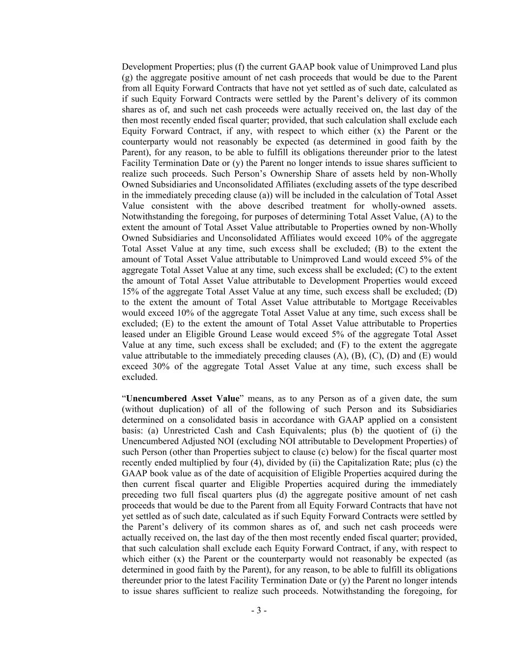 - 3 - Development Properties; plus (f) the current GAAP book value of Unimproved Land plus (g) the aggregate positive amount of net cash proceeds that would be due to the Parent from all Equity Forward Contracts that have not yet settled as of such date, calculated as if such Equity Forward Contracts were settled by the Parent’s delivery of its common shares as of, and such net cash proceeds were actually received on, the last day of the then most recently ended fiscal quarter; provided, that such calculation shall exclude each Equity Forward Contract, if any, with respect to which either (x) the Parent or the counterparty would not reasonably be expected (as determined in good faith by the Parent), for any reason, to be able to fulfill its obligations thereunder prior to the latest Facility Termination Date or (y) the Parent no longer intends to issue shares sufficient to realize such proceeds. Such Person’s Ownership Share of assets held by non-Wholly Owned Subsidiaries and Unconsolidated Affiliates (excluding assets of the type described in the immediately preceding clause (a)) will be included in the calculation of Total Asset Value consistent with the above described treatment for wholly-owned assets. Notwithstanding the foregoing, for purposes of determining Total Asset Value, (A) to the extent the amount of Total Asset Value attributable to Properties owned by non-Wholly Owned Subsidiaries and Unconsolidated Affiliates would exceed 10% of the aggregate Total Asset Value at any time, such excess shall be excluded; (B) to the extent the amount of Total Asset Value attributable to Unimproved Land would exceed 5% of the aggregate Total Asset Value at any time, such excess shall be excluded; (C) to the extent the amount of Total Asset Value attributable to Development Properties would exceed 15% of the aggregate Total Asset Value at any time, such excess shall be excluded; (D) to the extent the amount of Total Asset Value attributable to Mortgage Receivables would exceed 10% of the aggregate Total Asset Value at any time, such excess shall be excluded; (E) to the extent the amount of Total Asset Value attributable to Properties leased under an Eligible Ground Lease would exceed 5% of the aggregate Total Asset Value at any time, such excess shall be excluded; and (F) to the extent the aggregate value attributable to the immediately preceding clauses (A), (B), (C), (D) and (E) would exceed 30% of the aggregate Total Asset Value at any time, such excess shall be excluded. “Unencumbered Asset Value” means, as to any Person as of a given date, the sum (without duplication) of all of the following of such Person and its Subsidiaries determined on a consolidated basis in accordance with GAAP applied on a consistent basis: (a) Unrestricted Cash and Cash Equivalents; plus (b) the quotient of (i) the Unencumbered Adjusted NOI (excluding NOI attributable to Development Properties) of such Person (other than Properties subject to clause (c) below) for the fiscal quarter most recently ended multiplied by four (4), divided by (ii) the Capitalization Rate; plus (c) the GAAP book value as of the date of acquisition of Eligible Properties acquired during the then current fiscal quarter and Eligible Properties acquired during the immediately preceding two full fiscal quarters plus (d) the aggregate positive amount of net cash proceeds that would be due to the Parent from all Equity Forward Contracts that have not yet settled as of such date, calculated as if such Equity Forward Contracts were settled by the Parent’s delivery of its common shares as of, and such net cash proceeds were actually received on, the last day of the then most recently ended fiscal quarter; provided, that such calculation shall exclude each Equity Forward Contract, if any, with respect to which either (x) the Parent or the counterparty would not reasonably be expected (as determined in good faith by the Parent), for any reason, to be able to fulfill its obligations thereunder prior to the latest Facility Termination Date or (y) the Parent no longer intends to issue shares sufficient to realize such proceeds. Notwithstanding the foregoing, for