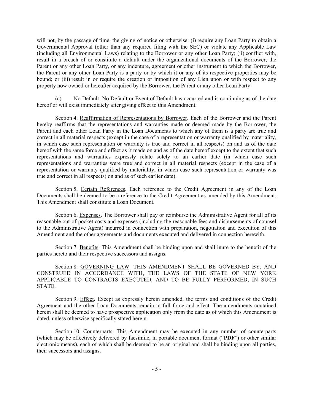 - 5 - will not, by the passage of time, the giving of notice or otherwise: (i) require any Loan Party to obtain a Governmental Approval (other than any required filing with the SEC) or violate any Applicable Law (including all Environmental Laws) relating to the Borrower or any other Loan Party; (ii) conflict with, result in a breach of or constitute a default under the organizational documents of the Borrower, the Parent or any other Loan Party, or any indenture, agreement or other instrument to which the Borrower, the Parent or any other Loan Party is a party or by which it or any of its respective properties may be bound; or (iii) result in or require the creation or imposition of any Lien upon or with respect to any property now owned or hereafter acquired by the Borrower, the Parent or any other Loan Party. (c) No Default. No Default or Event of Default has occurred and is continuing as of the date hereof or will exist immediately after giving effect to this Amendment. Section 4. Reaffirmation of Representations by Borrower. Each of the Borrower and the Parent hereby reaffirms that the representations and warranties made or deemed made by the Borrower, the Parent and each other Loan Party in the Loan Documents to which any of them is a party are true and correct in all material respects (except in the case of a representation or warranty qualified by materiality, in which case such representation or warranty is true and correct in all respects) on and as of the date hereof with the same force and effect as if made on and as of the date hereof except to the extent that such representations and warranties expressly relate solely to an earlier date (in which case such representations and warranties were true and correct in all material respects (except in the case of a representation or warranty qualified by materiality, in which case such representation or warranty was true and correct in all respects) on and as of such earlier date). Section 5. Certain References. Each reference to the Credit Agreement in any of the Loan Documents shall be deemed to be a reference to the Credit Agreement as amended by this Amendment. This Amendment shall constitute a Loan Document. Section 6. Expenses. The Borrower shall pay or reimburse the Administrative Agent for all of its reasonable out-of-pocket costs and expenses (including the reasonable fees and disbursements of counsel to the Administrative Agent) incurred in connection with preparation, negotiation and execution of this Amendment and the other agreements and documents executed and delivered in connection herewith. Section 7. Benefits. This Amendment shall be binding upon and shall inure to the benefit of the parties hereto and their respective successors and assigns. Section 8. GOVERNING LAW. THIS AMENDMENT SHALL BE GOVERNED BY, AND CONSTRUED IN ACCORDANCE WITH, THE LAWS OF THE STATE OF NEW YORK APPLICABLE TO CONTRACTS EXECUTED, AND TO BE FULLY PERFORMED, IN SUCH STATE. Section 9. Effect. Except as expressly herein amended, the terms and conditions of the Credit Agreement and the other Loan Documents remain in full force and effect. The amendments contained herein shall be deemed to have prospective application only from the date as of which this Amendment is dated, unless otherwise specifically stated herein. Section 10. Counterparts. This Amendment may be executed in any number of counterparts (which may be effectively delivered by facsimile, in portable document format (“PDF”) or other similar electronic means), each of which shall be deemed to be an original and shall be binding upon all parties, their successors and assigns.