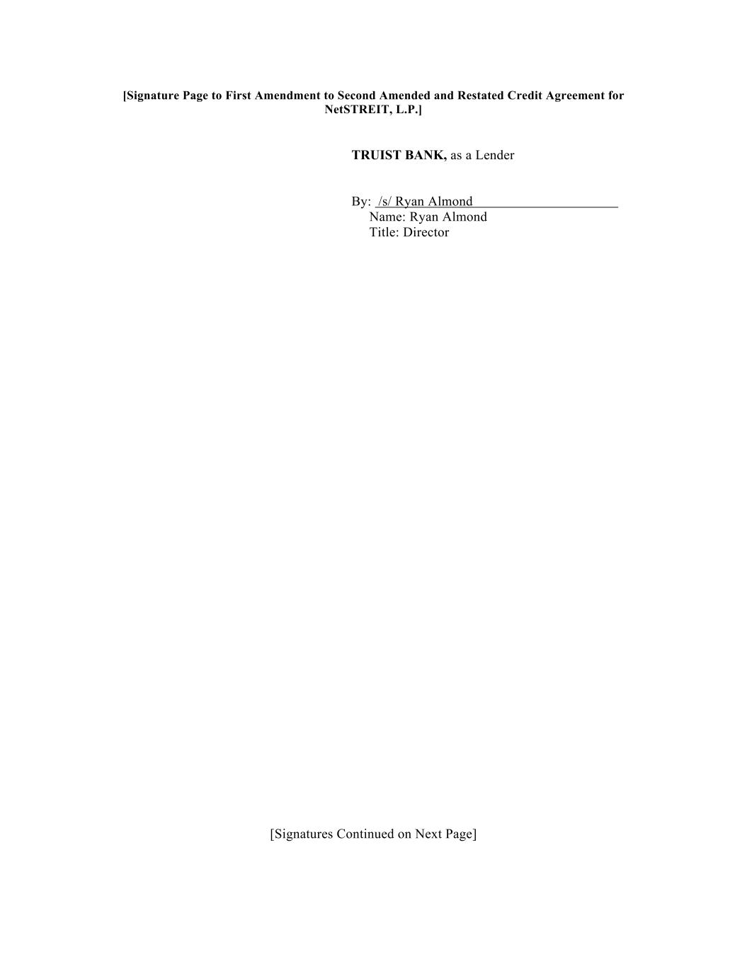 [Signature Page to First Amendment to Second Amended and Restated Credit Agreement for NetSTREIT, L.P.] TRUIST BANK, as a Lender By: /s/ Ryan Almond Name: Ryan Almond Title: Director [Signatures Continued on Next Page]