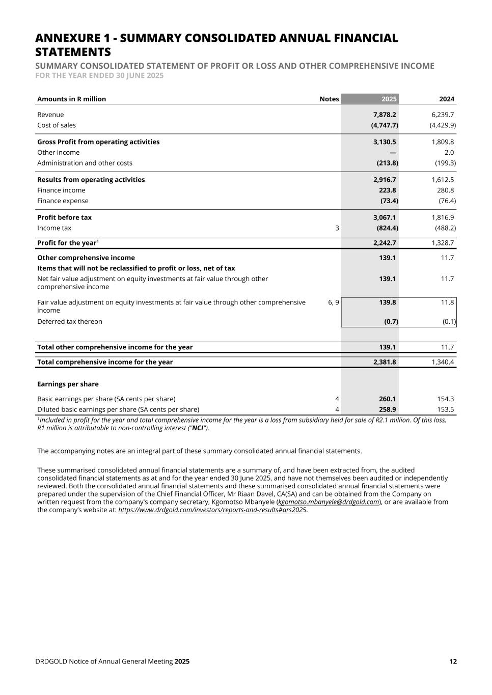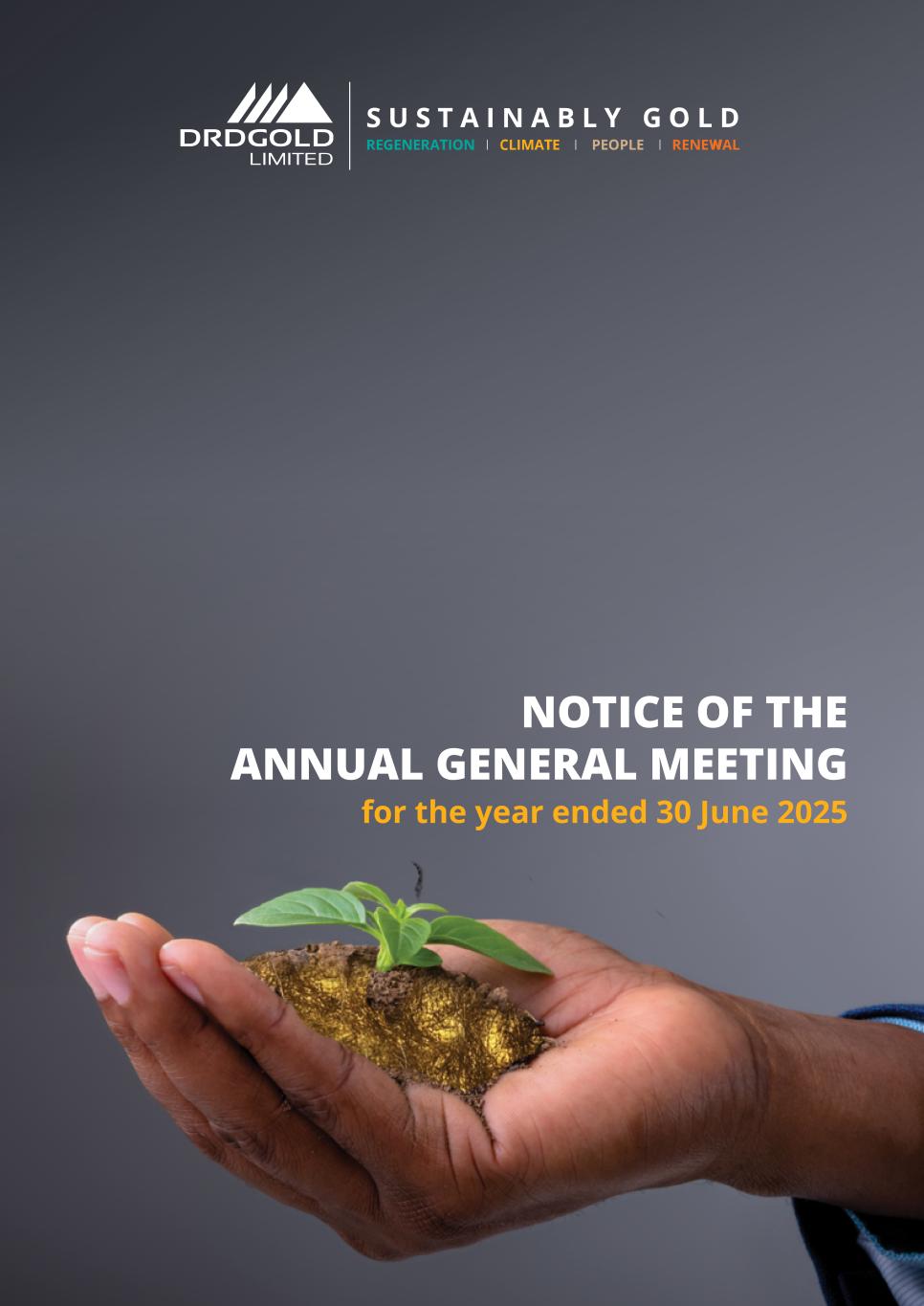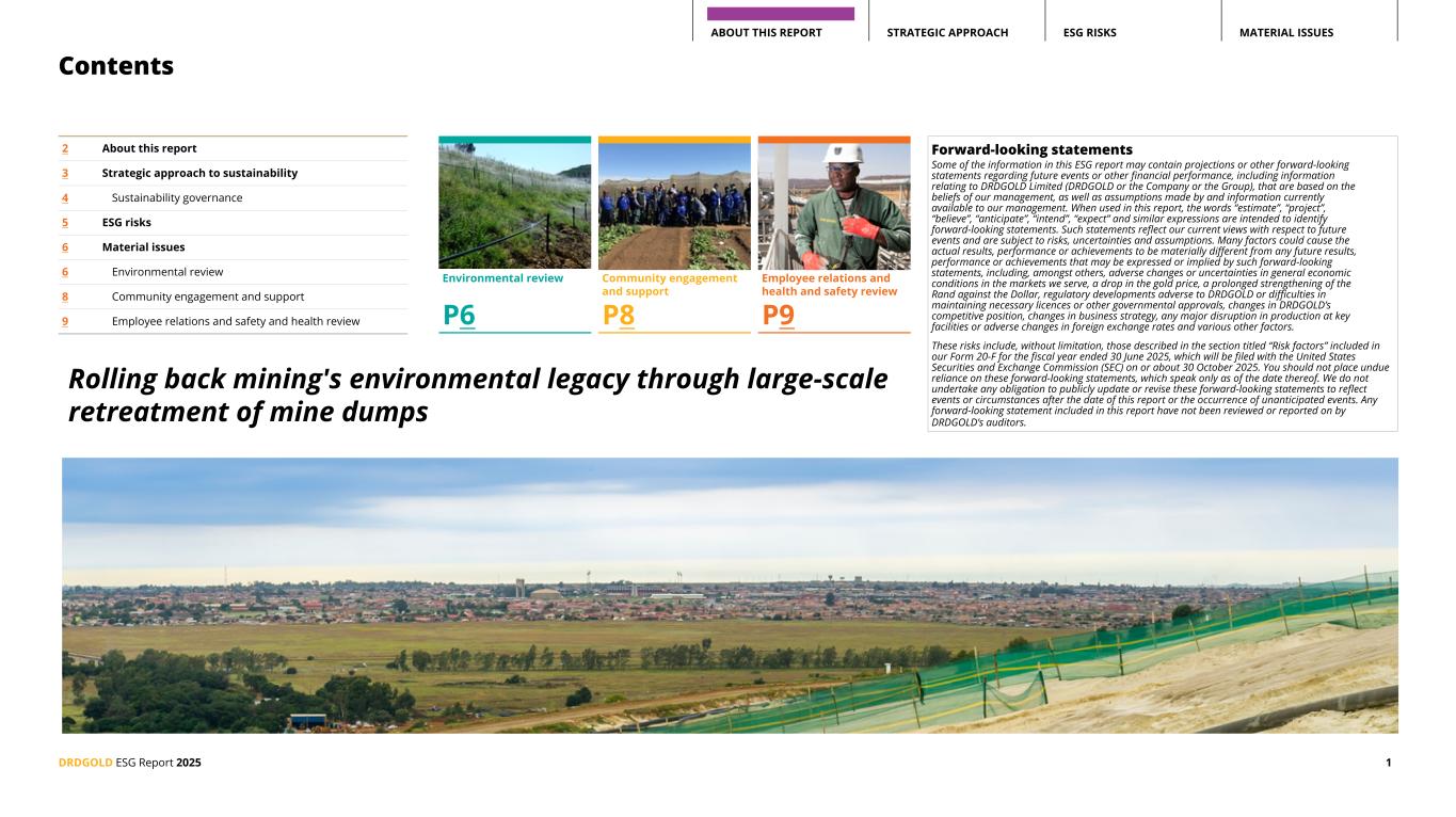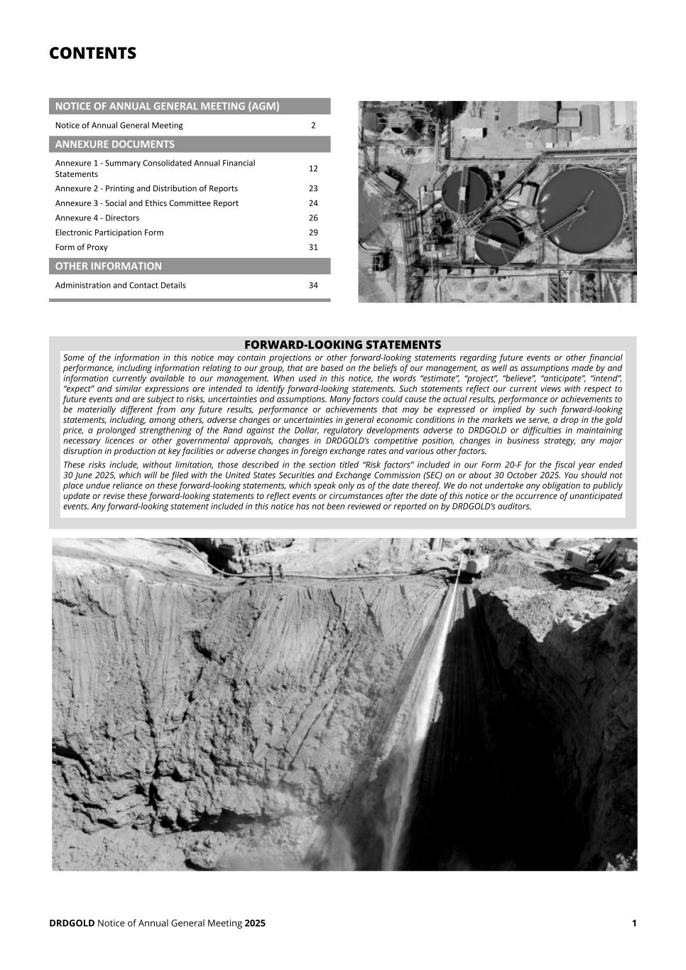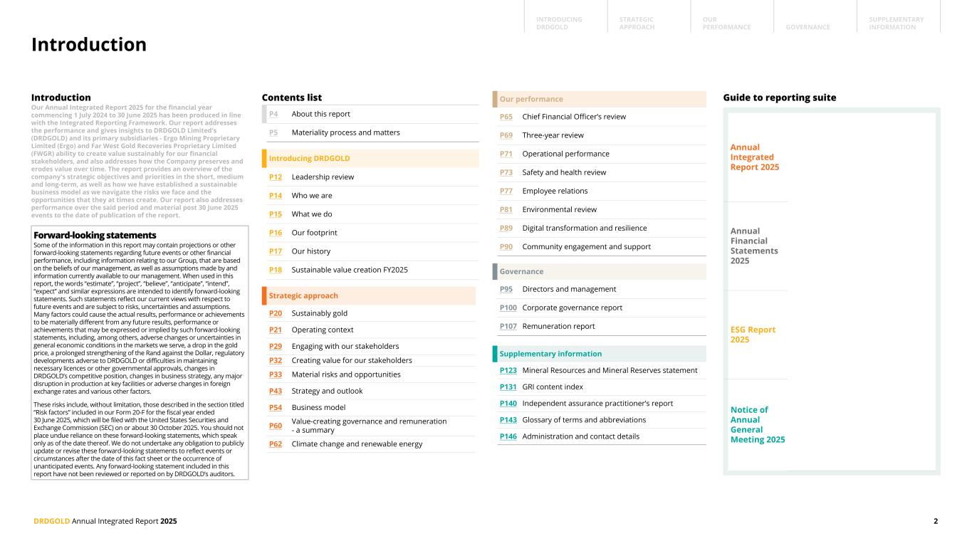 Introduction Our Annual Integrated Report 2025 for the financial year commencing 1 July 2024 to 30 June 2025 has been produced in line with the Integrated Reporting Framework. Our report addresses the performance and gives insights to DRDGOLD Limited's (DRDGOLD) and its primary subsidiaries - Ergo Mining Proprietary Limited (Ergo) and Far West Gold Recoveries Proprietary Limited (FWGR) ability to create value sustainably for our financial stakeholders, and also addresses how the Company preserves and erodes value over time. The report provides an overview of the company's strategic objectives and priorities in the short, medium and long-term, as well as how we have established a sustainable business model as we navigate the risks we face and the opportunities that they at times create. Our report also addresses performance over the said period and material post 30 June 2025 events to the date of publication of the report. Forward-looking statements Some of the information in this report may contain projections or other forward-looking statements regarding future events or other financial performance, including information relating to our Group, that are based on the beliefs of our management, as well as assumptions made by and information currently available to our management. When used in this report, the words “estimate”, “project”, “believe”, “anticipate”, “intend”, “expect” and similar expressions are intended to identify forward-looking statements. Such statements reflect our current views with respect to future events and are subject to risks, uncertainties and assumptions. Many factors could cause the actual results, performance or achievements to be materially different from any future results, performance or achievements that may be expressed or implied by such forward-looking statements, including, among others, adverse changes or uncertainties in general economic conditions in the markets we serve, a drop in the gold price, a prolonged strengthening of the Rand against the Dollar, regulatory developments adverse to DRDGOLD or difficulties in maintaining necessary licences or other governmental approvals, changes in DRDGOLD’s competitive position, changes in business strategy, any major disruption in production at key facilities or adverse changes in foreign exchange rates and various other factors. These risks include, without limitation, those described in the section titled “Risk factors” included in our Form 20-F for the fiscal year ended 30 June 2025, which will be filed with the United States Securities and Exchange Commission (SEC) on or about 30 October 2025. You should not place undue reliance on these forward-looking statements, which speak only as of the date thereof. We do not undertake any obligation to publicly update or revise these forward-looking statements to reflect events or circumstances after the date of this fact sheet or the occurrence of unanticipated events. Any forward-looking statement included in this report have not been reviewed or reported on by DRDGOLD’s auditors. Contents list P4 About this report P5 Materiality process and matters Introducing DRDGOLD P12 Leadership review P14 Who we are P15 What we do P16 Our footprint P17 Our history P18 Sustainable value creation FY2025 Strategic approach P20 Sustainably gold P21 Operating context P29 Engaging with our stakeholders P32 Creating value for our stakeholders P33 Material risks and opportunities P43 Strategy and outlook P54 Business model P60 Value-creating governance and remuneration - a summary P62 Climate change and renewable energy Our performance P65 Chief Financial Officer’s review P69 Three-year review P71 Operational performance P73 Safety and health review P77 Employee relations P81 Environmental review P89 Digital transformation and resilience P90 Community engagement and support Governance P95 Directors and management P100 Corporate governance report P107 Remuneration report Supplementary information P123 Mineral Resources and Mineral Reserves statement P131 GRI content index P140 Independent assurance practitioner’s report P143 Glossary of terms and abbreviations P146 Administration and contact details Guide to reporting suite Annual Integrated Report 2025 Annual Financial Statements 2025 ESG Report 2025 Notice of Annual General Meeting 2025 INTRODUCING DRDGOLD STRATEGIC APPROACH OUR PERFORMANCE GOVERNANCE SUPPLEMENTARY INFORMATION Introduction DRDGOLD Annual Integrated Report 2025 2