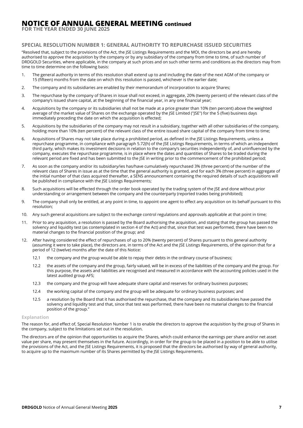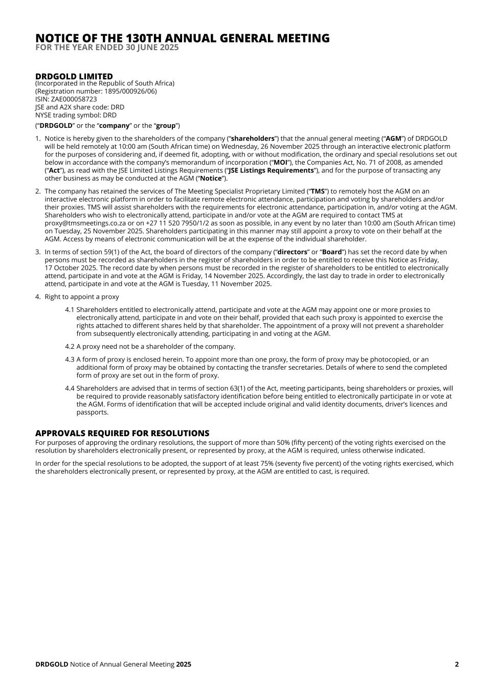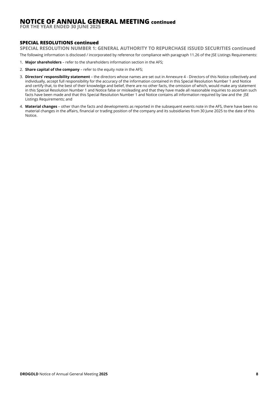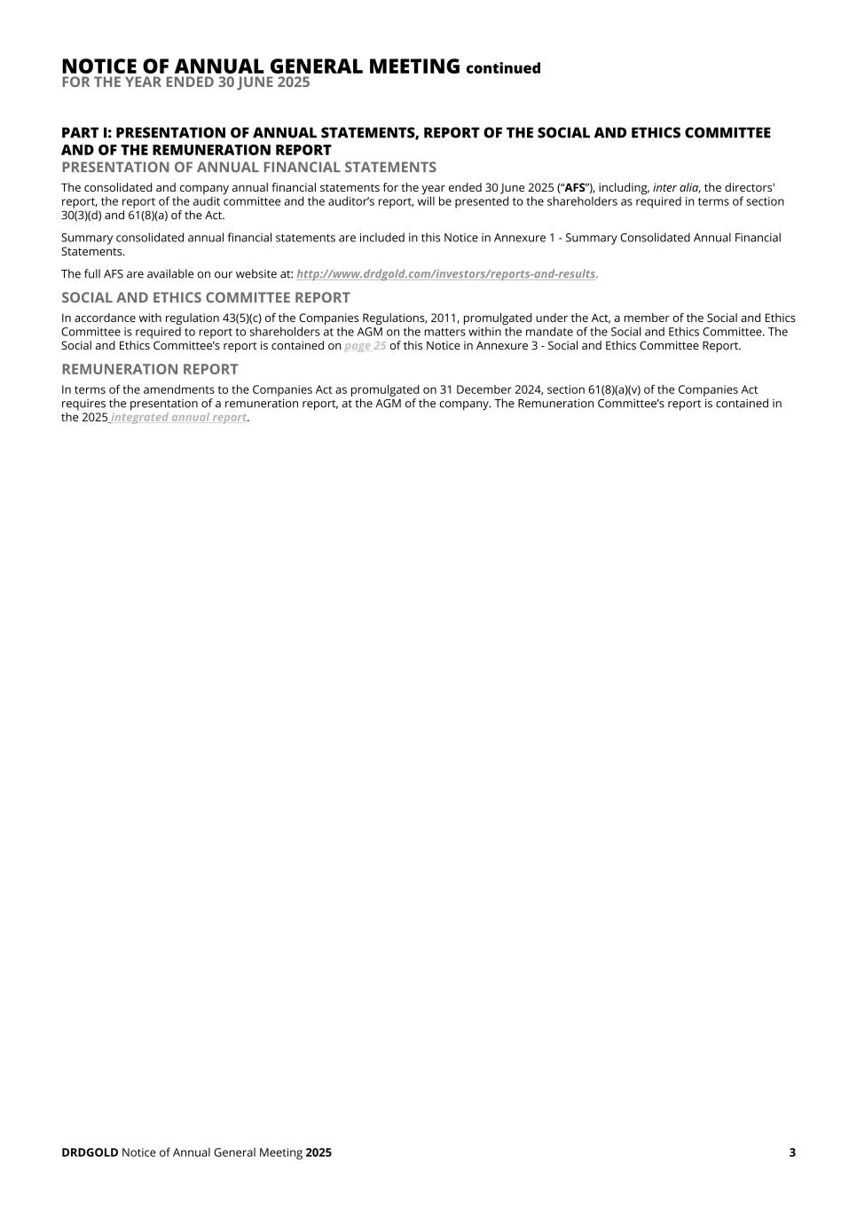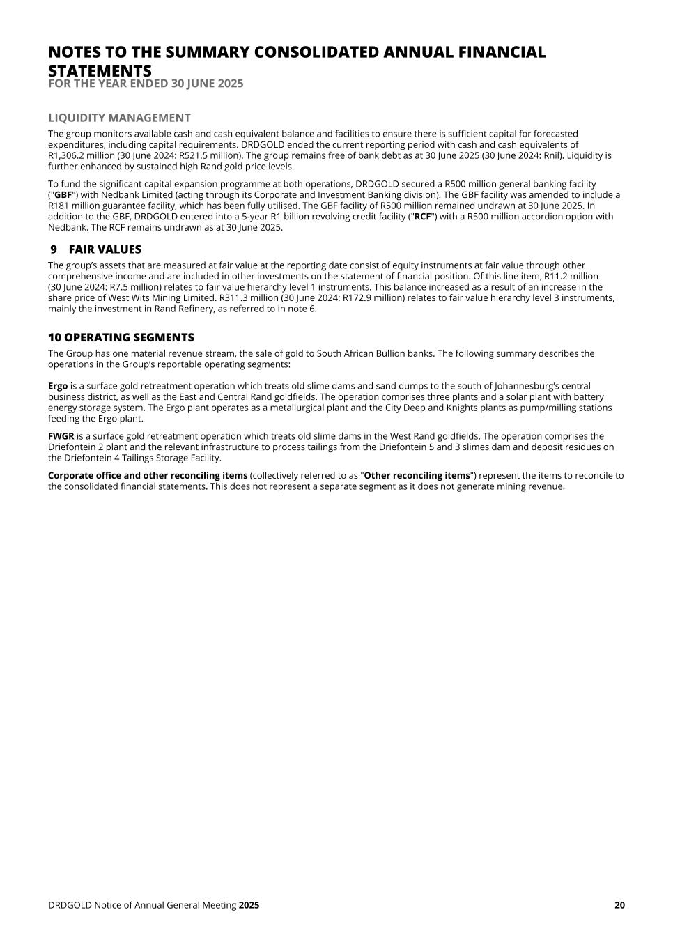 Introduction Our Annual Integrated Report 2025 for the financial year commencing 1 July 2024 to 30 June 2025 has been produced in line with the Integrated Reporting Framework. Our report addresses the performance and gives insights to DRDGOLD Limited's (DRDGOLD) and its primary subsidiaries - Ergo Mining Proprietary Limited (Ergo) and Far West Gold Recoveries Proprietary Limited (FWGR) ability to create value sustainably for our financial stakeholders, and also addresses how the Company preserves and erodes value over time. The report provides an overview of the company's strategic objectives and priorities in the short, medium and long-term, as well as how we have established a sustainable business model as we navigate the risks we face and the opportunities that they at times create. Our report also addresses performance over the said period and material post 30 June 2025 events to the date of publication of the report. Forward-looking statements Some of the information in this report may contain projections or other forward-looking statements regarding future events or other financial performance, including information relating to our Group, that are based on the beliefs of our management, as well as assumptions made by and information currently available to our management. When used in this report, the words “estimate”, “project”, “believe”, “anticipate”, “intend”, “expect” and similar expressions are intended to identify forward-looking statements. Such statements reflect our current views with respect to future events and are subject to risks, uncertainties and assumptions. Many factors could cause the actual results, performance or achievements to be materially different from any future results, performance or achievements that may be expressed or implied by such forward-looking statements, including, among others, adverse changes or uncertainties in general economic conditions in the markets we serve, a drop in the gold price, a prolonged strengthening of the Rand against the Dollar, regulatory developments adverse to DRDGOLD or difficulties in maintaining necessary licences or other governmental approvals, changes in DRDGOLD’s competitive position, changes in business strategy, any major disruption in production at key facilities or adverse changes in foreign exchange rates and various other factors. These risks include, without limitation, those described in the section titled “Risk factors” included in our Form 20-F for the fiscal year ended 30 June 2025, which will be filed with the United States Securities and Exchange Commission (SEC) on or about 30 October 2025. You should not place undue reliance on these forward-looking statements, which speak only as of the date thereof. We do not undertake any obligation to publicly update or revise these forward-looking statements to reflect events or circumstances after the date of this fact sheet or the occurrence of unanticipated events. Any forward-looking statement included in this report have not been reviewed or reported on by DRDGOLD’s auditors. Contents list P4 About this report P5 Materiality process and matters Introducing DRDGOLD P12 Leadership review P14 Who we are P15 What we do P16 Our footprint P17 Our history P18 Sustainable value creation FY2025 Strategic approach P20 Sustainably gold P21 Operating context P29 Engaging with our stakeholders P32 Creating value for our stakeholders P33 Material risks and opportunities P43 Strategy and outlook P54 Business model P60 Value-creating governance and remuneration - a summary P62 Climate change and renewable energy Our performance P65 Chief Financial Officer’s review P69 Three-year review P71 Operational performance P73 Safety and health review P77 Employee relations P81 Environmental review P89 Digital transformation and resilience P90 Community engagement and support Governance P95 Directors and management P100 Corporate governance report P107 Remuneration report Supplementary information P123 Mineral Resources and Mineral Reserves statement P131 GRI content index P140 Independent assurance practitioner’s report P143 Glossary of terms and abbreviations P146 Administration and contact details Guide to reporting suite Annual Integrated Report 2025 Annual Financial Statements 2025 ESG Report 2025 Notice of Annual General Meeting 2025 INTRODUCING DRDGOLD STRATEGIC APPROACH OUR PERFORMANCE GOVERNANCE SUPPLEMENTARY INFORMATION Introduction DRDGOLD Annual Integrated Report 2025 2