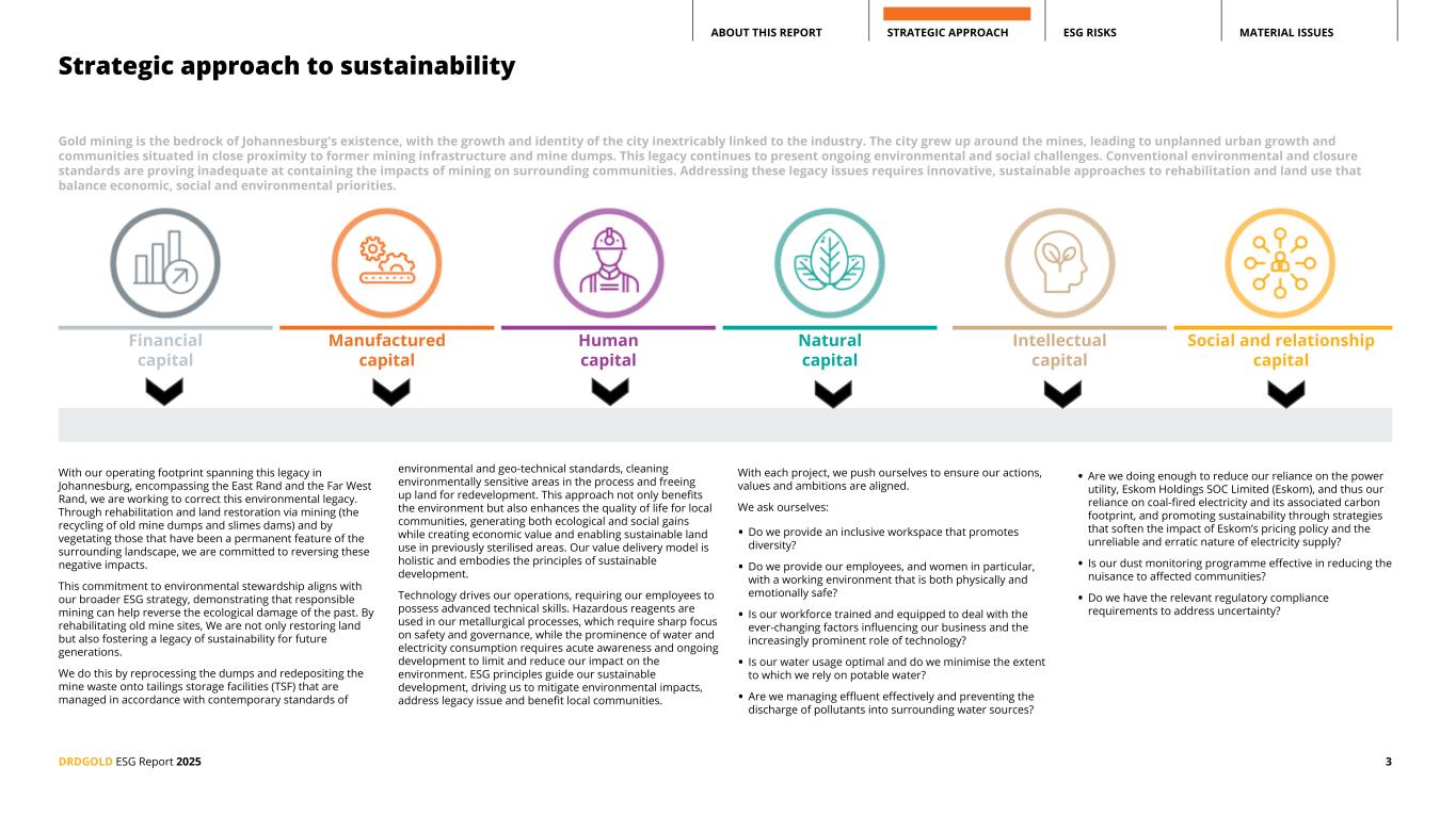 Below we show how our material themes and matters link to our strategic risks and opportunities, strategic priorities, related capitals and SDGs. Our material matters also inform the content of this integrated report and our ESG report and, where relevant, we provide a link to further information and discussion of the materiality topic in these reports. Financial capital Human resources Natural resources Manufactured assets Intellectual capital Social and relationship capital Environmental responsible operations Why is this important? Our purpose, vision and values place emphasis on “cleaning up the environment”. Environmental regeneration is central to our operating model. With every tonne we process, we create value from what was considered to be waste. Through this, we are limiting our footprint as well as reducing the affected impact and footprint of mining legacies – restoring land for productive use. It is important while doing so, that we contain the impact our operations have on nature and natural resources. We also recognise that climate change is a defining reality of this and the coming decades. While decarbonisation is a significant lever in our approach to climate change, we take an integrated, ecosystem-based approach that considers water usage and our impact on water bodies and biodiversity. Our approach encompasses the transition to renewable energy. Material matters Strategic risks and opportunities Strategic objectives Related Capitals Related SDGs To read more about this Responsible tailings management Tailings management • Reduce our burden on the environment by investing in ongoing initiatives to maintain potable water consumption to 10% or lower of total water • Reduce carbon footprint to combat climate change physical risks • Decrease our reliance on Eskom, by investing in technologies to increase electricity efficiencies, particularly at our plants and related pipeline and pump station infrastructure Material risks and opportunities, page 33 Responsible water use and supply security Potable water scarcity and access and cost to secondary water sources (contaminated water) Water technology Material risks and opportunities, page 35 Climate change and renewable energy, page 62-63 Energy efficiency and carbon management Eskom supply Material risks and opportunities, page 35 Pollution prevention and waste control Enable biodiversity and land conservation initiatives Climate change page 40 Rehabilitation page 82 Climate change resilience (incl. physical and transitional impacts) Climate change transition risk Opportunities and risk reward page 41 Climate change and renewable energy page 62 Operational sustainability and growth Our strategy is also driven by operational sustainability and growth. Therefore, our business model is centred around optimisation, long-term profitability, operational efficiency, embedding resilience and value driven capital investments. Both our operations require new tailings deposition capacity to sustain and optimise their operating lives. To address this a medium-term strategic plan, Vision 2028 which entails the substantial investment of capital to establish the necessary infrastructure to expand FWGR and sustain Ergo. Critical success factors are to responsibly steer capital investment and to successfully execute these significant projects. We also aspire to play a leading role in consolidating tailings operations in South Africa and exploring for international opportunities. Given the volatile global economic and political environment, it is critical to make the right capital allocation decisions within our risk appetite boundaries to ensure success. Material matters Strategic risks and opportunities Strategic objectives Related capitals Related SDGs To read more about this Pursuing operational sustainability and growth objectives through increased tailings capacity Limited tailings deposition facilities Additional TSF capacity unlocks further growth potential • Acquisition of assets, including expanding into Africa and beyond and other metals • Expansion of Mineral Reserves and tailings storage facilities (TSFs) to maintain current volume throughput and potentially increase current life of mines Capital project progress / execution risk page 39 Capital allocations Capital project progress/ project execution risk Capital project progress / execution risk page 39 Legend Strategic risks Strategic opportunities INTRODUCING DRDGOLD STRATEGIC APPROACH OUR PERFORMANCE GOVERNANCE SUPPLEMENTARY INFORMATION Materiality process and matters continued DRDGOLD Annual Integrated Report 2025 7