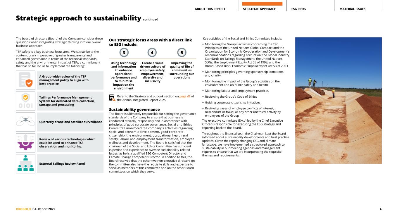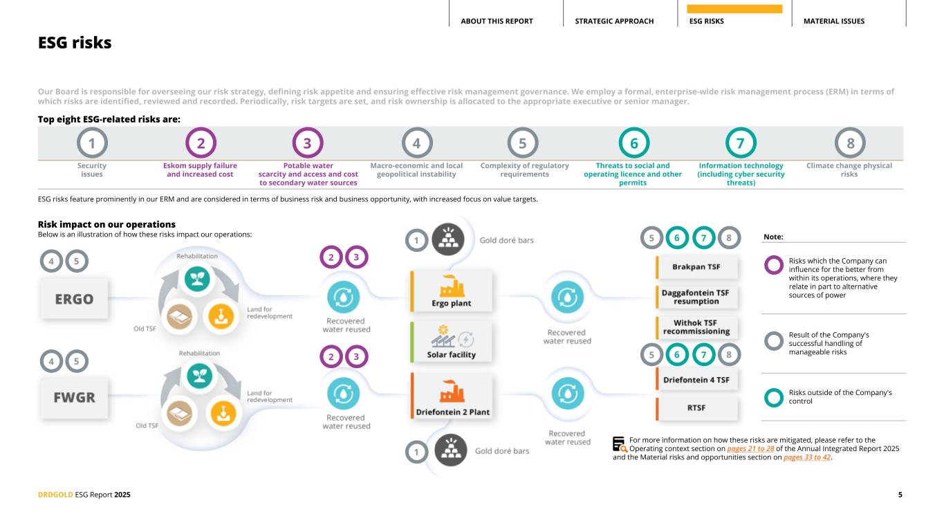 1. Limited tailings storage capacity Linked material matters / opportunities Risk context and potential impacts Risk response Material matters: Pursuing operational sustainability and growth objectives through increase of tailings capacity Responsible tailings management Opportunities: Additional TSF capacity unlocks further growth potential The sustainability and optimisation of both our operations is dependent on sufficient tailings deposition facilities to deposit processed material. Existing tailings facilities at both our operations are mature and are approaching the limits of their capacity at current deposit rates. The size and scale of these facilities also place them in a category of dams that is subject to strict and complex regulatory regime that requires amongst other things regular safety audit reports be compiled and submitted to the dam safety regulator, who may impose additional conditions or restrictions on such facilities. The timing of having new facilities in place is critical to avoid having to reduce deposition rates or even halt deposition which will have an adverse financial impact on our business. Construction of the Regional Tailings Storage Facility (RTSF) is progressing well. In line with the life of mine plan modelling, beneficial occupation of the facility is targeted for the first quarter of FY2027. Legal and regulatory processes for the recommissioning of the Withok TSF at Ergo are underway.As an interim, deposition will resume on Daggafontein - a former tailings facility, that is in the process of being recommissioned. Related strategic focus areas: Capitals impacted: Oversight • Social and Ethics Committee • Board 2. Country / political risk Linked material matters / opportunities Risk context and potential impact Risk response Material matters: Macro-economic and local and geopolitical volatility Opportunities: Alternative renewable energy solutions Water technology The formation of the GNU in 2024, together with reduced power outages, is fostering cautious optimism for economic growth. Recent sovereign rating updates also affirmed a stable to positive outlook however, indicated that ratings upgrades would depend on sustained growth and fiscal discipline. Despite this, it remains challenging to operate within the local South African context due to ongoing leadership struggles within the GNU, which lead to unpredictable policy / regulatory changes. Together with corruption, systemic failures, ongoing public infrastructure challenges and poor service delivery, eroding public trust and social tensions are continuously exacerbated. All these factors are contributing to the key risks recognised by the Group. Uncertainty within the South African political and economic context may impact business and investor confidence. Given the volatility of the South African operating context, the Company has an agile capital investment and business approach. Through participation in forums with local communities, industry and government, we remain abreast of political matters. It also adds to the strengthening of relationships with these key stakeholders. Further strategies such as implementation of alternative power generation, flexibility of resources, services and supplies are also implemented to address key risks linked to operating within the South African context. Related strategic focus areas: Capitals impacted: Oversight • Board Our strategic focus areas Grow the business by replicating our business model - looking at expanding into Africa and beyond and other metals. Optimally, profitably and sustainably mine our large surface gold resource Use technology and information to enhance operational performance, minimise impact on the environment Create a value-driven culture of employee safety, empowerment, diversity and inclusion Improve quality of life in communities surrounding our operations To read more on our strategy, see the section Strategy and outlook from page 43. INTRODUCING DRDGOLD STRATEGIC APPROACH OUR PERFORMANCE GOVERNANCE SUPPLEMENTARY INFORMATION Material risks and opportunities continued DRDGOLD Annual Integrated Report 2025 35 1 2 1 2 4 1 2 3 4 5