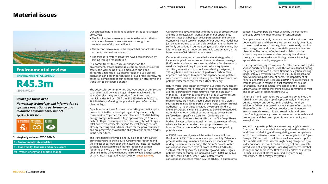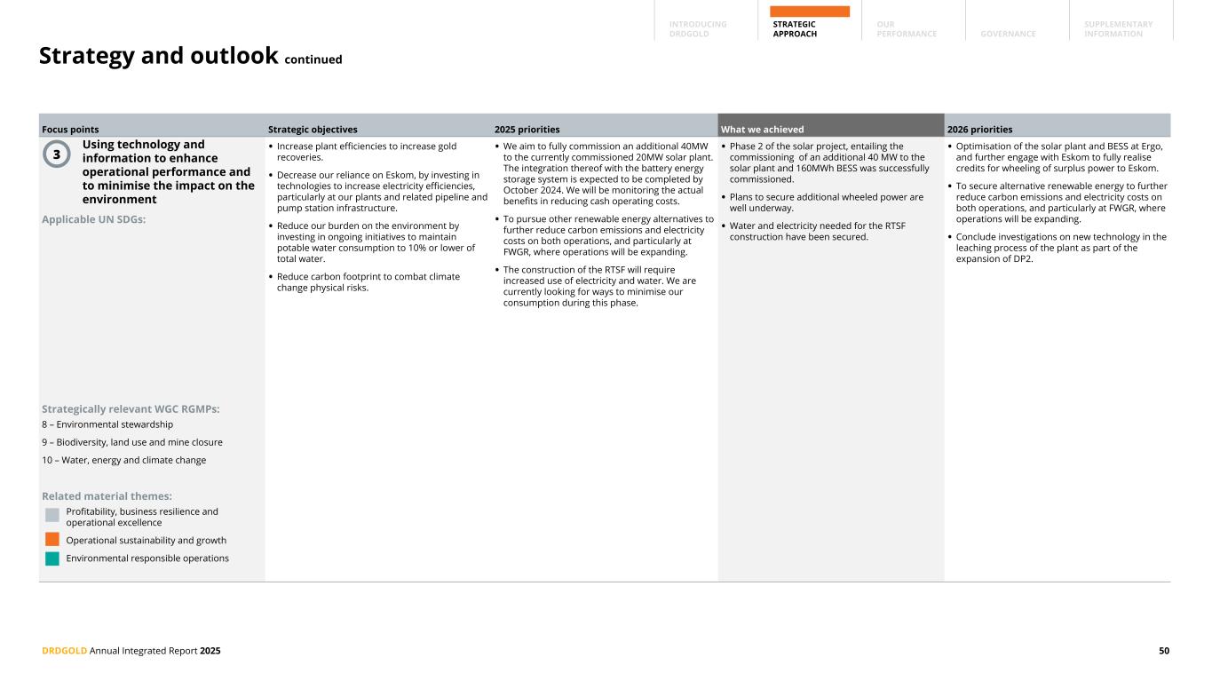 Focus points Strategic objectives 2025 priorities What we achieved 2026 priorities Using technology and information to enhance operational performance and to minimise the impact on the environment Applicable UN SDGs: Strategically relevant WGC RGMPs: 8 – Environmental stewardship 9 – Biodiversity, land use and mine closure 10 – Water, energy and climate change Related material themes: Profitability, business resilience and operational excellence Operational sustainability and growth Environmental responsible operations • Increase plant efficiencies to increase gold recoveries. • Decrease our reliance on Eskom, by investing in technologies to increase electricity efficiencies, particularly at our plants and related pipeline and pump station infrastructure. • Reduce our burden on the environment by investing in ongoing initiatives to maintain potable water consumption to 10% or lower of total water. • Reduce carbon footprint to combat climate change physical risks. • We aim to fully commission an additional 40MW to the currently commissioned 20MW solar plant. The integration thereof with the battery energy storage system is expected to be completed by October 2024. We will be monitoring the actual benefits in reducing cash operating costs. • To pursue other renewable energy alternatives to further reduce carbon emissions and electricity costs on both operations, and particularly at FWGR, where operations will be expanding. • The construction of the RTSF will require increased use of electricity and water. We are currently looking for ways to minimise our consumption during this phase. • Phase 2 of the solar project, entailing the commissioning of an additional 40 MW to the solar plant and 160MWh BESS was successfully commissioned. • Plans to secure additional wheeled power are well underway. • Water and electricity needed for the RTSF construction have been secured. • Optimisation of the solar plant and BESS at Ergo, and further engage with Eskom to fully realise credits for wheeling of surplus power to Eskom. • To secure alternative renewable energy to further reduce carbon emissions and electricity costs on both operations, and particularly at FWGR, where operations will be expanding. • Conclude investigations on new technology in the leaching process of the plant as part of the expansion of DP2. INTRODUCING DRDGOLD STRATEGIC APPROACH OUR PERFORMANCE GOVERNANCE SUPPLEMENTARY INFORMATION Strategy and outlook continued DRDGOLD Annual Integrated Report 2025 50 3