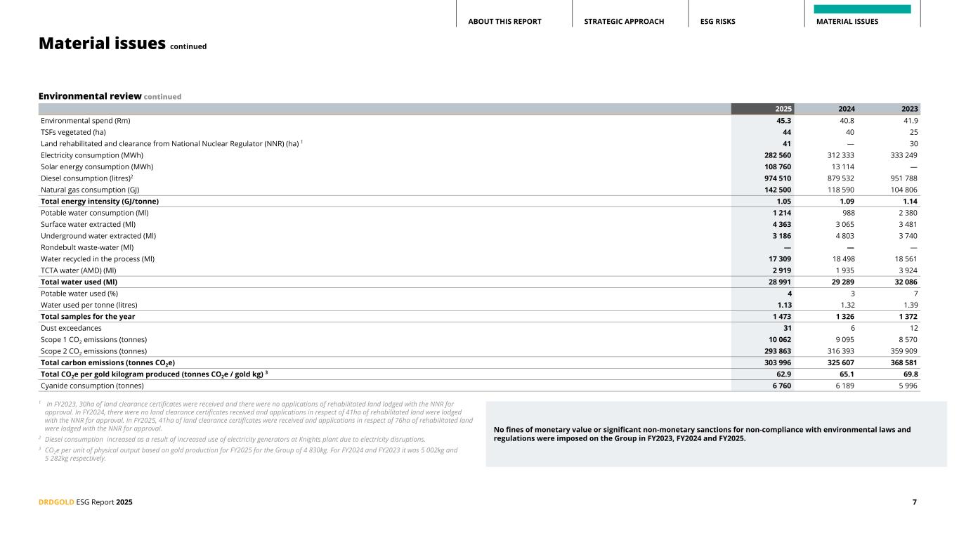 Freshwater consumption sources1 2025 2024 Cinderella dam MI 957 736 Rosherville dam MI 3 406 2 329 Total surface water extracted MI 4 363 3 065 1 Freshwater is water that contains only minimal quantities of dissolved salts thus distinguishing it from sea water. All freshwater ultimately comes from precipitation of atmospheric water vapour, reaching inland lakes and groundwater bodies directly, or after melting of snow or ice. Freshwater consumption intensity 2025 2024 Gold production kg 4 830 5 002 Surface water extracted MI 4 363 3 065 Total surface water use per kg produced MI/kg 0.90 0.61 Refer to www.drdgold.com for details on our views of AMD and the agreement with TCTA. Total figures include only Ergo and FWGR operations. Figures for corporate have not been included as they are not deemed to be significant. Water pollution Environmental stewardship is critical to both our operations, and we have taken preventative as well as remedial actions, as previously mentioned in the water and wastewater management section on page 82, to minimise water discharge to the environment. Any affected water discharge is contained either through paddocks on reclaimed sites, storm water run-off and water systems that pump rain or excess water into the system. Another possible source of water discharge is attributed mainly to compromised or ageing piping that may cause leaks. As one of our preventative actions to avoid water discharge through compromised pipelines, we have an external independent expert who continuously inspects and monitors our pipelines to identify any water leaks to minimise affected water and slurry discharges to the environment. In addition, we have a comprehensive pipeline maintenance plan in place for replacing any compromised pipelines and the maintenance crew ensures that any identified leaks are attended to as soon as possible, as water is critical for reclamation on our sites. In our annual financial statements (AFS) for the year ended 30 June 2025, we have disclosed a contingent liability for environmental rehabilitation for the potential pollution impact on groundwater through seepage. For more information on the contingent liability, please refer to the AFS 2025 on our website: https://www.drdgold.com/investors/reports-and-results#ars2025 Dust monitoring Our operations naturally generate dust and are situated near populated areas therefore we remain deeply committed to being considerate of our neighbours. We closely monitor and manage dust and other potential impacts to minimise disruption. The impact of nuisance dust fallout on the surrounding environment and community is addressed through a comprehensive monitoring network including appropriate community engagements. Dust samples analysis is done through an independent accredited laboratory and the monitoring reports are sent to regulators, municipalities, and interested and affected parties. For residential zoned monitoring buckets, an exceedance is defined as above the dust fallout limit of 600mg/m2/day. For non-residential zoned monitoring buckets, an exceedance is defined as above the dust fallout limit of 1 200mg/m2/day. Dust exceedances per type of area Ergo FWGR Residential area 25 — Non-residential area 4 2 Total dust exceedances 29 2 Ergo 2025 2024 Total samples for the year 1 263 LA 1 147 LA Total dust exceedances 29 LA 4 LA Percentage % 2.30 0.35 LA Limited assurance FWGR 2025 2024 Total samples for the year 210 LA 179 LA Total dust exceedances 2 LA 2 LA Percentage % 0.95 1.12 LA Limited assurance At Ergo, 1 263 dust monitoring samples were analysed during the year (FY2024: 1 147), and 29 exceedances were detected (FY2024: 4). Some 210 dust monitoring samples were analysed at FWGR (FY2024: 179) and 2 exceedances were detected (FY2024: 2). The increase in dust exceedances was due to three main factors: extended periods of dry and windy weather, a rise in the number of sites opened for reclamation at Ergo, and a 9% increase in the total number of samples collected from 1 326 to 1 451. We will continue to monitor dust-fallout with the aim of reducing the dust exceedances through our rehabilitation programmes and mitigation measures, such as intensifying the application of environmentally friendly dust suppressants in high- impact areas and active wetting of access roads by water tankers. An amount of R21.5 million (FY2024: R22.9 million) was spent on dust monitoring and mitigation measures during the year. It is very encouraging to have our ESG efforts acknowledged in various quarters. At a global level, this was evidenced during the year by a visit from a United Nations delegation seeking insight into our INTRODUCING DRDGOLD STRATEGIC APPROACH OUR PERFORMANCE GOVERNANCE SUPPLEMENTARY INFORMATION Environmental review continued DRDGOLD Annual Integrated Report 2025 84