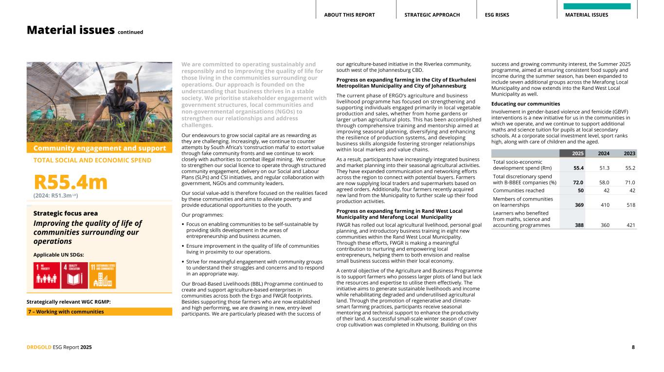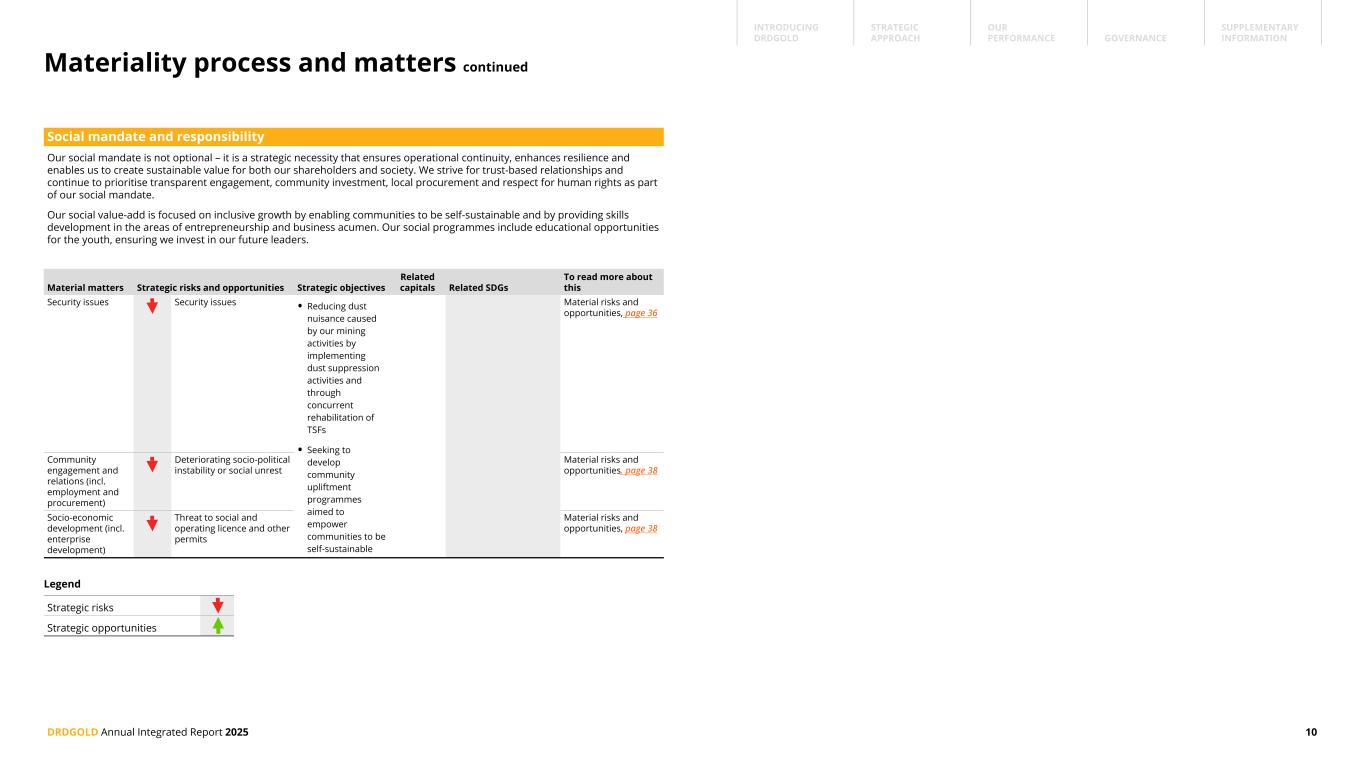 Social mandate and responsibility Our social mandate is not optional – it is a strategic necessity that ensures operational continuity, enhances resilience and enables us to create sustainable value for both our shareholders and society. We strive for trust-based relationships and continue to prioritise transparent engagement, community investment, local procurement and respect for human rights as part of our social mandate. Our social value-add is focused on inclusive growth by enabling communities to be self-sustainable and by providing skills development in the areas of entrepreneurship and business acumen. Our social programmes include educational opportunities for the youth, ensuring we invest in our future leaders. Material matters Strategic risks and opportunities Strategic objectives Related capitals Related SDGs To read more about this Security issues Security issues • Reducing dust nuisance caused by our mining activities by implementing dust suppression activities and through concurrent rehabilitation of TSFs • Seeking to develop community upliftment programmes aimed to empower communities to be self-sustainable Material risks and opportunities, page 36 Community engagement and relations (incl. employment and procurement) Deteriorating socio-political instability or social unrest Material risks and opportunities, page 38 Socio-economic development (incl. enterprise development) Threat to social and operating licence and other permits Material risks and opportunities, page 38 Legend Strategic risks Strategic opportunities INTRODUCING DRDGOLD STRATEGIC APPROACH OUR PERFORMANCE GOVERNANCE SUPPLEMENTARY INFORMATION Materiality process and matters continued DRDGOLD Annual Integrated Report 2025 10