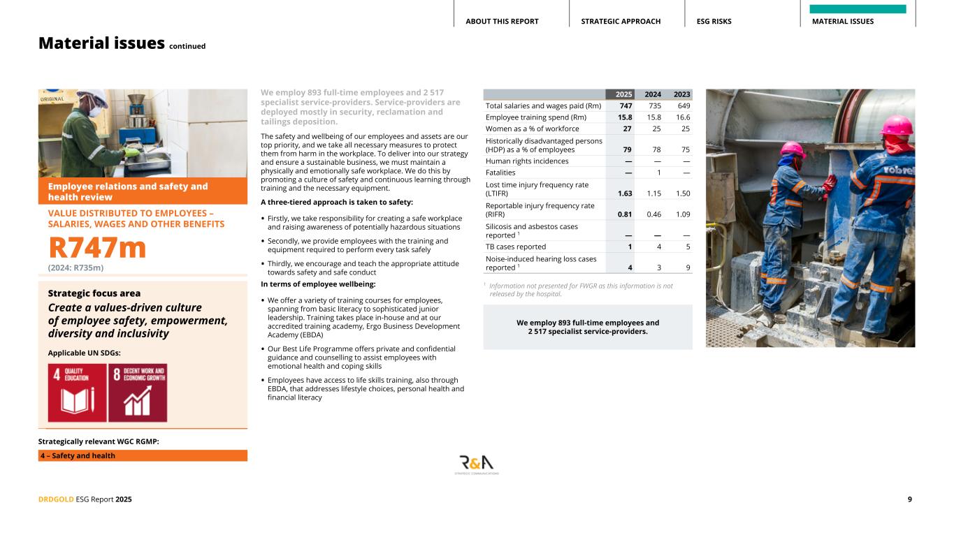 From impact to advantage: The strategic value of nature in mining We recognise that environmental consciousness is not just a responsibility - it is a source of competitive advantage. By embedding biodiversity, ecosystem stewardship, and sustainable land management into every stage of our operations, we are not only safeguarding the natural capital our business depends on, but also translating the protection of the environment into measurable financial and reputational returns – demonstrating that sustainability and profitability are mutually inclusive. Through our re-mining and concurrent rehabilitation activities of tailings dams, we have seen vegetation recover and wildlife naturally begin to return. We have also reintroduced larger game species, including zebra, blesbok, wildebeest, sable and red hartebeest into a fenced area of rehabilitated land. Beyond environmental recovery, this initiative is part of a broader strategy that serves as a symbol of green revival in Johannesburg. Material matters Strategic risks and opportunities Strategic objectives Related capitals Related SDGs To read more about this Pro-active rehabilitation and responsible mine closure Enable biodiversity and land conservation initiatives • Reducing dust nuisance caused by our mining activities by implementing dust suppression activities and through concurrent rehabilitation of TSFs Environmental review, page 82 Biodiversity and land conservation Environmental review, page 82 Managing human capital We recognise that our people are our greatest asset, and because of this, we are committed to creating a positive, inclusive environment where every team member feels respected and valued. Central to this commitment is embedding a values-driven culture of safety, mutual respect, empowerment, resilience, diversity, and the collective desire for not only the Company to succeed but also our employees. We prioritise the mental wellness and emotional wellbeing of our employees and understand that a healthy, balanced workforce is critical to both individual fulfilment and organisational success. Material matters Strategic risks and opportunities Strategic objectives Related capitals Related SDGs To read more about this Employee health, safety and wellbeing (incl. fair and equitable remuneration) Mental wellbeing of employees • Continue with comprehensive risk assessments on our operations to eliminate fatalities and reducing reportable injury frequency rate (RIFR) and lost time injury frequency rate (LTIFR) to below standard deviation of preceding five-year rolling average Safety and health review, page 73 to 75 Employee relations, recruitment page 79 Employee growth and development (incl. diversity and inclusion) Skills retention / Scarcity of critical skills • Implement fair remuneration policies Employee relations, recruitment page 79 Respecting human rights Supply chain risks Mental wellbeing of employees • Investing in training and development programmes for our employees as well as awareness on adverse societal issues and the importance of well- being Employee relations, page 77 to 80 Legend Strategic risks Strategic opportunities INTRODUCING DRDGOLD STRATEGIC APPROACH OUR PERFORMANCE GOVERNANCE SUPPLEMENTARY INFORMATION Materiality process and matters continued DRDGOLD Annual Integrated Report 2025 8