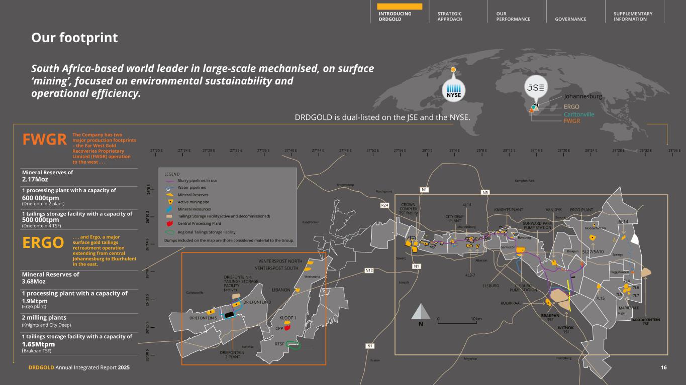 South Africa-based world leader in large-scale mechanised, on surface ‘mining’, focused on environmental sustainability and operational efficiency. INTRODUCING DRDGOLD STRATEGIC APPROACH OUR PERFORMANCE GOVERNANCE SUPPLEMENTARY INFORMATION Our footprint DRDGOLD Annual Integrated Report 2025 16 DRDGOLD is dual-listed on the JSE and the NYSE. ERGO . . . and Ergo, a major surface gold tailings retreatment operation extending from central Johannesburg to Ekurhuleni in the east. Mineral Reserves of 3.68Moz 1 processing plant with a capacity of 1.9Mtpm (Ergo plant) 2 milling plants (Knights and City Deep) 1 tailings storage facility with a capacity of 1.65Mtpm (Brakpan TSF) FWGR The Company has two major production footprints – the Far West Gold Recoveries Proprietary Limited (FWGR) operation to the west . . . Mineral Reserves of 2.17Moz 1 processing plant with a capacity of 600 000tpm (Driefontein 2 plant) 1 tailings storage facility with a capacity of 500 000tpm (Driefontein 4 TSF)