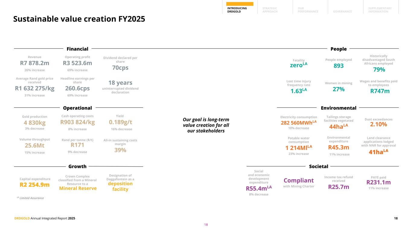 Financial People Revenue R7 878.2m 26% increase Operating profit R3 523.6m 69% increase Dividend declared per share 70cps Fatality zeroLA People employed 893 Historically disadvantaged South Africans employed 79% Average Rand gold price received R1 632 275/kg 31% increase Headline earnings per share 260.6cps 69% increase 18 years uninterrupted dividend declaration Lost time injury frequency rate 1.63LA Women in mining 27% Wages and benefits paid to employees R747m Operational Environmental Gold production 4 830kg 3% decrease Cash operating costs R903 824/kg 8% increase Yield 0.189g/t 16% decrease Electricity consumption 282 560MWhLA 10% decrease Tailings storage facilities vegetated 44haLA Dust exceedances 2.10% Volume throughput 25.6Mt 15% increase Rand per tonne (R/t) R171 9% decrease All-in sustaining costs margin 39% Potable water consumption 1 214MlLA 23% increase Environmental expenditure R45.3m 11% increase Land clearance applications lodged with NNR for approval 41haLA Growth Societal Capital expenditure R2 254.9m Crown Complex classified from a Mineral Resource to a Mineral Reserve Designation of Daggafontein as a deposition facility Social and economic development expenditure R55.4mLA 8% decrease Compliant with Mining Charter Income tax refund received R25.7m PAYE paid R231.1m 11% increase INTRODUCING DRDGOLD STRATEGIC APPROACH OUR PERFORMANCE GOVERNANCE SUPPLEMENTARY INFORMATION Sustainable value creation FY2025 DRDGOLD Annual Integrated Report 2025 18 18 LA Limited Assurance Our goal is long-term value creation for all our stakeholders