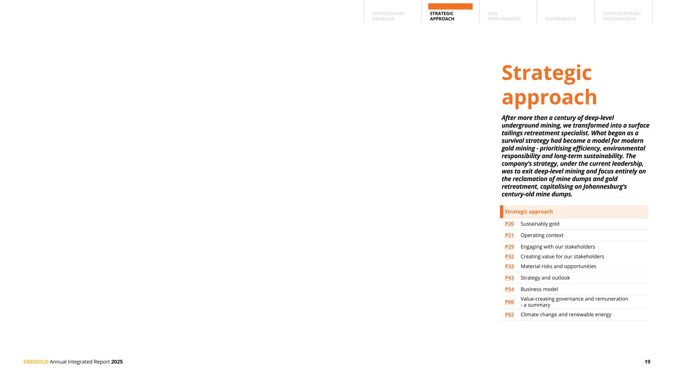 Strategic approach After more than a century of deep-level underground mining, we transformed into a surface tailings retreatment specialist. What began as a survival strategy had become a model for modern gold mining - prioritising efficiency, environmental responsibility and long-term sustainability. The company’s strategy, under the current leadership, was to exit deep-level mining and focus entirely on the reclamation of mine dumps and gold retreatment, capitalising on Johannesburg’s century-old mine dumps. Strategic approach P20 Sustainably gold P21 Operating context P29 Engaging with our stakeholders P32 Creating value for our stakeholders P33 Material risks and opportunities P43 Strategy and outlook P54 Business model P60 Value-creating governance and remuneration - a summary P62 Climate change and renewable energy INTRODUCING DRDGOLD STRATEGIC APPROACH OUR PERFORMANCE GOVERNANCE SUPPLEMENTARY INFORMATION DRDGOLD Annual Integrated Report 2025 19