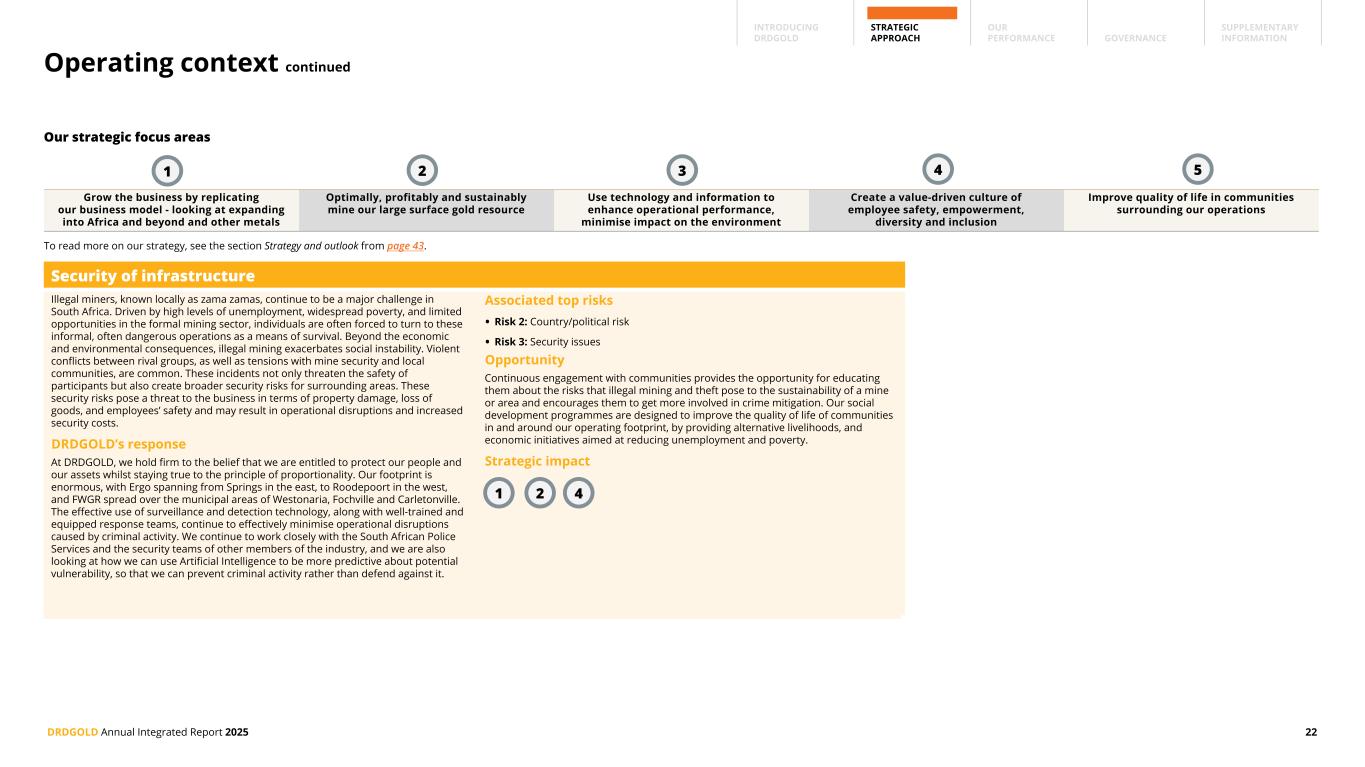 Our strategic focus areas Grow the business by replicating our business model - looking at expanding into Africa and beyond and other metals Optimally, profitably and sustainably mine our large surface gold resource Use technology and information to enhance operational performance, minimise impact on the environment Create a value-driven culture of employee safety, empowerment, diversity and inclusion Improve quality of life in communities surrounding our operations To read more on our strategy, see the section Strategy and outlook from page 43. Security of infrastructure Illegal miners, known locally as zama zamas, continue to be a major challenge in South Africa. Driven by high levels of unemployment, widespread poverty, and limited opportunities in the formal mining sector, individuals are often forced to turn to these informal, often dangerous operations as a means of survival. Beyond the economic and environmental consequences, illegal mining exacerbates social instability. Violent conflicts between rival groups, as well as tensions with mine security and local communities, are common. These incidents not only threaten the safety of participants but also create broader security risks for surrounding areas. These security risks pose a threat to the business in terms of property damage, loss of goods, and employees’ safety and may result in operational disruptions and increased security costs. DRDGOLD’s response At DRDGOLD, we hold firm to the belief that we are entitled to protect our people and our assets whilst staying true to the principle of proportionality. Our footprint is enormous, with Ergo spanning from Springs in the east, to Roodepoort in the west, and FWGR spread over the municipal areas of Westonaria, Fochville and Carletonville. The effective use of surveillance and detection technology, along with well-trained and equipped response teams, continue to effectively minimise operational disruptions caused by criminal activity. We continue to work closely with the South African Police Services and the security teams of other members of the industry, and we are also looking at how we can use Artificial Intelligence to be more predictive about potential vulnerability, so that we can prevent criminal activity rather than defend against it. Associated top risks • Risk 2: Country/political risk • Risk 3: Security issues Opportunity Continuous engagement with communities provides the opportunity for educating them about the risks that illegal mining and theft pose to the sustainability of a mine or area and encourages them to get more involved in crime mitigation. Our social development programmes are designed to improve the quality of life of communities in and around our operating footprint, by providing alternative livelihoods, and economic initiatives aimed at reducing unemployment and poverty. Strategic impact INTRODUCING DRDGOLD STRATEGIC APPROACH OUR PERFORMANCE GOVERNANCE SUPPLEMENTARY INFORMATION Operating context continued DRDGOLD Annual Integrated Report 2025 22 1 2 1 2 3 4 5 4