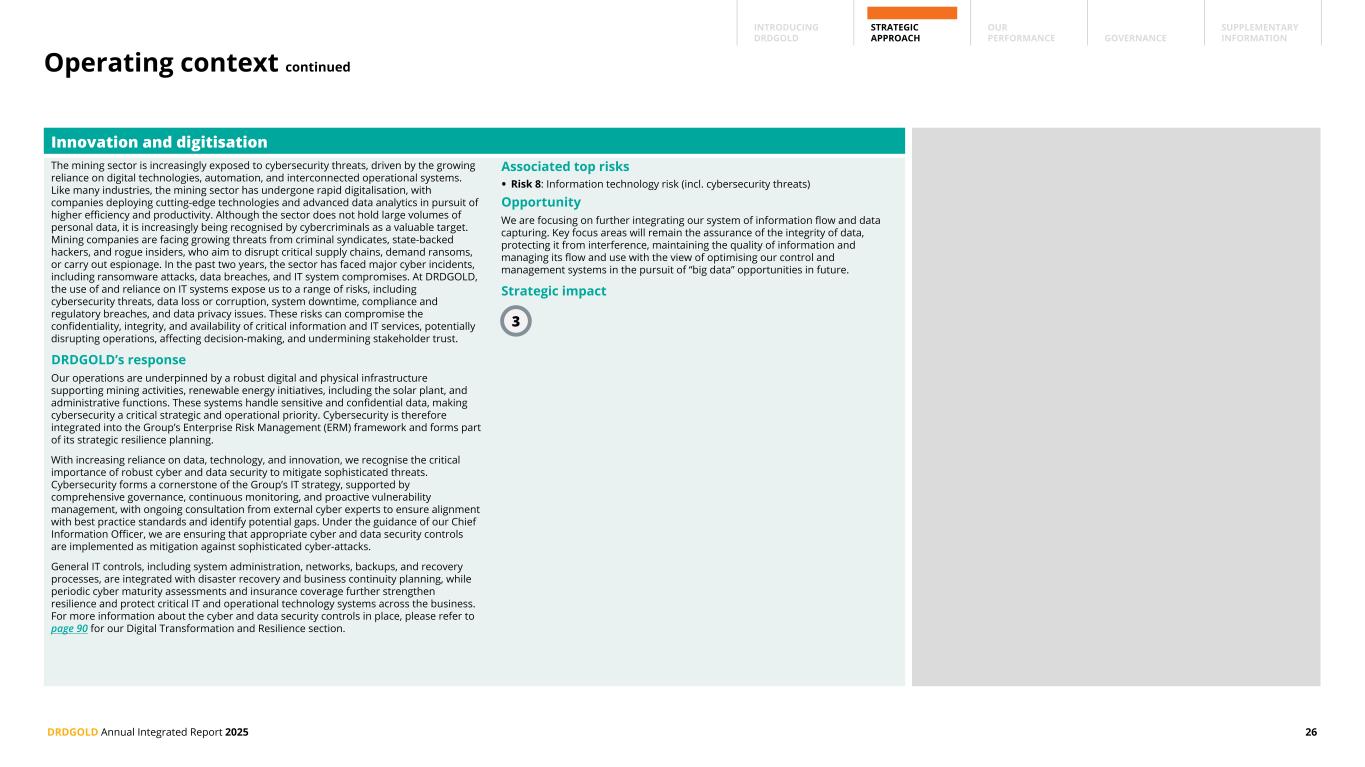 Innovation and digitisation The mining sector is increasingly exposed to cybersecurity threats, driven by the growing reliance on digital technologies, automation, and interconnected operational systems. Like many industries, the mining sector has undergone rapid digitalisation, with companies deploying cutting-edge technologies and advanced data analytics in pursuit of higher efficiency and productivity. Although the sector does not hold large volumes of personal data, it is increasingly being recognised by cybercriminals as a valuable target. Mining companies are facing growing threats from criminal syndicates, state-backed hackers, and rogue insiders, who aim to disrupt critical supply chains, demand ransoms, or carry out espionage. In the past two years, the sector has faced major cyber incidents, including ransomware attacks, data breaches, and IT system compromises. At DRDGOLD, the use of and reliance on IT systems expose us to a range of risks, including cybersecurity threats, data loss or corruption, system downtime, compliance and regulatory breaches, and data privacy issues. These risks can compromise the confidentiality, integrity, and availability of critical information and IT services, potentially disrupting operations, affecting decision-making, and undermining stakeholder trust. DRDGOLD’s response Our operations are underpinned by a robust digital and physical infrastructure supporting mining activities, renewable energy initiatives, including the solar plant, and administrative functions. These systems handle sensitive and confidential data, making cybersecurity a critical strategic and operational priority. Cybersecurity is therefore integrated into the Group’s Enterprise Risk Management (ERM) framework and forms part of its strategic resilience planning. With increasing reliance on data, technology, and innovation, we recognise the critical importance of robust cyber and data security to mitigate sophisticated threats. Cybersecurity forms a cornerstone of the Group’s IT strategy, supported by comprehensive governance, continuous monitoring, and proactive vulnerability management, with ongoing consultation from external cyber experts to ensure alignment with best practice standards and identify potential gaps. Under the guidance of our Chief Information Officer, we are ensuring that appropriate cyber and data security controls are implemented as mitigation against sophisticated cyber-attacks. General IT controls, including system administration, networks, backups, and recovery processes, are integrated with disaster recovery and business continuity planning, while periodic cyber maturity assessments and insurance coverage further strengthen resilience and protect critical IT and operational technology systems across the business. For more information about the cyber and data security controls in place, please refer to page 90 for our Digital Transformation and Resilience section. Associated top risks • Risk 8: Information technology risk (incl. cybersecurity threats) Opportunity We are focusing on further integrating our system of information flow and data capturing. Key focus areas will remain the assurance of the integrity of data, protecting it from interference, maintaining the quality of information and managing its flow and use with the view of optimising our control and management systems in the pursuit of “big data” opportunities in future. Strategic impact INTRODUCING DRDGOLD STRATEGIC APPROACH OUR PERFORMANCE GOVERNANCE SUPPLEMENTARY INFORMATION Operating context continued DRDGOLD Annual Integrated Report 2025 26 3