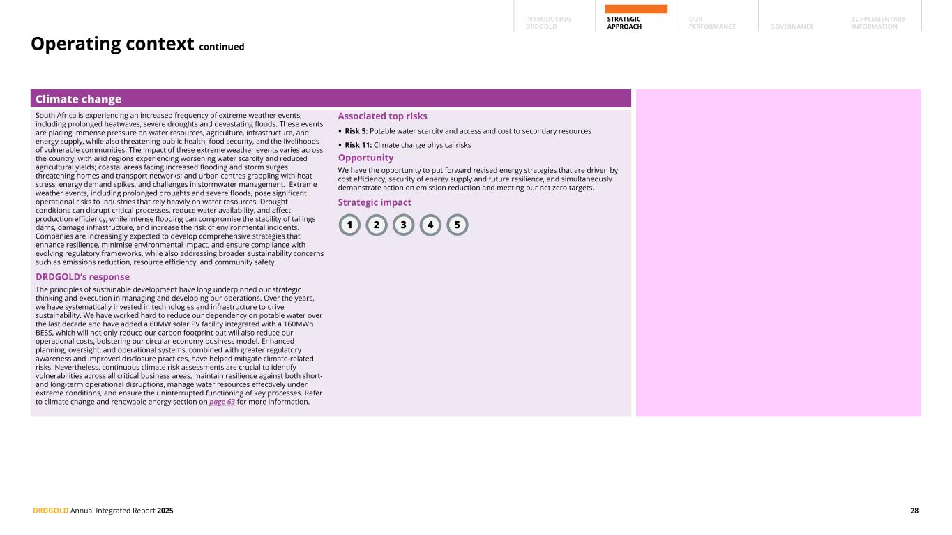 Climate change South Africa is experiencing an increased frequency of extreme weather events, including prolonged heatwaves, severe droughts and devastating floods. These events are placing immense pressure on water resources, agriculture, infrastructure, and energy supply, while also threatening public health, food security, and the livelihoods of vulnerable communities. The impact of these extreme weather events varies across the country, with arid regions experiencing worsening water scarcity and reduced agricultural yields; coastal areas facing increased flooding and storm surges threatening homes and transport networks; and urban centres grappling with heat stress, energy demand spikes, and challenges in stormwater management. Extreme weather events, including prolonged droughts and severe floods, pose significant operational risks to industries that rely heavily on water resources. Drought conditions can disrupt critical processes, reduce water availability, and affect production efficiency, while intense flooding can compromise the stability of tailings dams, damage infrastructure, and increase the risk of environmental incidents. Companies are increasingly expected to develop comprehensive strategies that enhance resilience, minimise environmental impact, and ensure compliance with evolving regulatory frameworks, while also addressing broader sustainability concerns such as emissions reduction, resource efficiency, and community safety. DRDGOLD’s response The principles of sustainable development have long underpinned our strategic thinking and execution in managing and developing our operations. Over the years, we have systematically invested in technologies and infrastructure to drive sustainability. We have worked hard to reduce our dependency on potable water over the last decade and have added a 60MW solar PV facility integrated with a 160MWh BESS, which will not only reduce our carbon footprint but will also reduce our operational costs, bolstering our circular economy business model. Enhanced planning, oversight, and operational systems, combined with greater regulatory awareness and improved disclosure practices, have helped mitigate climate-related risks. Nevertheless, continuous climate risk assessments are crucial to identify vulnerabilities across all critical business areas, maintain resilience against both short- and long-term operational disruptions, manage water resources effectively under extreme conditions, and ensure the uninterrupted functioning of key processes. Refer to climate change and renewable energy section on page 63 for more information. Associated top risks • Risk 5: Potable water scarcity and access and cost to secondary resources • Risk 11: Climate change physical risks Opportunity We have the opportunity to put forward revised energy strategies that are driven by cost efficiency, security of energy supply and future resilience, and simultaneously demonstrate action on emission reduction and meeting our net zero targets. Strategic impact INTRODUCING DRDGOLD STRATEGIC APPROACH OUR PERFORMANCE GOVERNANCE SUPPLEMENTARY INFORMATION Operating context continued DRDGOLD Annual Integrated Report 2025 28 1 2 3 4 5