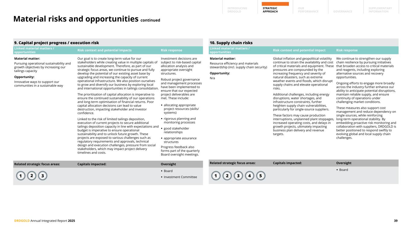 9. Capital project progress / execution risk Linked material matters / opportunities Risk context and potential impacts Risk response Material matter: Pursuing operational sustainability and growth objectives by increasing our tailings capacity Opportunity: Innovative ways to support our communities in a sustainable way Our goal is to create long-term value for our stakeholders while creating value in multiple capitals of sustainable development. Therefore, as part of our strategic focus areas, we continue to pursue and fully develop the potential of our existing asset base by upgrading and increasing the capacity of current operational infrastructure. We also position ourselves to grow and diversify our business by exploring local and international opportunities in tailings consolidation. The prioritisation of capital allocation is imperative to ensure the continued sustainability of our operations and long-term optimisation of financial returns. Poor capital allocation decisions can lead to value destruction, impacting stakeholder and investor confidence. Linked to the risk of limited tailings deposition, execution of current projects to secure additional tailings deposition capacity in line with expectations and budget is imperative to ensure operational sustainability and to unlock future growth. These projects are exposed to various challenges such as regulatory requirements and approvals, technical design and execution challenges, pressure from social stakeholders, which may impact project delivery timelines and costs. Investment decisions are subject to risk-based capital allocation analysis and appropriate oversight structures. Robust project governance and management processes have been implemented to ensure that our expected project deliverables are met. These include: • allocating appropriate project resources (skills/ systems) • rigorous planning and monitoring processes • good stakeholder relationships • appropriate assurance structures Progress feedback also forms part of the quarterly Board oversight meetings. Related strategic focus areas: Capitals impacted: Oversight • Board • Investment Committee 10. Supply chain risks Linked material matters / opportunities Risk context and potential impact Risk response Material matter: Resource efficiency and materials stewardship (incl. supply chain security) Opportunity: N/a Global inflation and geopolitical volatility continue to strain the availability and cost of critical materials and equipment. These pressures are compounded by the increasing frequency and severity of natural disasters, such as extreme weather events and floods, which disrupt supply chains and elevate operational risks. Additional challenges, including energy disruptions, water shortages, and infrastructure constraints, further heighten supply chain vulnerabilities, particularly for single-source suppliers. These factors may cause production interruptions, unplanned plant stoppages, increased operating costs, and delays in growth projects, ultimately impacting business plan delivery and revenue targets. We continue to strengthen our supply chain resilience by pursuing initiatives that broaden access to critical materials and reagents, including exploring alternative sources and recovery opportunities. Ongoing efforts to engage more broadly across the industry further enhance our ability to anticipate potential disruptions, maintain reliable supply, and ensure continuity of operations under challenging market conditions. These measures also support cost management and reduce dependency on single sources, while reinforcing long-term operational stability. By embedding proactive risk monitoring and collaboration with suppliers, DRDGOLD is better positioned to respond swiftly to evolving global and local supply chain challenges. Related strategic focus areas: Capitals impacted: Oversight • Board INTRODUCING DRDGOLD STRATEGIC APPROACH OUR PERFORMANCE GOVERNANCE SUPPLEMENTARY INFORMATION Material risks and opportunities continued DRDGOLD Annual Integrated Report 2025 39 1 2 13 432 5