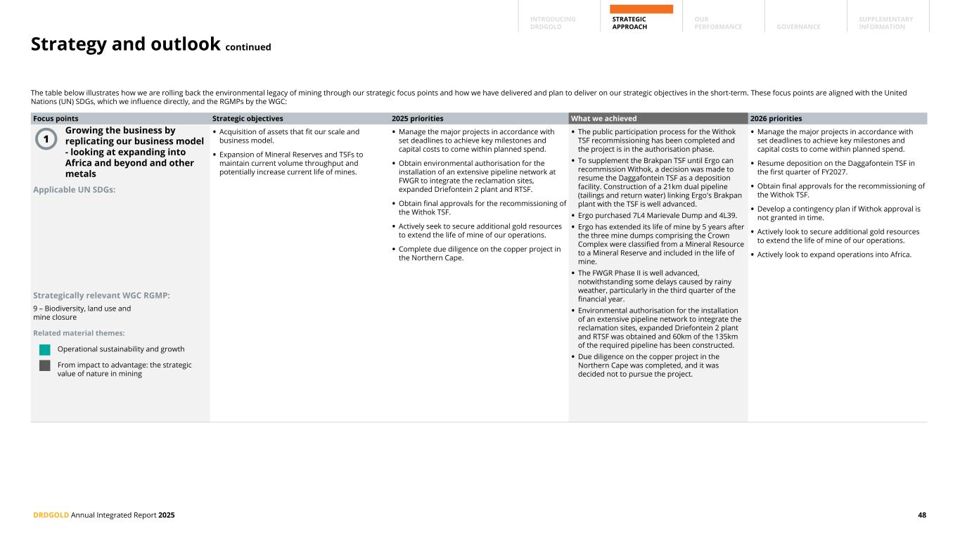 The table below illustrates how we are rolling back the environmental legacy of mining through our strategic focus points and how we have delivered and plan to deliver on our strategic objectives in the short-term. These focus points are aligned with the United Nations (UN) SDGs, which we influence directly, and the RGMPs by the WGC: Focus points Strategic objectives 2025 priorities What we achieved 2026 priorities Growing the business by replicating our business model - looking at expanding into Africa and beyond and other metals Applicable UN SDGs: Strategically relevant WGC RGMP: 9 – Biodiversity, land use and mine closure Related material themes: Operational sustainability and growth From impact to advantage: the strategic value of nature in mining • Acquisition of assets that fit our scale and business model. • Expansion of Mineral Reserves and TSFs to maintain current volume throughput and potentially increase current life of mines. • Manage the major projects in accordance with set deadlines to achieve key milestones and capital costs to come within planned spend. • Obtain environmental authorisation for the installation of an extensive pipeline network at FWGR to integrate the reclamation sites, expanded Driefontein 2 plant and RTSF. • Obtain final approvals for the recommissioning of the Withok TSF. • Actively seek to secure additional gold resources to extend the life of mine of our operations. • Complete due diligence on the copper project in the Northern Cape. • The public participation process for the Withok TSF recommissioning has been completed and the project is in the authorisation phase. • To supplement the Brakpan TSF until Ergo can recommission Withok, a decision was made to resume the Daggafontein TSF as a deposition facility. Construction of a 21km dual pipeline (tailings and return water) linking Ergo's Brakpan plant with the TSF is well advanced. • Ergo purchased 7L4 Marievale Dump and 4L39. • Ergo has extended its life of mine by 5 years after the three mine dumps comprising the Crown Complex were classified from a Mineral Resource to a Mineral Reserve and included in the life of mine. • The FWGR Phase II is well advanced, notwithstanding some delays caused by rainy weather, particularly in the third quarter of the financial year. • Environmental authorisation for the installation of an extensive pipeline network to integrate the reclamation sites, expanded Driefontein 2 plant and RTSF was obtained and 60km of the 135km of the required pipeline has been constructed. • Due diligence on the copper project in the Northern Cape was completed, and it was decided not to pursue the project. • Manage the major projects in accordance with set deadlines to achieve key milestones and capital costs to come within planned spend. • Resume deposition on the Daggafontein TSF in the first quarter of FY2027. • Obtain final approvals for the recommissioning of the Withok TSF. • Develop a contingency plan if Withok approval is not granted in time. • Actively look to secure additional gold resources to extend the life of mine of our operations. • Actively look to expand operations into Africa. INTRODUCING DRDGOLD STRATEGIC APPROACH OUR PERFORMANCE GOVERNANCE SUPPLEMENTARY INFORMATION Strategy and outlook continued DRDGOLD Annual Integrated Report 2025 48 1