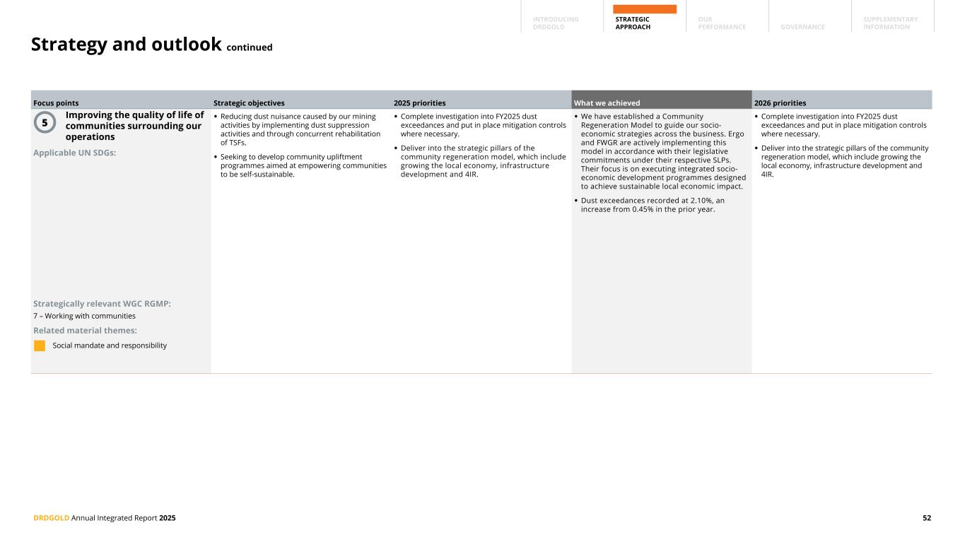 Focus points Strategic objectives 2025 priorities What we achieved 2026 priorities Improving the quality of life of communities surrounding our operations Applicable UN SDGs: Strategically relevant WGC RGMP: 7 – Working with communities Related material themes: Social mandate and responsibility • Reducing dust nuisance caused by our mining activities by implementing dust suppression activities and through concurrent rehabilitation of TSFs. • Seeking to develop community upliftment programmes aimed at empowering communities to be self-sustainable. • Complete investigation into FY2025 dust exceedances and put in place mitigation controls where necessary. • Deliver into the strategic pillars of the community regeneration model, which include growing the local economy, infrastructure development and 4IR. • We have established a Community Regeneration Model to guide our socio- economic strategies across the business. Ergo and FWGR are actively implementing this model in accordance with their legislative commitments under their respective SLPs. Their focus is on executing integrated socio- economic development programmes designed to achieve sustainable local economic impact. • Dust exceedances recorded at 2.10%, an increase from 0.45% in the prior year. • Complete investigation into FY2025 dust exceedances and put in place mitigation controls where necessary. • Deliver into the strategic pillars of the community regeneration model, which include growing the local economy, infrastructure development and 4IR. INTRODUCING DRDGOLD STRATEGIC APPROACH OUR PERFORMANCE GOVERNANCE SUPPLEMENTARY INFORMATION Strategy and outlook continued DRDGOLD Annual Integrated Report 2025 52 5